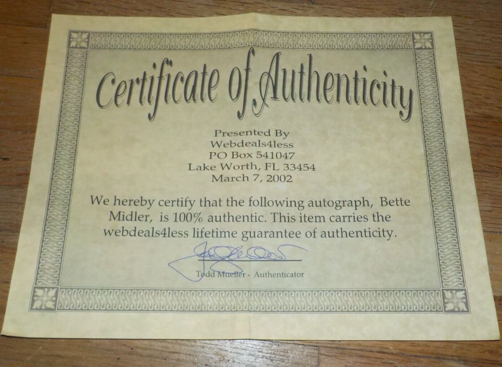 Bette Midler signed photo, 8" x 10", COA