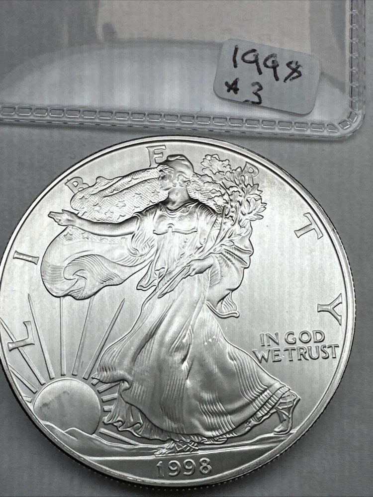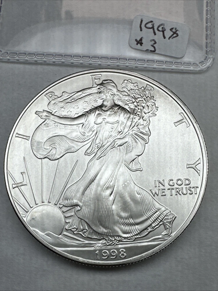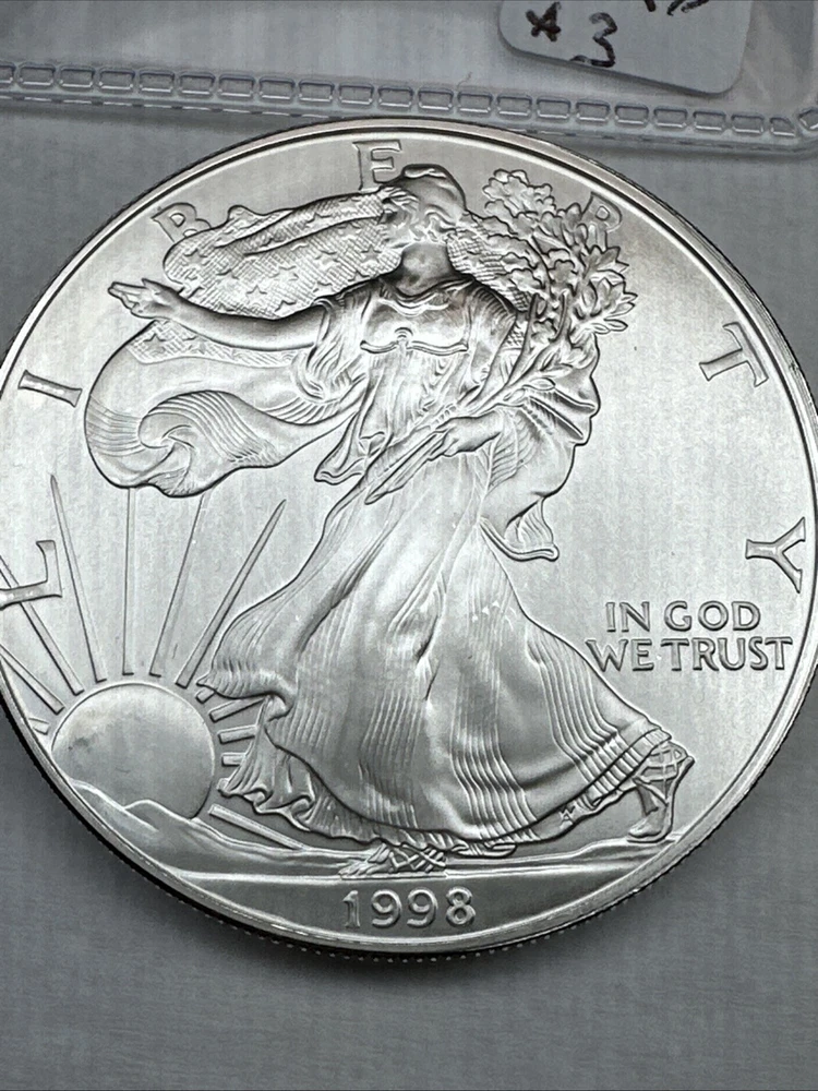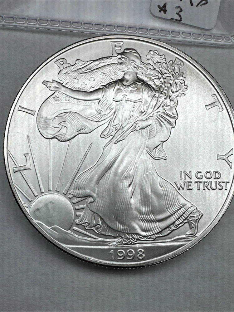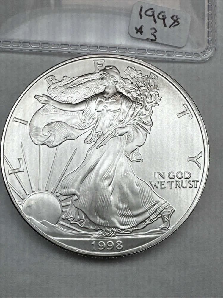 This is a 1998 American Silver Eagle coin, minted by the U.S. Mint in Philadelphia. It contains 1 troy ounce of .999 fine silver and has a denomination of $1. The coin is uncirculated and has not been certified. This particular date is considered a better date for collectors.