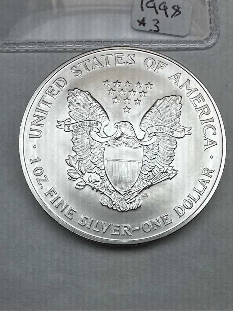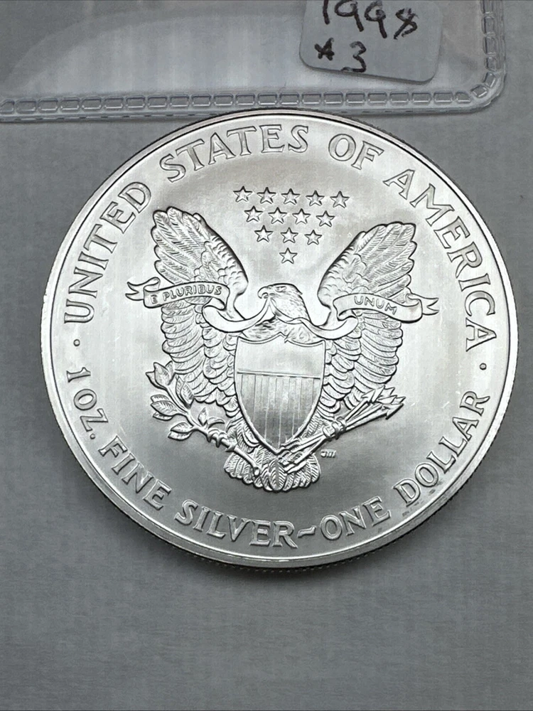 Total Precious Metal Content: 1oz Composition: Silver Denomination: $1 Strike Type: Business Circulated/Uncirculated: Uncirculated Mint Location: Philadelphia Certification: Uncertified Country/Region of Manufacture: United States Precious Metal Content per Unit: 1 oz Brand/Mint: U.S. Mint Coin: American Eagle Grade: Ungraded Fineness: 0.999 Year: 1998