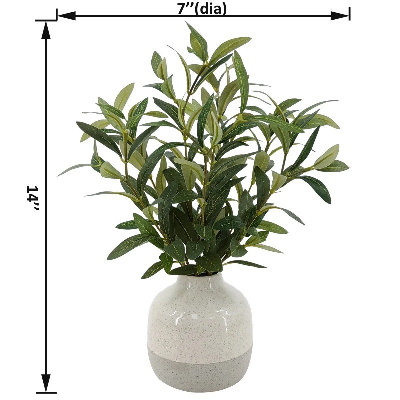 You’ll be surprised at the realism of Better Homes & Gardens 14” Artificial Olive Plant in a striking two-tone Ceramic Vase. No need to spend time arranging it—it’s ready to place on a coffee table, shelf, side table or bathroom in your home, office or dorm. This faux Olive Plant is perfect for adding a charming accent any time of the year. After all, it’s inspired by nature and crafted in long-lasting materials to bring a fresh accent you’ll enjoy for years to come. Material: 100% Polyester Care: Wipe clean with dry or damp cloth Country of Origin: Imported Type: Artificial olive plant Dimensions: Plant: 14"H x 7"d x 7"W Weight: 1.03 lb. Container: Two-tone ceramic Features: Compact design for desktops, windowsills, tabletop decor, UV-resistant Note: For indoor decorative use only