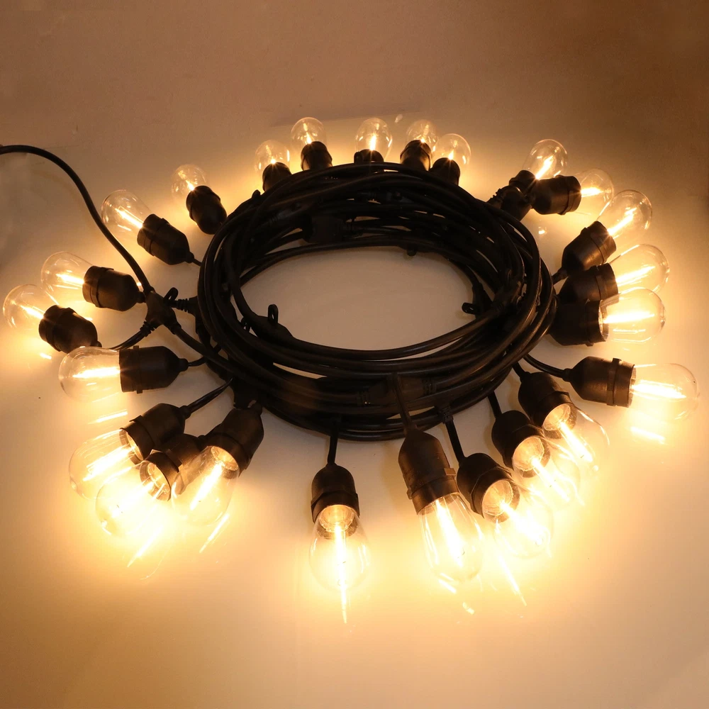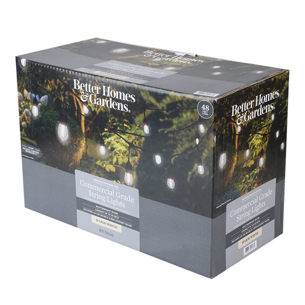 Brighten your outdoor living space with the Better Homes & Gardens 48-foot 24-count Shatterproof Bulb Outdoor Commercial String Light. These lights offer the perfect ambiance with just the right amount of light. This outdoor string light is composed of 24 shatterproof warm white bulbs plus two spare bulbs and uses LEDs as the light source, which has a longer lifespan and is much brighter than traditional incandescent bulbs. You can save the cost of changing the bulb frequently. This lighting string is rated 21.6 watts, do not overload. This strand has a lighted length of 46 feet, a total length of 48 feet, and can be connected to up to 20 sets of this exact light strand. With 2ft equal spacing among each bulb, these commercial style lights is an excellent addition to your home, restaurants, special events, etc. to decorate your bistro, deck, patio, pergola, porch, backyard party, gazebo, garden, wedding. This Better Homes & Gardens 48-foot 24-count Shatterproof Bulb Outdoor Commercial String Light is perfect for both indoor and outdoor atmosphere. On Dec 12, 2024 at 19:11:21 PST, seller added the following information: