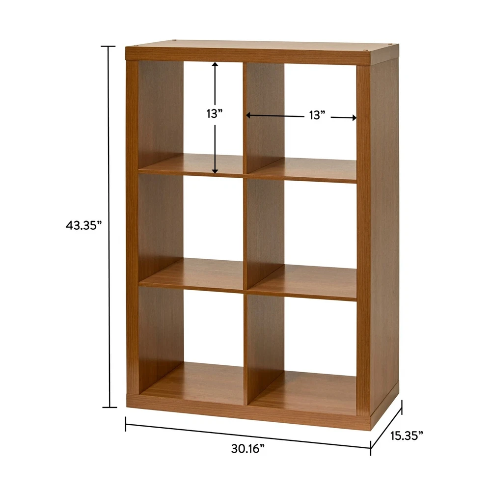 Better Homes & Gardens 6-Cube Storage Organizer Modern Open-Back Design : Allows for easy cord management Storage Capacity : Six 13" x 15" x 13" compartments Compatible : Works with Better Homes & Gardens Cube Storage Bins (sold separately) Versatile Placement : Can be positioned vertically or horizontally Weight Capacity : Top panel supports up to 100 lbs Each cube holds up to 51 lbs Expandable : Can be combined with other Better Homes & Gardens Cube Storage Organizers Material : MDF, particle board, paperboard, and iron Safety Feature : Attaches to the wall with included safety strap Easy Assembly : Includes instructions (hammer & Phillips head screwdriver required) Dimensions & Weight: Package Size : 44.49" x 9.25" x 18.11" (53.17 lbs) Assembled Size : 30.16" W x 15.35" D x 43.35" H Assembled Weight : 44.88 lbs