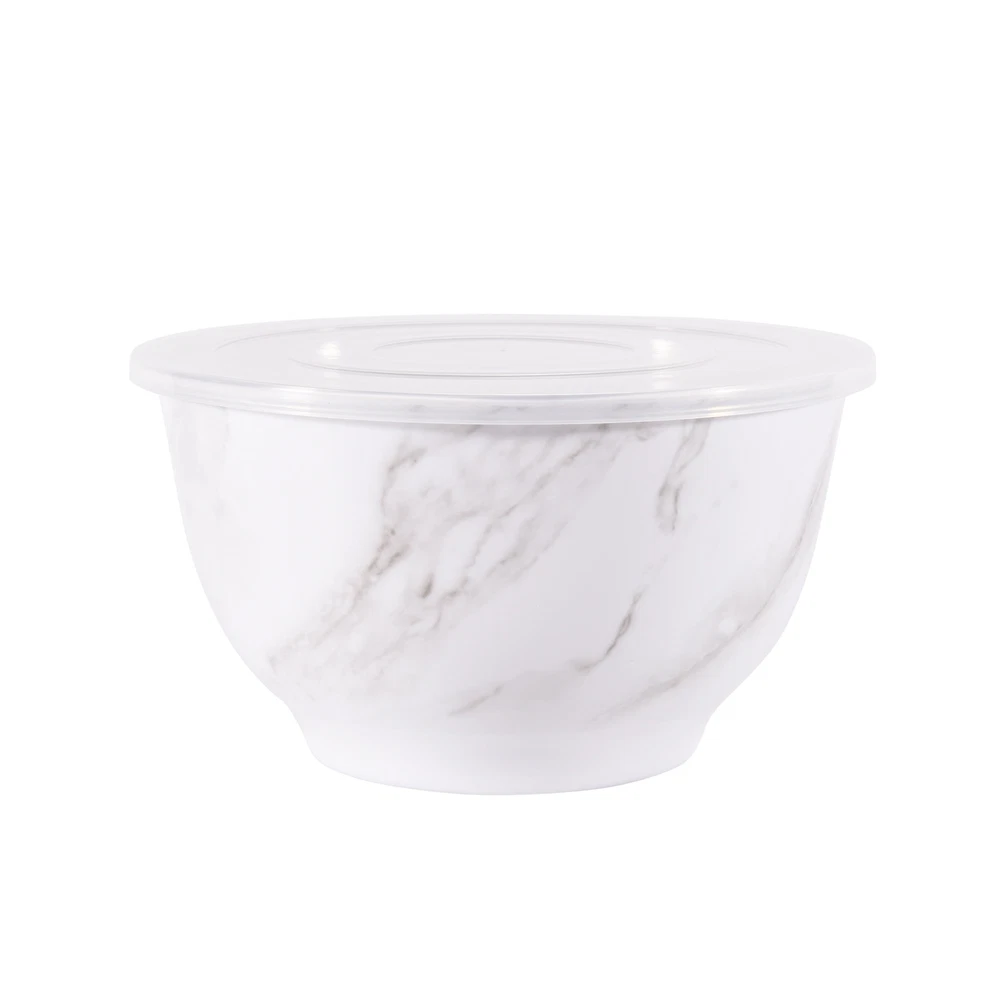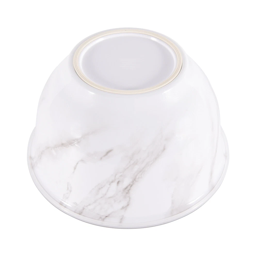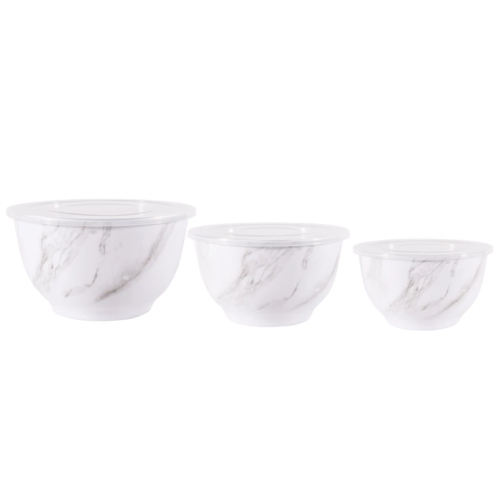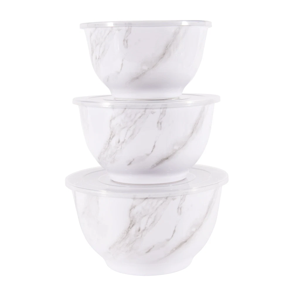 Better Homes & Gardens brand is one of America’s most trusted sources for all things home, and where style meets savings. Their mission is to offer products that help you create a home that matches your personality and lifestyle. There are many options to choose from when it comes to creating the entertaining set that is exactly right for your home. Add style to your serve ware and dinnerware collection with the Better Homes & Gardens 6-Piece Melamine Serving Bowl Set with Lids. Showcasing an elegant faux marble design, this round serve bowl set is sure to impress while you are entertaining or enjoying a meal at home. The beauty and sophistication of the marble design offers a functional and beautiful meal presentation to your table. Designed to mimic the look and feel of traditional ceramic, this round serve bowl set is made of BPA- free Melamine with durability to withstand drops and dishwashers. This smart kitchen staple is designed with you in mind and is sure to become a favorite. Set includes a 10.625-inch diameter bowl, 9.50-inch diameter bowl, and an 8.375-inch diameter bowl, each with lids. Each bowl is staggered in size so you will always find the right fit for your cooking or baking needs. Once you are ready to put them away, simply stack these functional bowls together. The nested design makes for convenient and compact storage which saves space in your cabinets or pantry. All 3 bowls feature a non-skid base. Made with 100% BPA Free Melamine that offers lightweight durability and versatility, this serve bowl set is perfect for everyday functionality and is great for all your entertaining needs. The Melamine Bowl Set with Lids is made from durable melamine that is shatter and impact resistant, making it ideal for family gatherings, indoors or out. Serve pieces and dinnerware in our contemporary styles help you achieve a look that is both chic and warm. Look for additional colors and prints available for purchase. Chic modern style brings a touch of elegance to your tabletop Durable Melamine Serving Bowl Set is ideal for indoor and outdoor, everyday use Dishwasher safe for convenient cleaning Bowls Nest for Easy Store Features Non-Skid Bottom BPA Free, Scratch Resistant, Shatter Resistant, Odor Resistant Material Content: 100% Melamine Set Includes: 1 Large Bowl with Lid, 1 Medium Bowl with Lid, 1 Small Bowl with Lid Dimensions: Large Bowl 10.625-inch Diameter by 6-inch Height, Medium Bowl 9.50-inch Diameter by 5.375-inch Height, Small Bowl 8.375-inch Diameter by 4.75-Inch Height Capacity: Large Bowl 5.5-Quart (5.2 L), Medium Bowl 3.9-Quart (3.6 L), Small Bowl 2.6-Quart (2.4 L) Not recommended for microwave use Shop the entire BHG Melamine Serve selection, available online and in stores