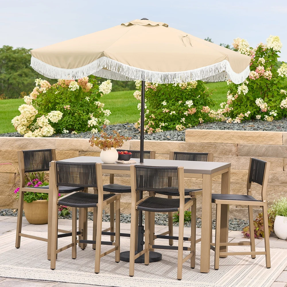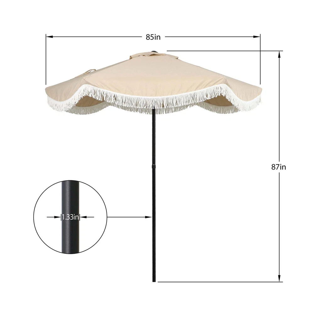 The Better Homes & Gardens outdoor 7.5 foot round market patio umbrella features a manual push-up function to open the canopy. The fade-resistant canopy is made with Scotchgard treated 50% recycled polyester fabric and a powder coated steel frame. For use either through a table with a 26lb base or freestanding with a 75 lb. base. Please insure you always use an umbrella base to secure your umbrella and close when not in use to prevent damage. Push the umbrella upward for easy opening Does Not Tilt Fabric made from fade-resistant 50% recycled polyester fabric Durable and strong powder-coated steel frame and 6 steel ribs helps extend the life of the umbrella Steel safety pole protects fingers from being pinched Supplies enough coverage for a 4 person table Can be used either through a table with a 26lb base or freestanding with a 75lb base Base not included Care: Spot clean with mild soap and water, do not bleach Overall dimension: 90.5" x 86.6" x 86.6" (L x W x H) Product weight:10 lbs On Feb 18, 2025 at 19:59:35 PST, seller added the following information: