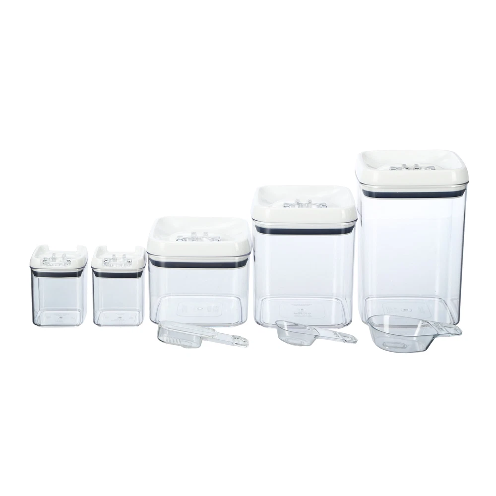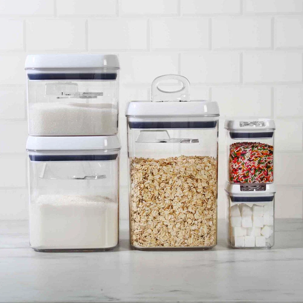 Keep your baking essentials organized and fresh with the Better Homes & Gardens Flip-Tite® Baking Storage Containers, featuring a handy scoop accessory that can be conveniently stored under the lid. These versatile containers are perfect for storing flour, sugar, baking confetti, and other dry goods in your kitchen or pantry. Made without Bisphenol A (BPA), they ensure the safety of your food. The clear design allows for quick identification of contents, eliminating the need for labels. Each container features an easy-to-open flip buckle lid with a food-safe seal and is built for durability. Plus, the included scoop fits neatly under the lid, making measuring simple and efficient. For optimal use, wash all components before first use and remove the silicone seal from the lid for cleaning. The lid and seal are top-rack dishwasher safe, while the container itself is also dishwasher safe. Please avoid carrying the Flip-Tite® container by the lid, and note that it is not microwave safe. Enhance your baking experience with these practical storage solutions that keep your ingredients fresh and easily accessible! Better Homes & Garden 8 Pack Flip-Tite ® Dry Food Storage Container Set with Accessories: 5 Clear Food Storage Containers with Easy Open Lids Stackable for Space Saving Storage BPA-Free Durable Material This set contains 2 of 1.1-cup mini containers, 1 of 6.2-cup container with dusting scoop, 1 of 10.1-cup container with 1/4-TBL-scoop, 1 of 13.8-cup container with 1/2-cup scoop and 5 lids