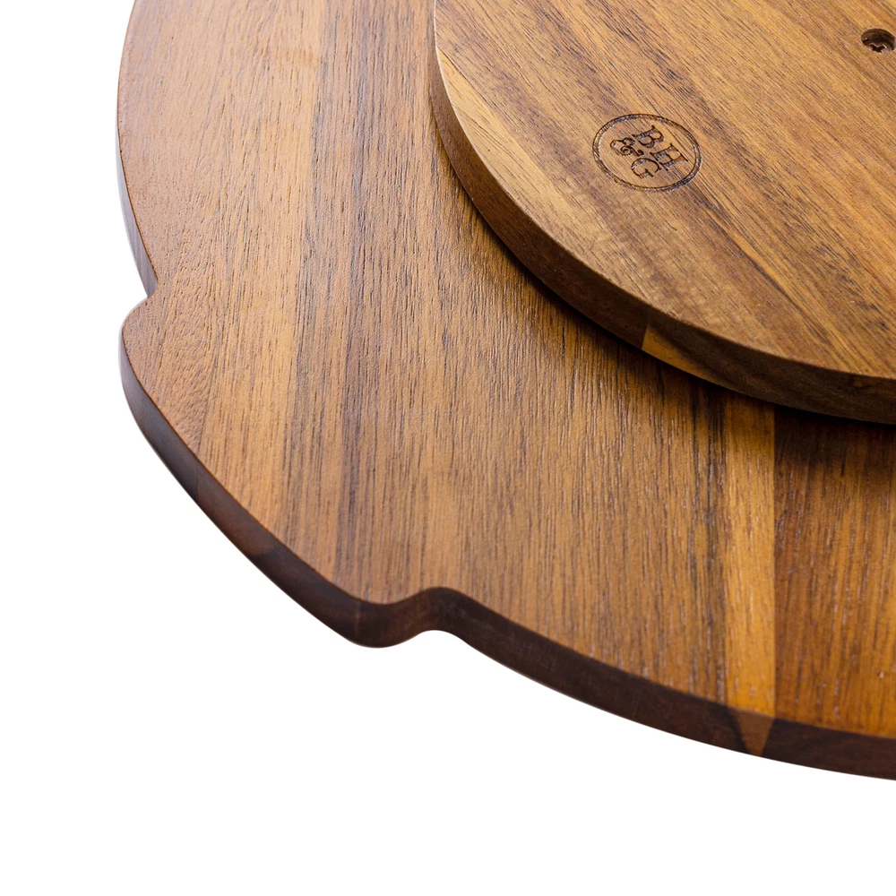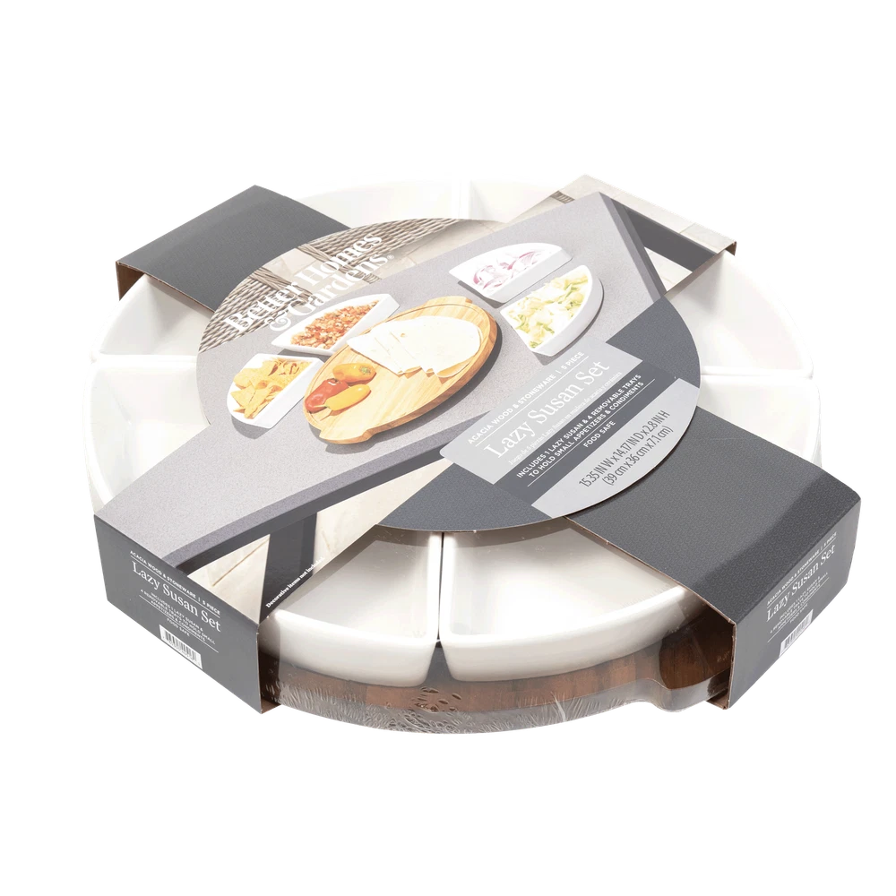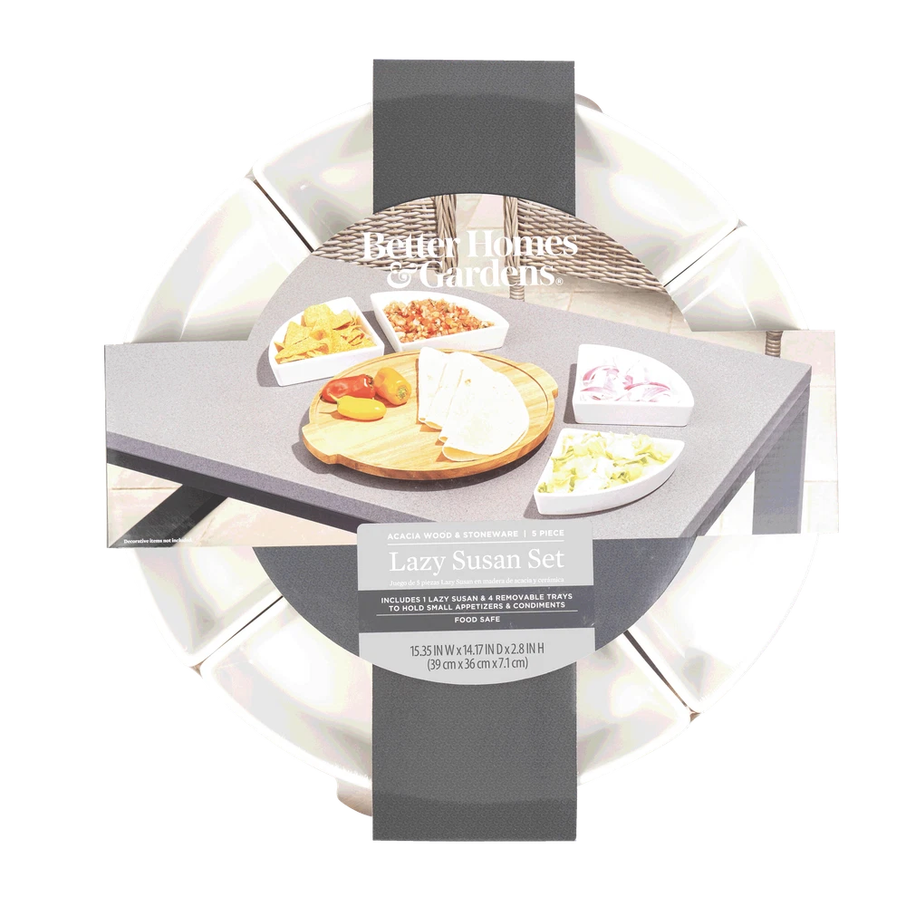 Better Homes & Gardens 5PC Lazy Susan set with Material Natural Acacia Wood Tray, Color Dark Natural Acacia Wood. Diameter 15.35*14.17*2.8 inch Ceramic Serving Tray for Snack, Nut, Fruit, Veggie, Taco - Perfect for Chips and Dip, Veggies, Candy and Snacks. This serving dish set includes 4 bowls that have carved individual space on the big round wooden tray. All of the pieces are separate, making it convenient to refill food for parties. The party host must have-There are four compartments for different types of food. You can serve chips and dip, candy, olives, nuts, fruit, veggies, and various appetizers. The colors of the food against the white bowls made for an incredible and delicious presentation. Functional design and easy to use all of the pieces are separate, making it convenient to refill food for parties. The party host must have-There are four compartments for different types of food. You can serve chips and dip, candy, olives, nuts, fruit, veggies, and various appetizers. The colors of the food against the white bowls made for an incredible and delicious presentation. Functional design and easy to use all of the pieces are separate, making it convenient to refill food for parties. You don't have to take the whole tray away from your guest to replenish. The separate compartment also makes dishwashing and storing easy. Wide application-Perfect tableware for parties like birthday parties, baby showers, Christmas, tea parties, celebrations, or any other activities decoration. And also great for catering, outdoor picnic, BBQ and simply just eating at home. Clean up easily and No stain-These ceramic party trays are cleaned up well by hand and have no residue left, no need to worry about stains. Lazy Susan set will look new after a long time of use. We use the glue blocks to keep the removable trays. It can be torn off in a whole piece. You also can try using a hair dryer on hot air, the glue blocks will tear off easily at high temperature.