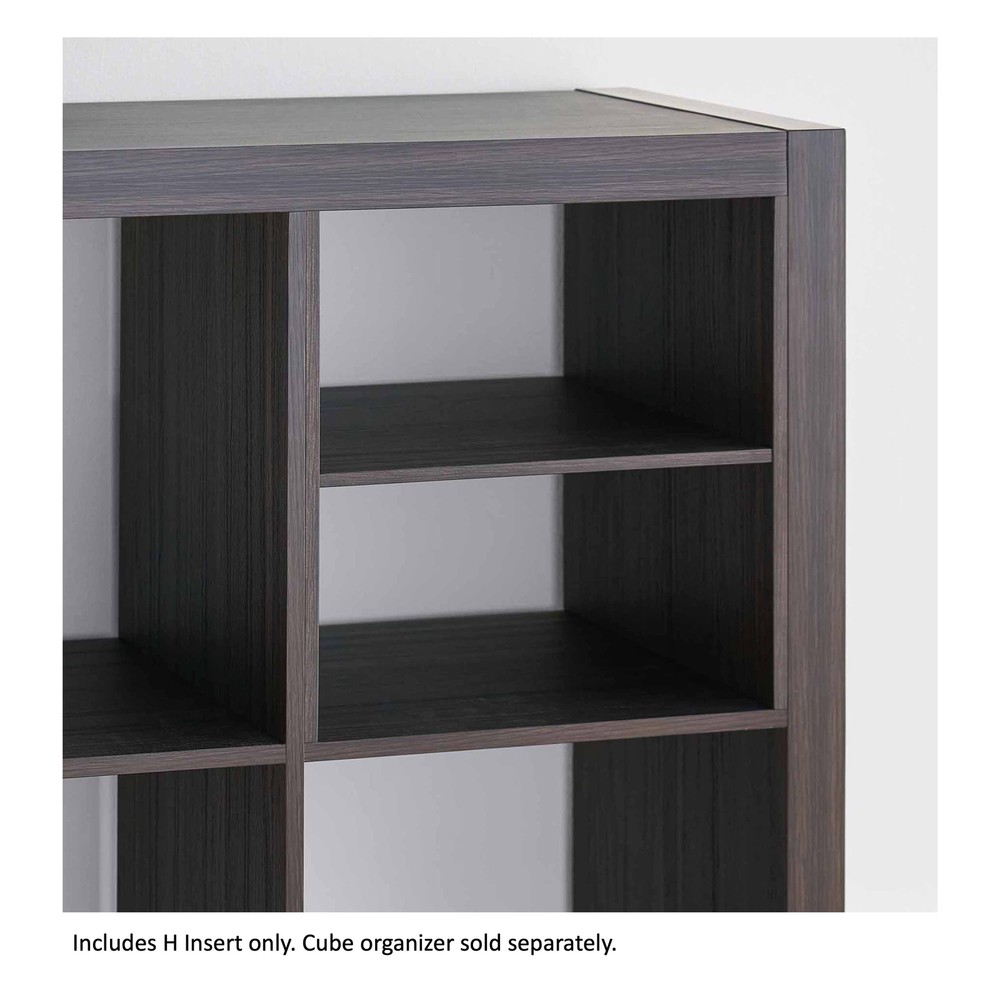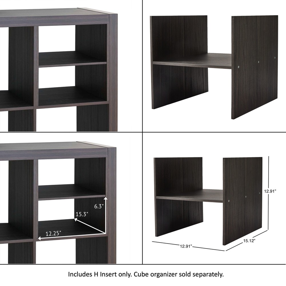 Unlock the full potential of cube storage with the Better Homes & Gardens H Shelf Cube Organizer Insert and the rest of Better Homes & Gardens’ line of cube organizer accessories and inserts. The H divider is designed to fit seamlessly into Better Homes & Gardens Cube Storage Organizer (sold separately) compartments. Effortlessly divide a cube shelf, horizontally or vertically, into two functional sections, to make the most of every inch of available space. Divides cube shelves into two separate sections for various items such as books, baskets, toys, clothes, office supplies, and more, allowing you to keep everything neatly in place Can be used to divide a cube compartment vertically or horizontally Designed to be used in Better Homes & Gardens Cube Organizers (sold separately) Shelf can easily support up to 4.4 lbs Check out the rest of the Better Homes & Gardens cube organizer accessories including the X Shelf , Quad Shelf and Bottle Storage inserts (sold separately) Materials: particle board Easy to assemble and install (Phillips head screwdriver required) Finishes available: White Texture (BH5336278612059) & Tobacco Oak (BH5336278612060) Package size: 17.91" x 1.5" x 14.69" (6.82 lbs) Assembled weight: 5.81 lbs Assembled dimensions: 12.91" W x 15.12" D x 12.91" H