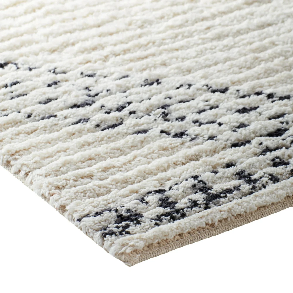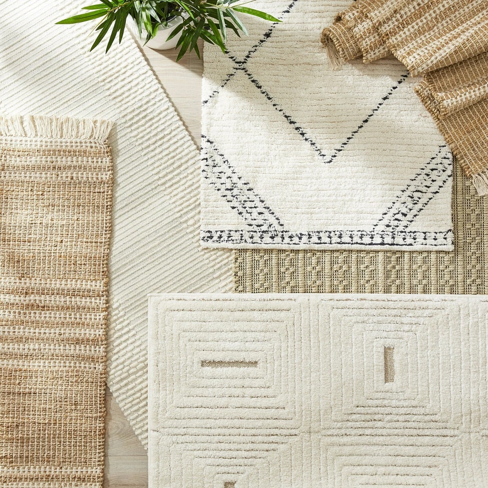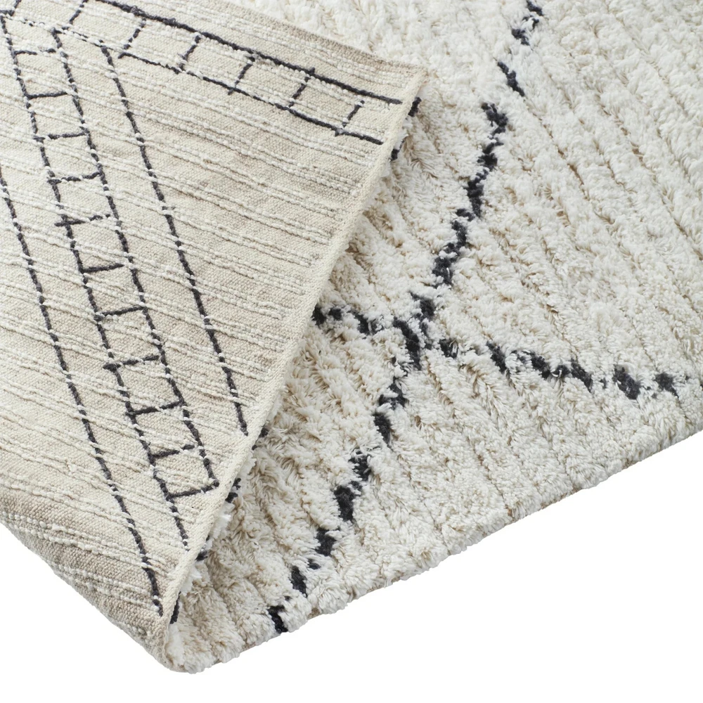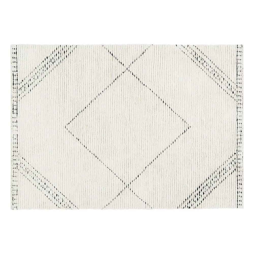 Rectangular ivory and beige indoor rug Offers a subtle yet stylish geometric print with a textured design Available in this 5' x 7' size or in your choice of a 21" x 84", 8' x 10', or 30" x 46" size Made from tufted cotton Caring for your rug is simple with quick spot cleaning Shedding of loose fibers is normal. We recommend vacuuming the rug regularly on a low-power setting with a beater brush