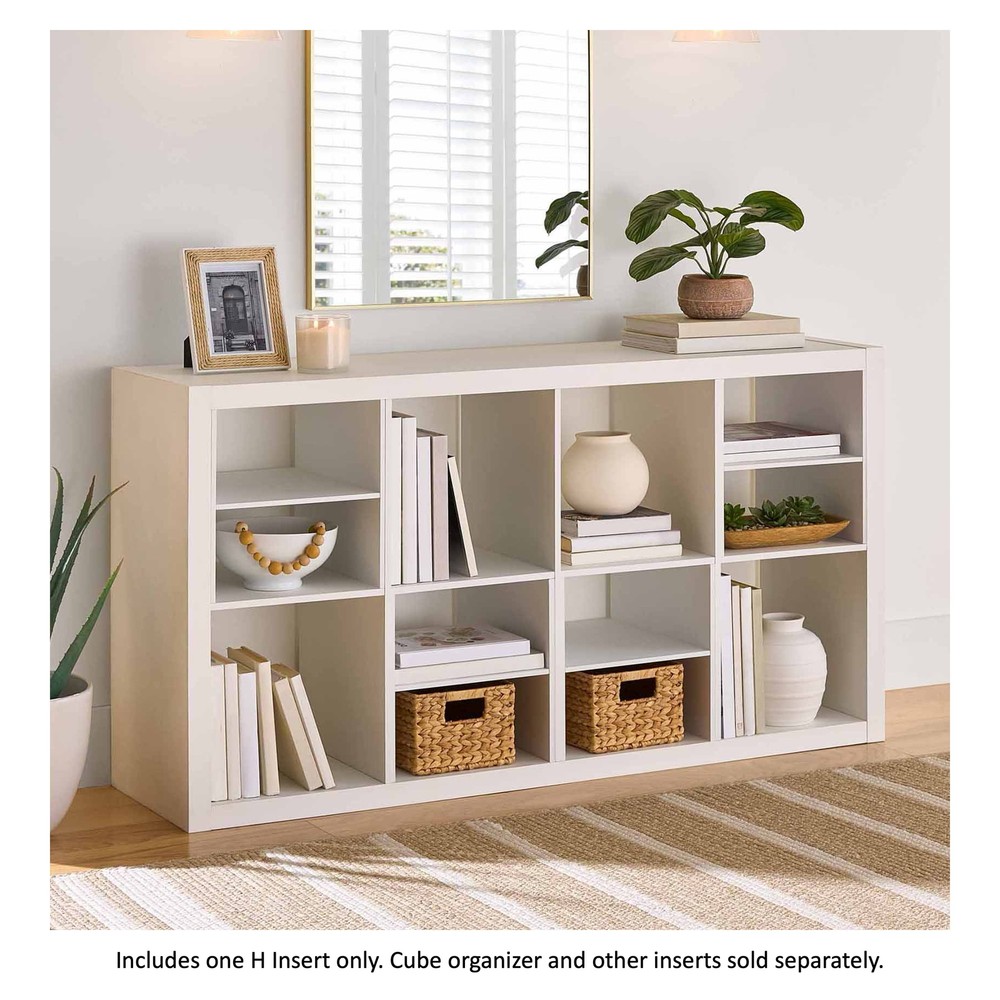 Unlock the full potential of cube storage with the Better Homes & Gardens H Shelf Cube Organizer Insert and the rest of Better Homes & Gardens’ line of cube organizer accessories and inserts. The H divider is designed to fit seamlessly into Better Homes & Gardens Cube Storage Organizer (sold separately) compartments. Effortlessly divide a cube shelf, horizontally or vertically, into two functional sections, to make the most of every inch of available space. Divides cube shelves into two separate sections for various items such as books, baskets, toys, clothes, office supplies, and more, allowing you to keep everything neatly in place Can be used to divide a cube compartment vertically or horizontally Designed to be used in Better Homes & Gardens Cube Organizers (sold separately) Shelf can easily support up to 4.4 lbs Materials: particle board Easy to assemble and install (Phillips head screwdriver required) Finishes available: White Texture (BH5336278612059) & Tobacco Oak (BH5336278612060) Package size: 17.91" x 1.5" x 14.69" (6.82 lbs) Assembled weight: 5.81 lbs Assembled dimensions: 12.91" W x 15.12" D x 12.91" H