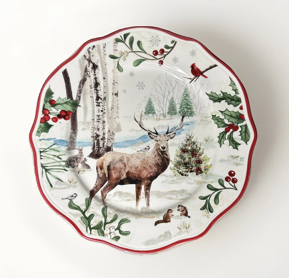 Better Homes & Gardens Winter Forest Buck Salad Plate. Approximately 8 7/8” wide. A CHIP is noticeable on the frontside red trim (no additional signs of use are noticeable). Please see photos for details.