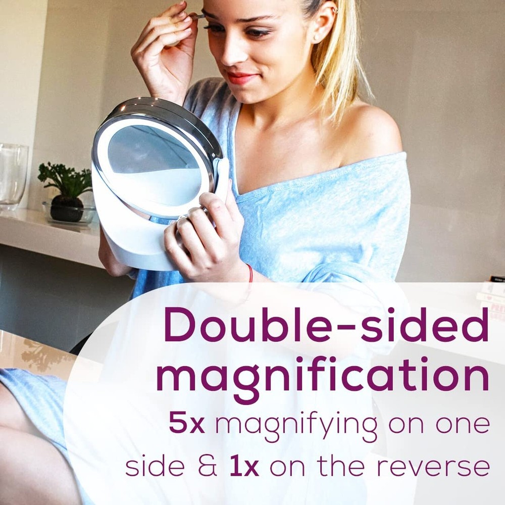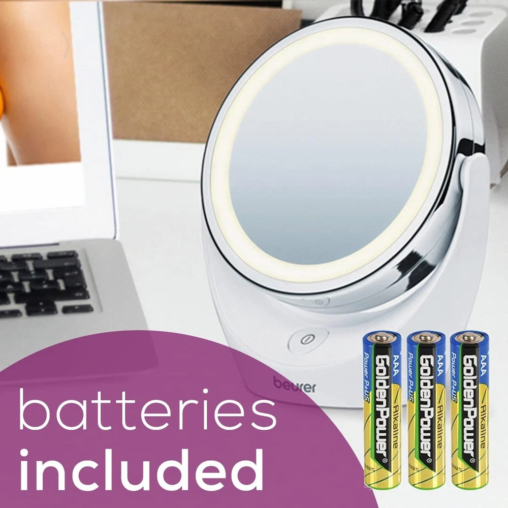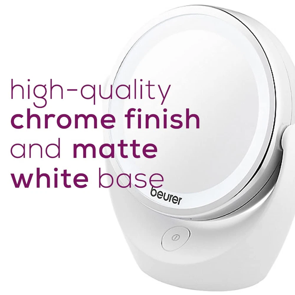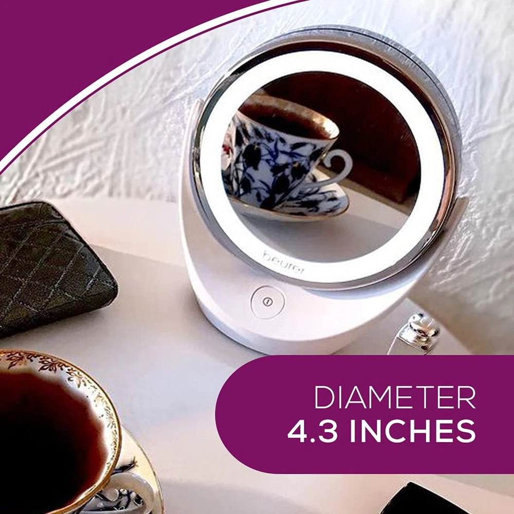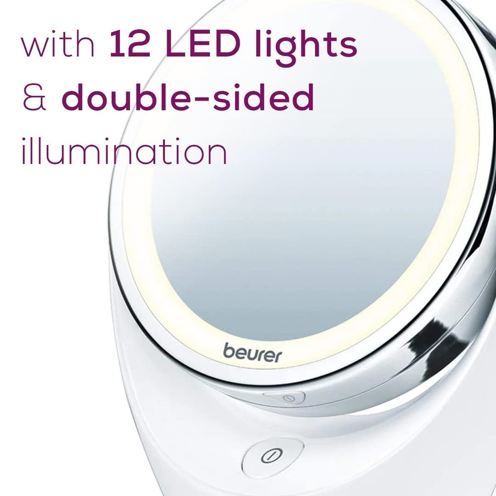 Beurer 5x Magnifying Double-Sided Cosmetic Vanity Makeup Mirror Illuminated | LED Lights | 360° Degree Swivel Rotation| Cordless | BS49 Product Details Size: Cosmetic Brand: Beurer MPN: BS49 UPC: 853879007539 EAN: 0853879007539 Brand: Beurer Room Type: Bathroom Shape: Round Product Dimensions: 6.5"L x 3.5"W Frame Material: Chrome Is Discontinued By Manufacturer : No Product Dimensions : 6.5 x 3.5 x 7.1 inches; 1 Pounds Item model number : BS49 Batteries : 3 AAA batteries required. (included) UPC : Manufacturer : Beurer Country of Origin : China FREE STANDING: The Beurer BS49 features a free standing design (no cords!) - with bright LED illuminated lights for a bright view during use. With a high quality chrome finish and matte white base. MAGNIFICATION: The mirror is double sided and on one side, features 5x magnification to help with more intricate applications, while the reverse side is at normal magnification. DOUBLE SIDED: The double sided mirror features 360 degree swiveling design so you can angle the mirror for easy viewing. LED LIGHTS: The BS49 is designed to deliver bright illumination. The mirror is features 12 LEDs (both sides) to make it easier to see applied cosmetics, or skin more clearly - batteries included. SIZE: The Beurer BS49 Illuminated Cosmetic Mirror is a stylish and practical addition to your dressing room table. The mirror's diameter is approx. 4.3 inches. WE'RE HERE FOR YOU: Our friendly Florida based team is happy to assist you with whatever questions and support you may need. That's right, our customer service is located right here in the USA! Beauty Starts with Beurer. Beauty from head to toe - even and smooth skin not only looks clear and radiant, but it also helps boost and provide you with your daily does of confidence. Support your skin care routine with the rotatable Illuminated Make-Up Mirror, the BS49 by Beurer. The mirror with extra bright LED light also has a 5x magnification. The ideal solution for a glamorous appearance with a fresh, healthy complexion. The Beurer BS49 Lighted Cosmetics Mirror is both a stylish and practical addition to your dressing table. The double sided, free standing mirror is cordless - which provides maximum portability and convenience when in use. The BS49 features a high quality chrome finish - with a white matte base. The mirror is double sided, with one side being 5x magnification, and the other being normal (1x magnification). Designed with 12 bright LED lights on both sides, the swiveling mirror helps you to see your skin more clearly - which is great for illuminating the skin whether for applying makeup or examining your skin. Poor lighting can fool you, especially when applying your makeup - which is why it is important to have bright lights integrated with you cosmetic beauty mirror. SPECIFICATIONS:Double Sided360° Swiveling5x Maginification1x Magnification (normal) Free Standing (cordless) 12 Bright LEDS (on both sides) Mirror Surface: 4.3 in diameterBatteries Included Our customer service is right here in the USA! Feel free to give us a call at +1