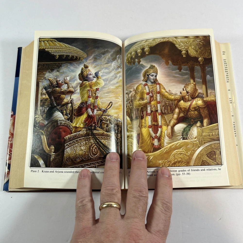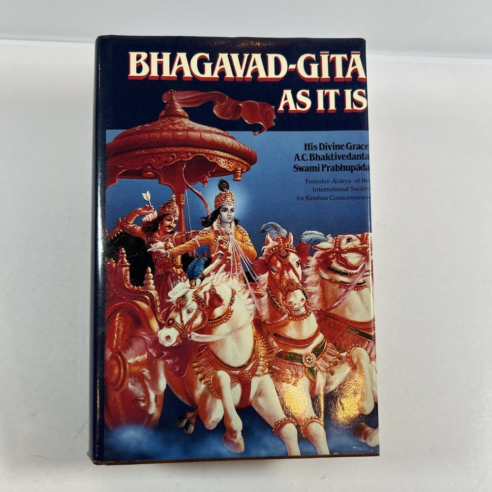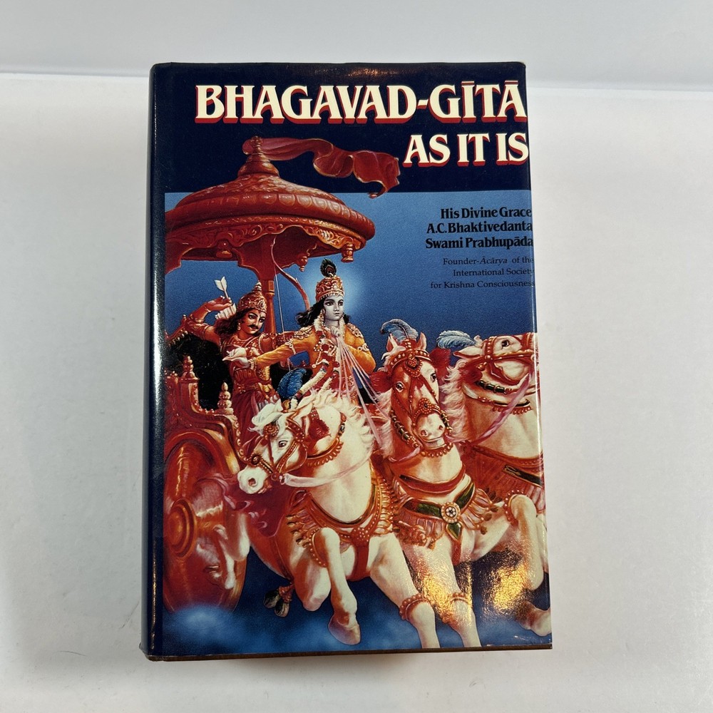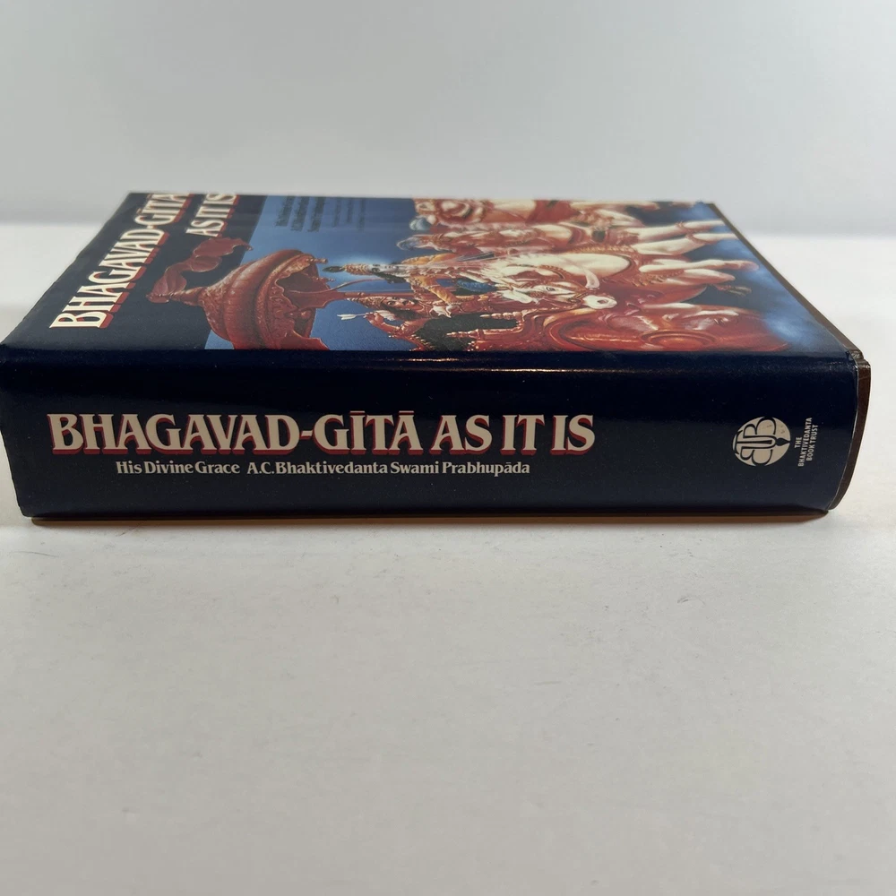 The Bhagavad-Gita As It Is 1983 hardcover vintage edition with brown gold trim is a special first print featuring illustrated plates. Published by Bhaktivedanta Book Trust, the book is a nonfiction narrative exploring comparative religion and the ancient world. Authored by His Divine Grace A.C. Bhaktivedanta Swami Prabhupada, this academic history piece offers insights into the mind, body, and spirit, making it a valuable addition to any collection for adults interested in religious texts and enlightenment.