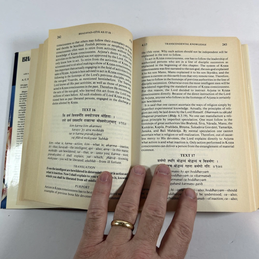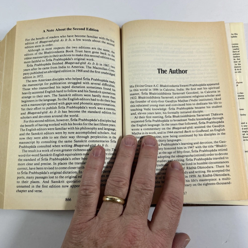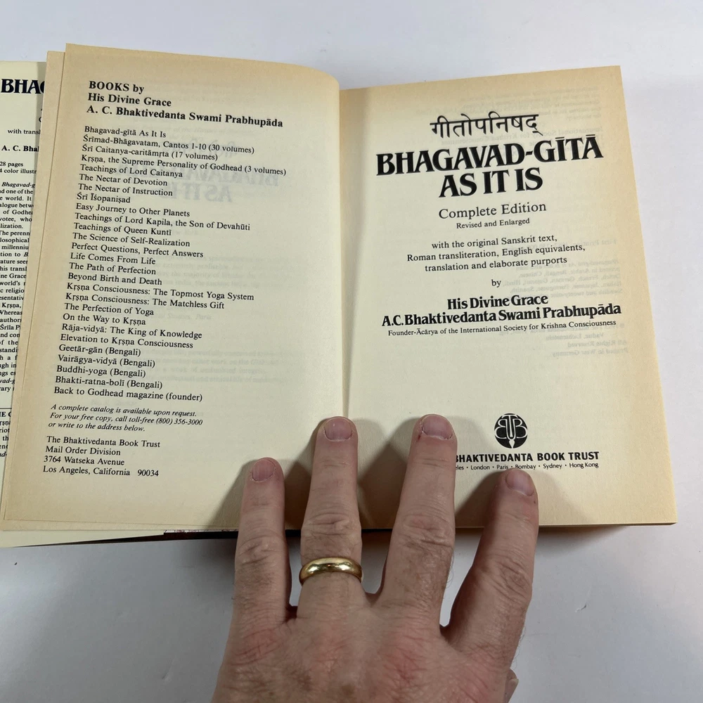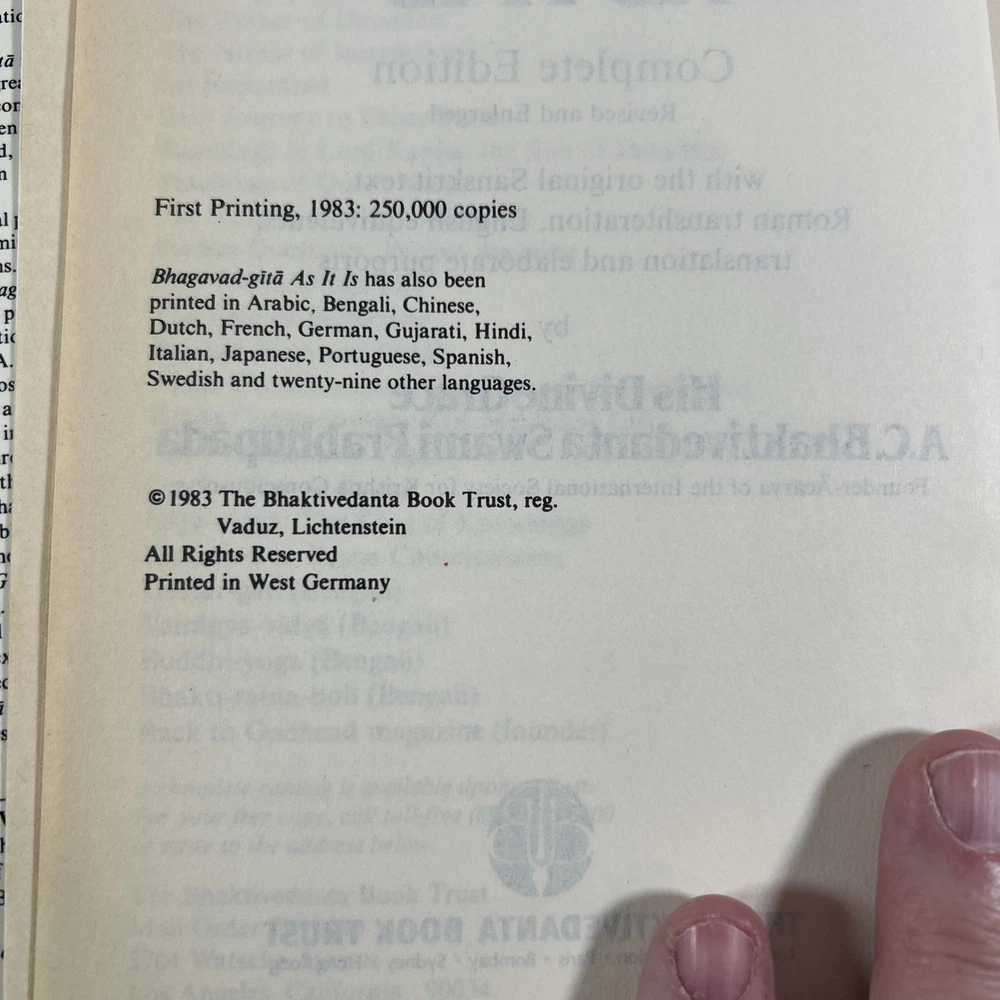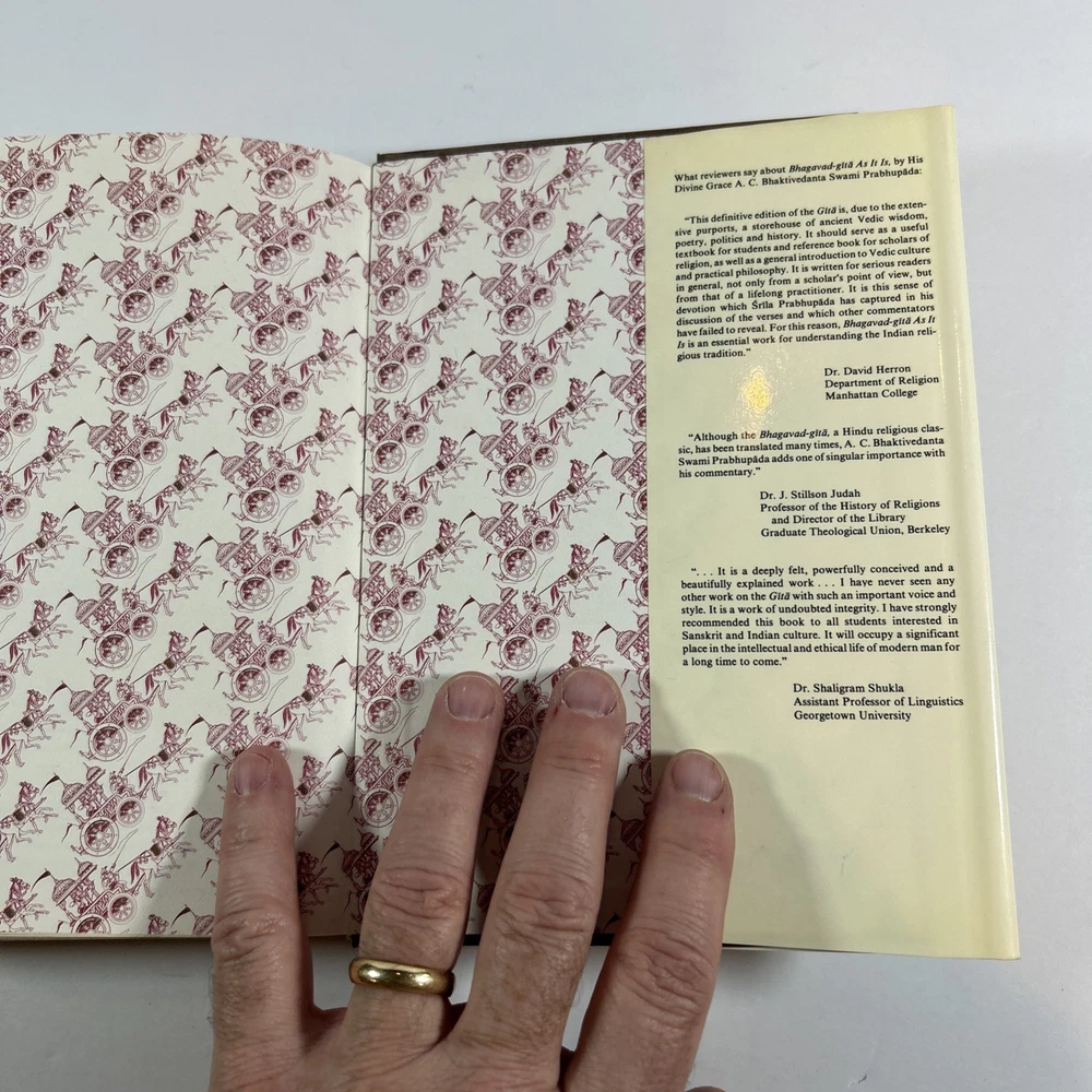 The Bhagavad-Gita As It Is 1983 hardcover vintage edition with brown gold trim is a special first print featuring illustrated plates. Published by Bhaktivedanta Book Trust, the book is a nonfiction narrative exploring comparative religion and the ancient world. Authored by His Divine Grace A.C. Bhaktivedanta Swami Prabhupada, this academic history piece offers insights into the mind, body, and spirit, making it a valuable addition to any collection for adults interested in religious texts and enlightenment.