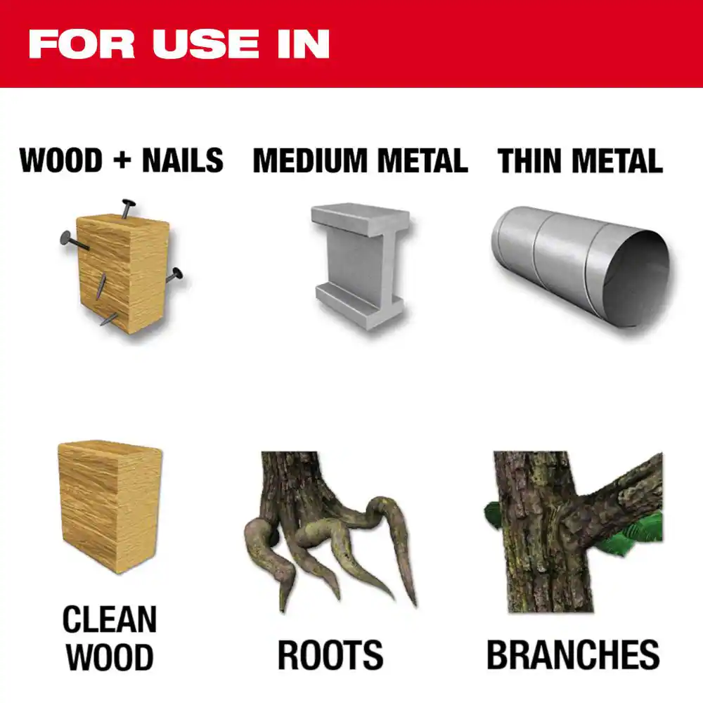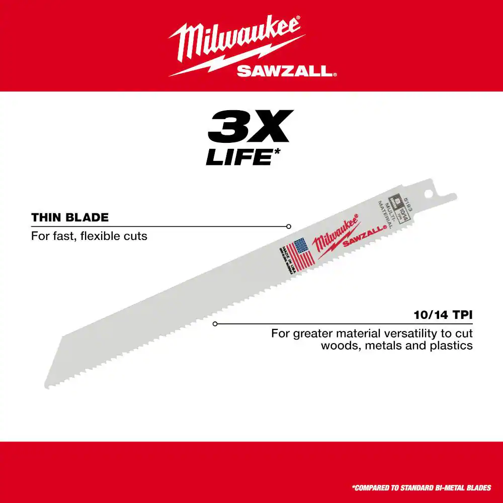 Engineered with Matrix II bi-metal teeth for greater durability Tough Neck™ ribs strengthen the blade tang & minimize breakage NAIL GUARD™ combines a 5 TPI pattern for faster cutting Get your next project done with this Milwaukee 10-Piece Sawzall Blade Set. It comes with an assortment of wood and metal cutting Sawzall blades for a wide range of applications. Offering an optimized tooth design that provides a longer life over standard bi-metal blades, they're ideal for fast, flexible cuts. An innovative, tough job site case allows convenient blade storage. Included Sawzall AX Blades with carbide teeth for pruning and cleaning wood are made for the fastest above and below ground cutting applications. Compared to carbon steel reciprocating saw blades available today, these Sawzall pruning blades give you up to 50 times more life. The AX blades feature a 3 TPI design for the fastest cutting in clean wood and a low profile blade geometry designed for root removals. When you're removing roots for trenches or stumps for tree removals, the optimized carbide teeth withstand abrasives like rock, sand and dirt. allow you to Cut longer, cut more and cut faster with this Milwaukee blade set.