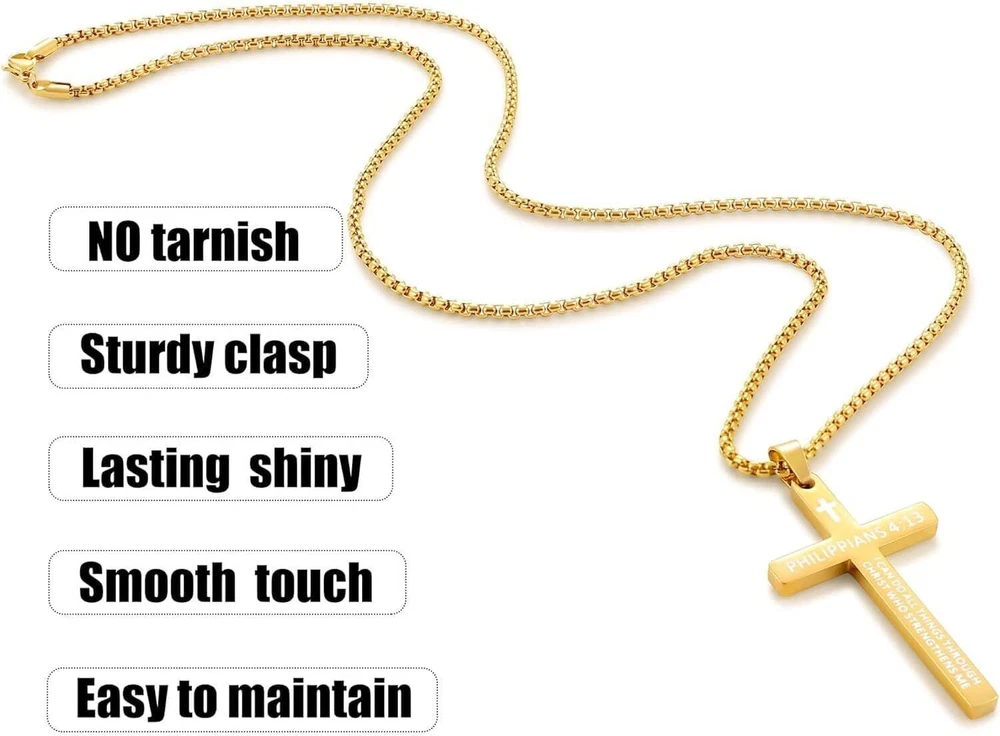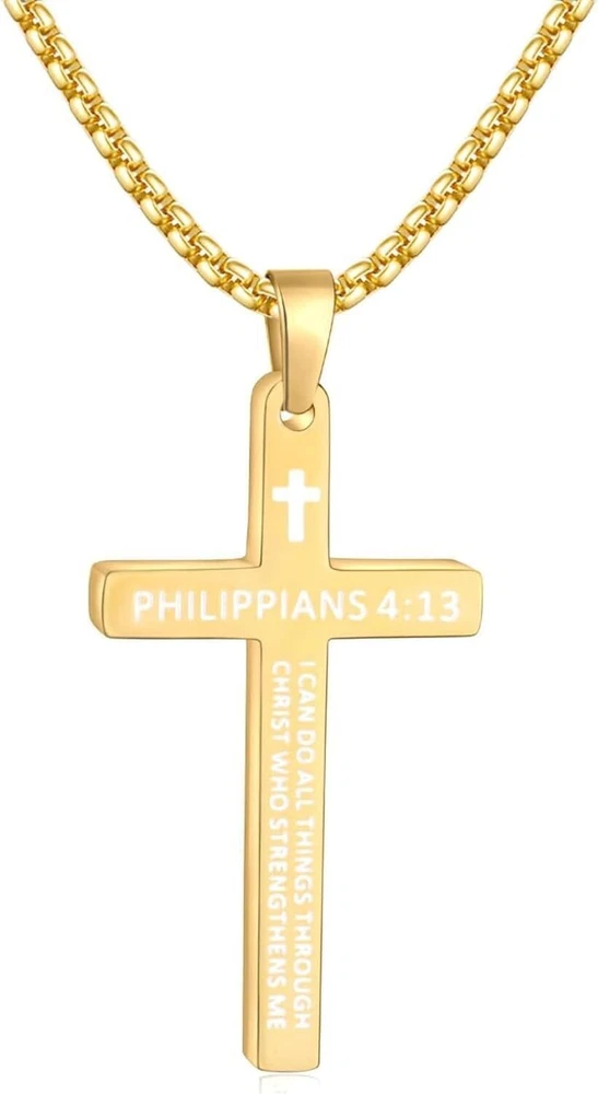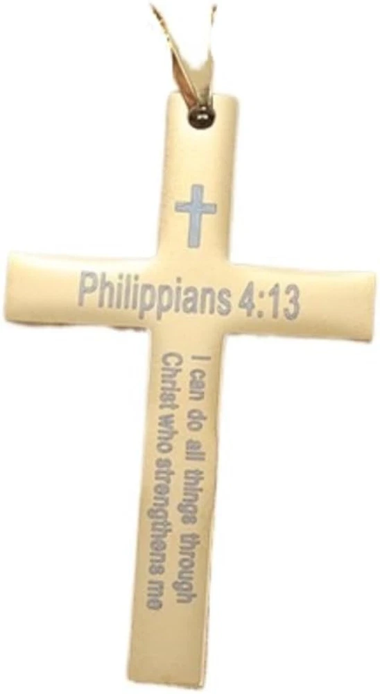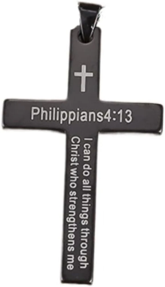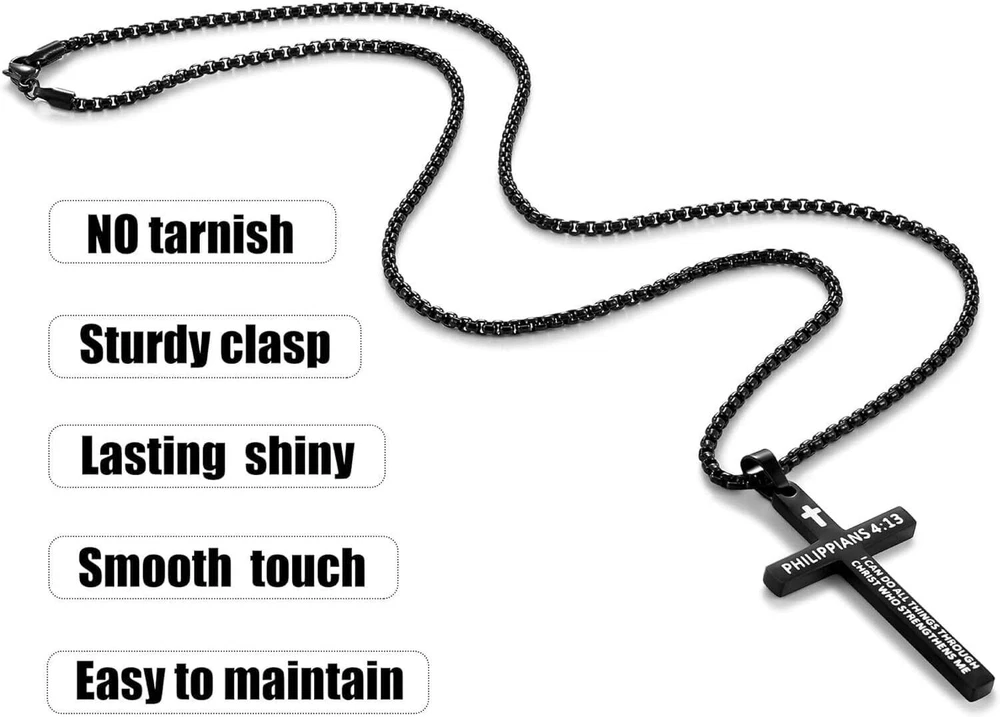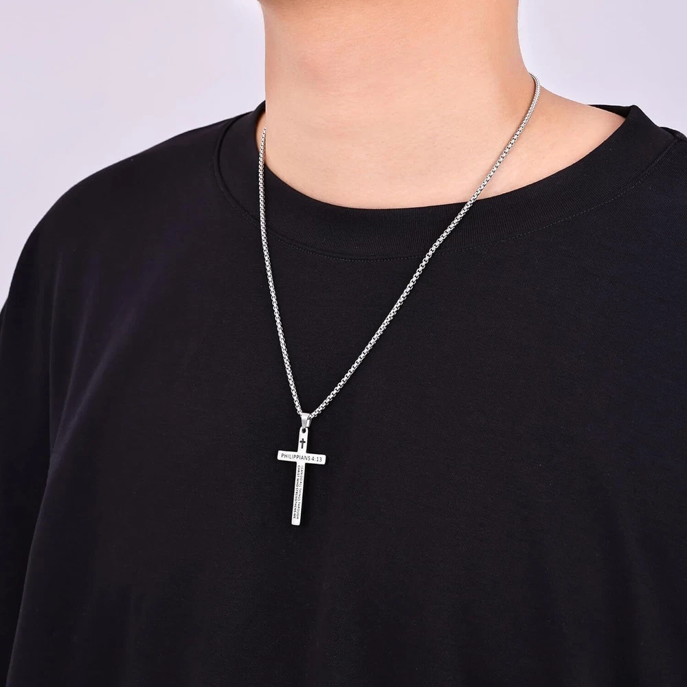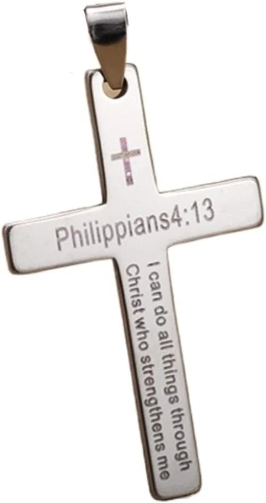 Brand : Cy trendy Give more confidence and power , Bible Verse cross necklace Bible Verse Cross Necklace for Men Give you confidence and courage High polished Smooth touch High polish makes the surface of the chains soft and smooth, bringing skin a comfortable experience Lead-free and nickel-free Hypoallergenic Lead-free and nickel-free hypoallergenic silver cross necklace for women's sensitive skin Featured stainless steel sturdiness Easy functioning clasp, robust and strong links effectively extends the chain's service life. Durability: High quality stainless steel cross chain for men with sturdy lobster clasp, stay shiny for a long time. Easy to maintain . Hypoallergenic: Lead-free, nickel-free and hypoallergenic cross necklace, comfortable for your sensitive skin . Perfect Size: Light weight 30mm*50mm Bible Verse cross pendant, 2.5mm width 24" length box necklace chain . Design: High polished cross pendant for men, engraved with the Bible Verse: PHILIPPIANS 4:13. Bible Verse Cross Necklace Give you confidence and courage . Gift for him/her: This necklace is a great gift ideas for friends, parents, sisters and brothers on birthday, anniversary, Christmas etc.. Package include : 1 necklac e