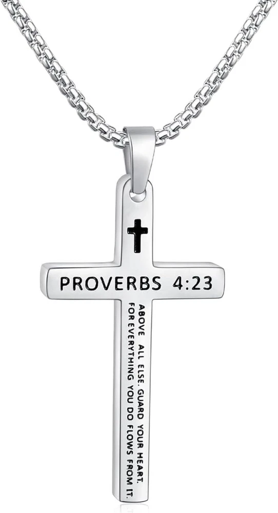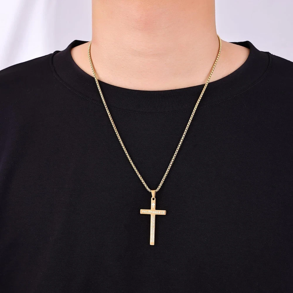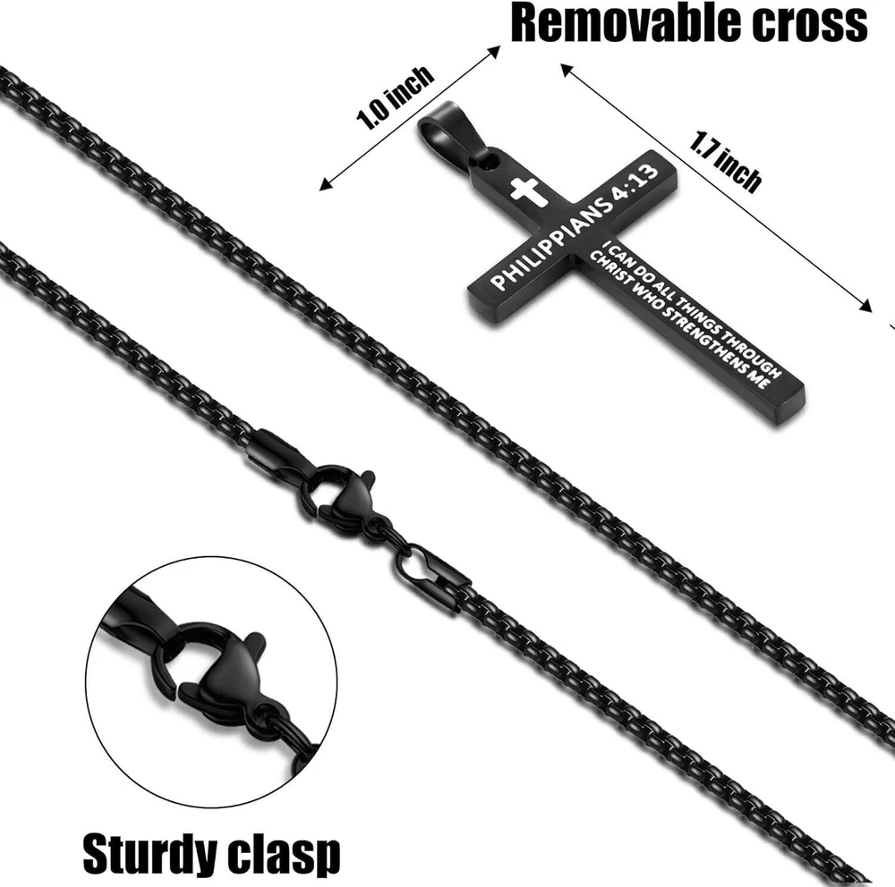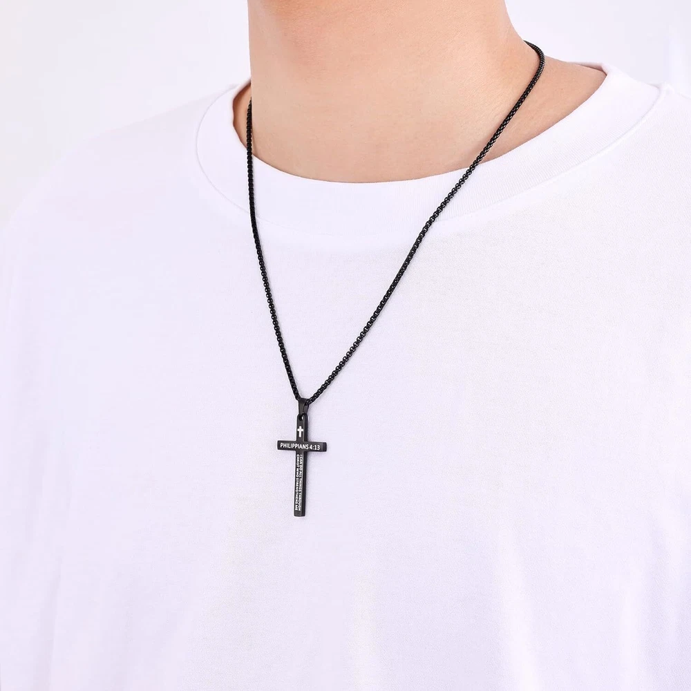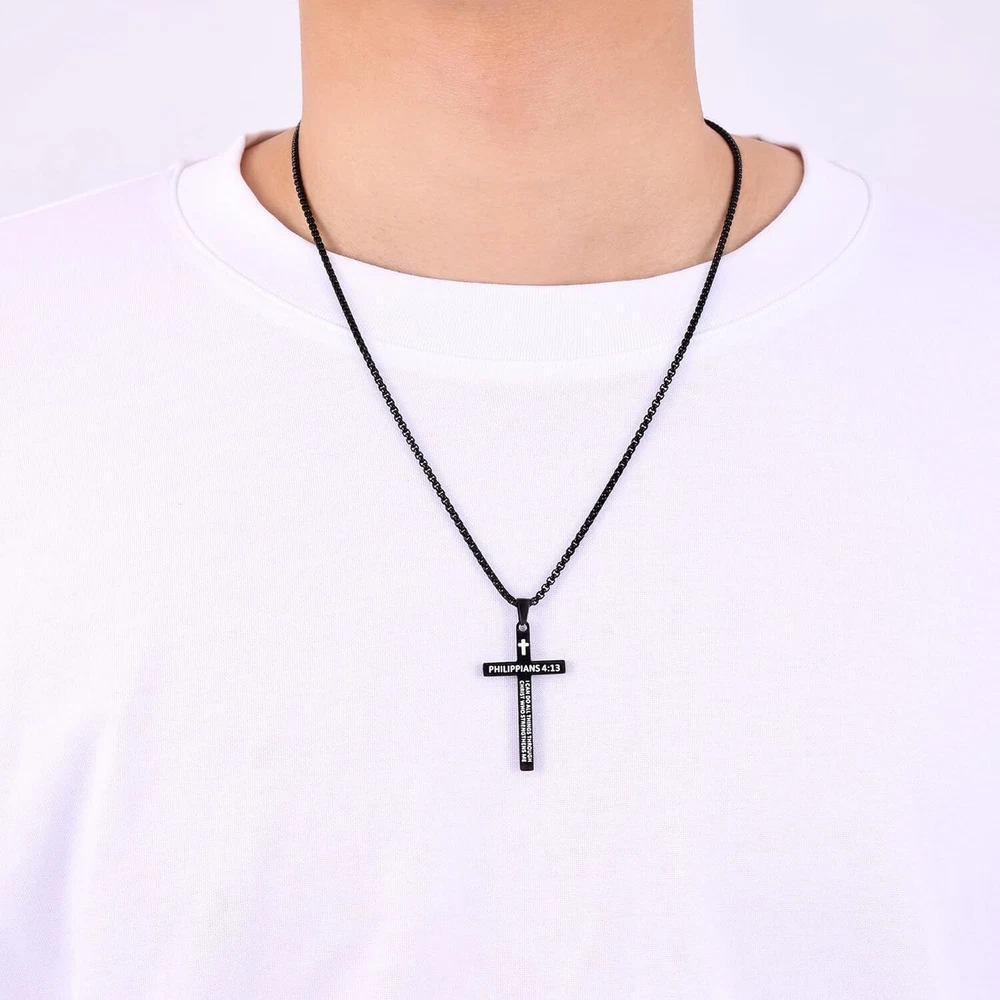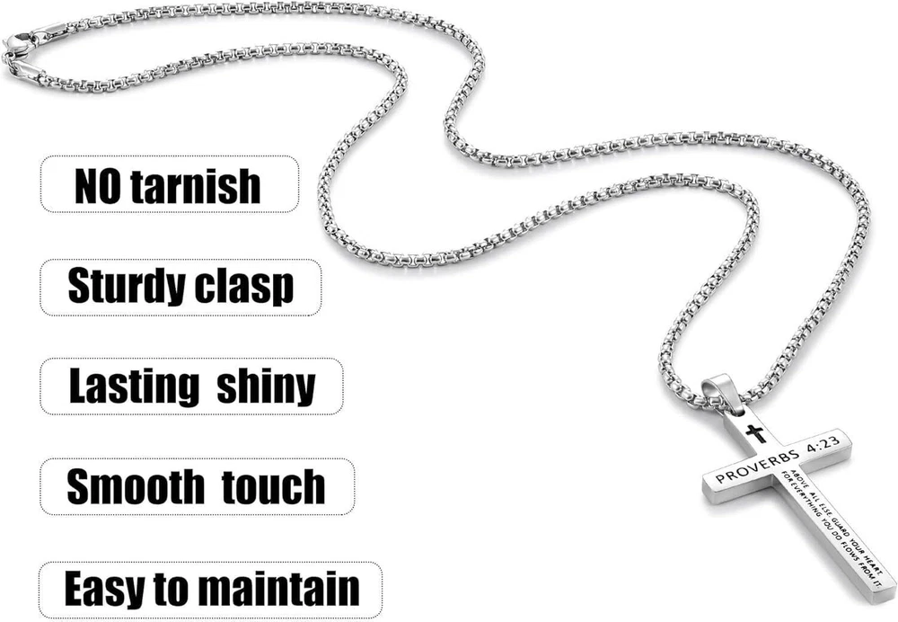 Brand : Cy trendy Give more confidence and power , Bible Verse cross necklace Bible Verse Cross Necklace for Men Give you confidence and courage High polished Smooth touch High polish makes the surface of the chains soft and smooth, bringing skin a comfortable experience Lead-free and nickel-free Hypoallergenic Lead-free and nickel-free hypoallergenic silver cross necklace for women's sensitive skin Featured stainless steel sturdiness Easy functioning clasp, robust and strong links effectively extends the chain's service life. Durability: High quality stainless steel cross chain for men with sturdy lobster clasp, stay shiny for a long time. Easy to maintain . Hypoallergenic: Lead-free, nickel-free and hypoallergenic cross necklace, comfortable for your sensitive skin . Perfect Size: Light weight 30mm*50mm Bible Verse cross pendant, 2.5mm width 24" length box necklace chain . Design: High polished cross pendant for men, engraved with the Bible Verse: PHILIPPIANS 4:13. Bible Verse Cross Necklace Give you confidence and courage . Gift for him/her: This necklace is a great gift ideas for friends, parents, sisters and brothers on birthday, anniversary, Christmas etc.. Package include : 1 necklac e