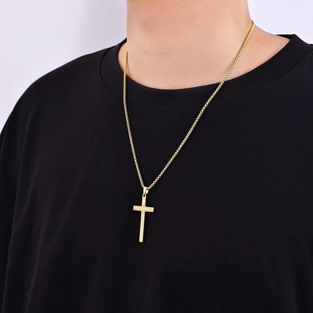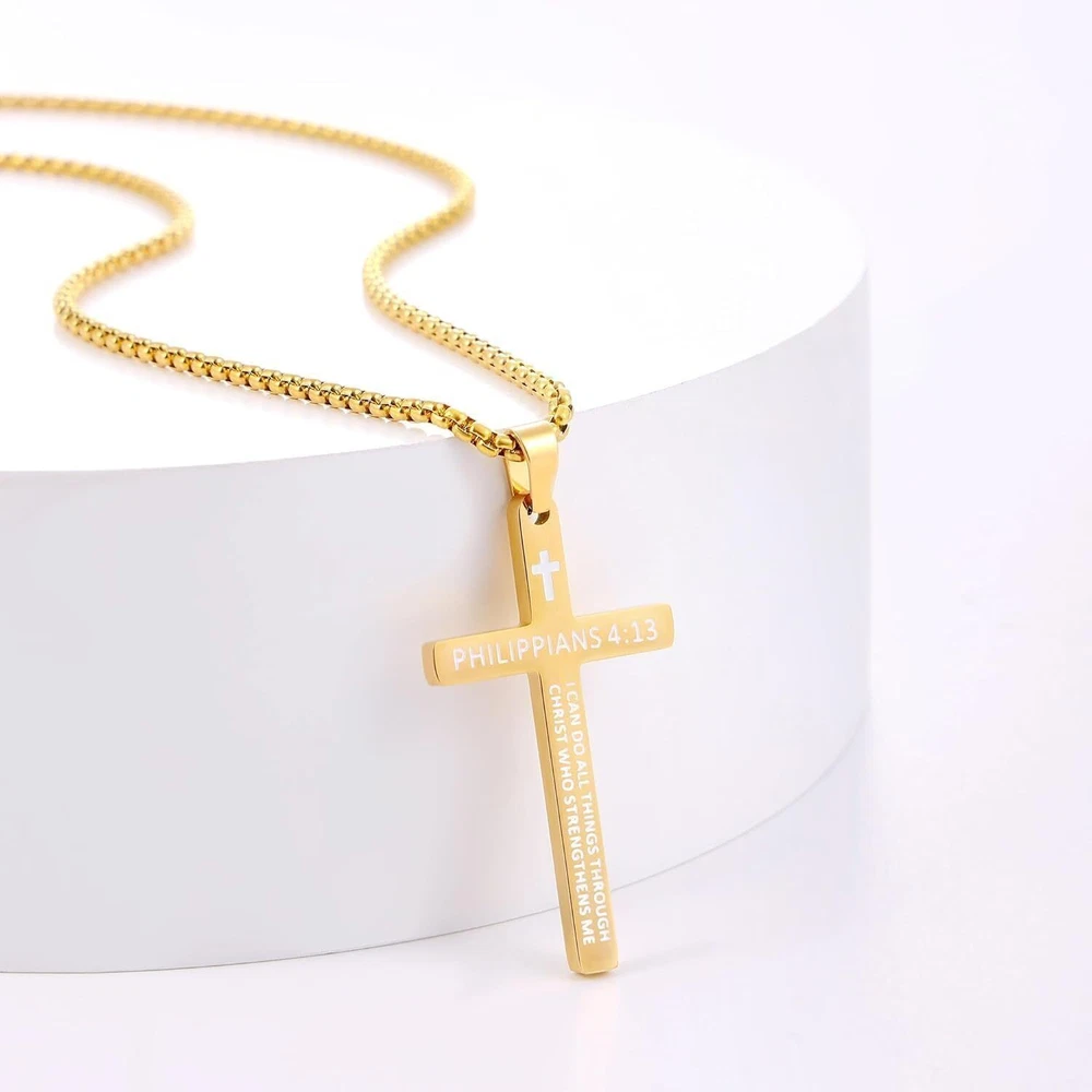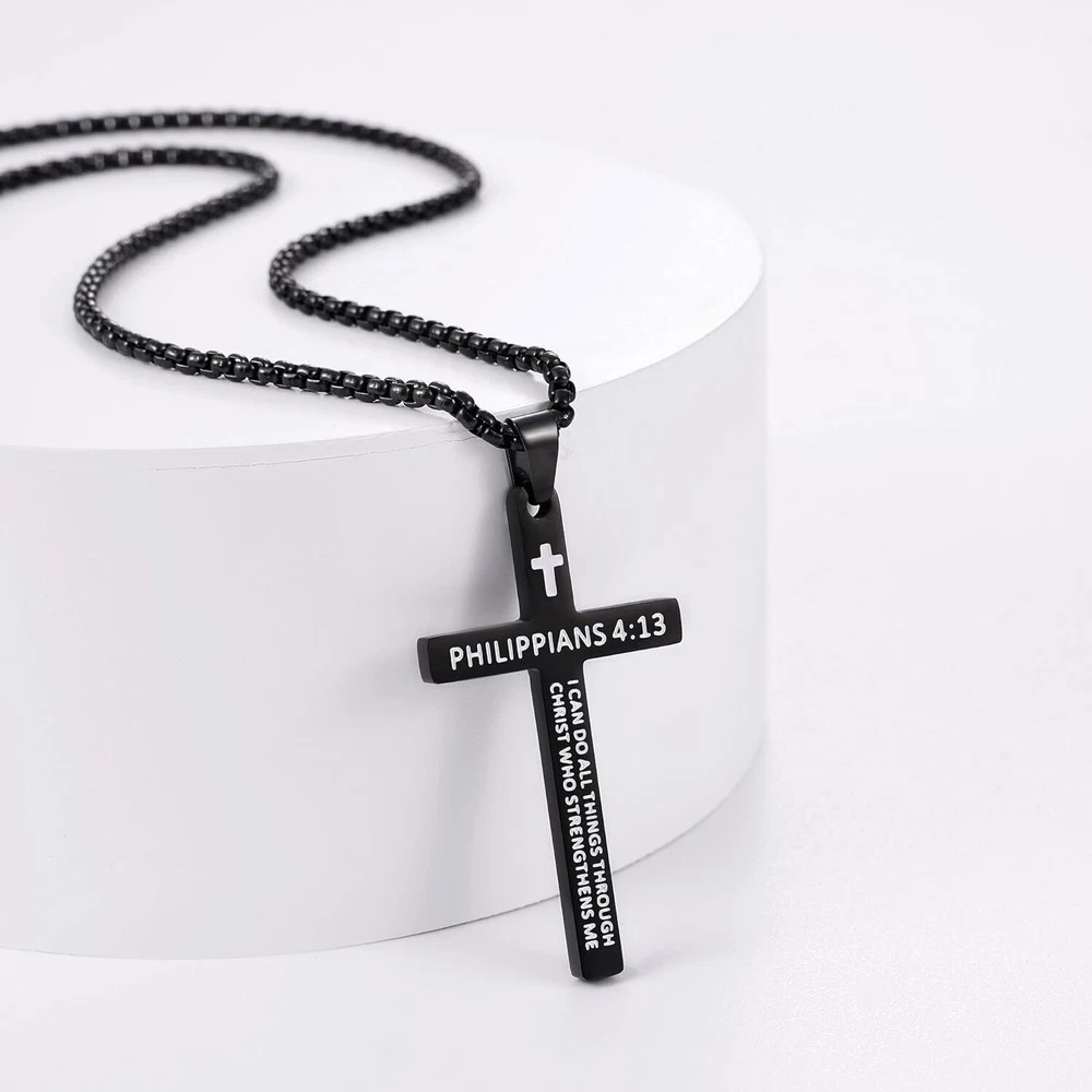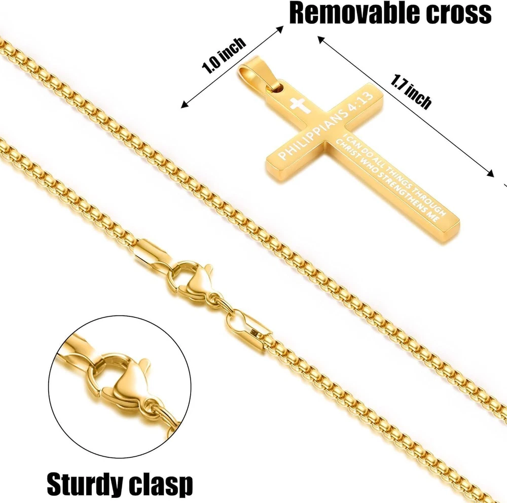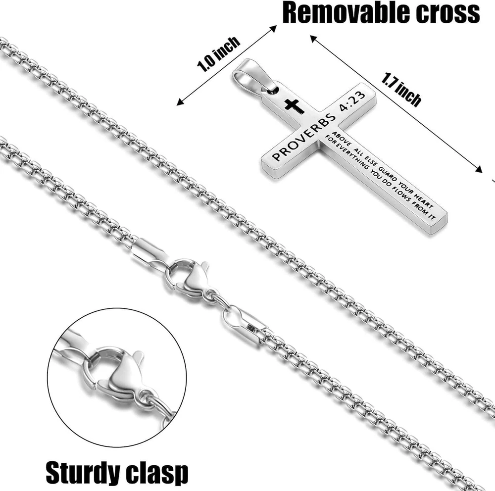 Brand : Cy trendy Give more confidence and power , Bible Verse cross necklace Bible Verse Cross Necklace for Men Give you confidence and courage High polished Smooth touch High polish makes the surface of the chains soft and smooth, bringing skin a comfortable experience Lead-free and nickel-free Hypoallergenic Lead-free and nickel-free hypoallergenic silver cross necklace for women's sensitive skin Featured stainless steel sturdiness Easy functioning clasp, robust and strong links effectively extends the chain's service life. Durability: High quality stainless steel cross chain for men with sturdy lobster clasp, stay shiny for a long time. Easy to maintain . Hypoallergenic: Lead-free, nickel-free and hypoallergenic cross necklace, comfortable for your sensitive skin . Perfect Size: Light weight 30mm*50mm Bible Verse cross pendant, 2.5mm width 24" length box necklace chain . Design: High polished cross pendant for men, engraved with the Bible Verse: PHILIPPIANS 4:13. Bible Verse Cross Necklace Give you confidence and courage . Gift for him/her: This necklace is a great gift ideas for friends, parents, sisters and brothers on birthday, anniversary, Christmas etc.. Package include : 1 necklac e