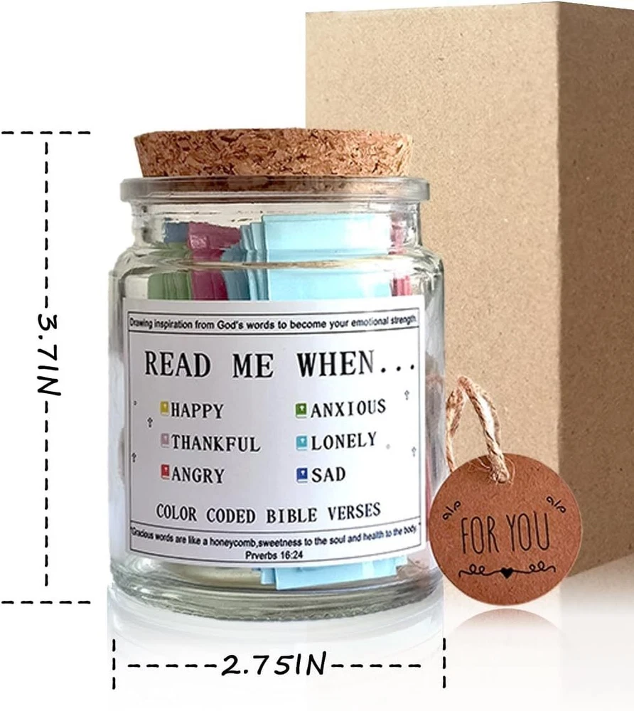 Menu Other Items Feedbacks About Us Contact Us Add To Favorites Bible Verse Jar with Hope Scriptures, Prayer Jar Gift, Faith-Based Inspiration Inspirational Bible Verse Jar - 96 Verses for Daily Encouragement Easy Scripture Reference – Each card displays the chapter and verse number, simplifying scripture location for a seamless Bible-reading experience. Ideal for spiritual growth and guidance. Inspiring Verse Collection – This Bible Verse Jar features 96 handpicked verses, providing daily encouragement and uplifting messages—perfect for women seeking faith, hope, and spiritual support. Mindfulness & Gratitude Practice – Choose a verse that speaks to your heart, helping you embrace gratitude and mindfulness in your everyday routine. Long-Lasting and Reusable – Crafted from durable glass, this keepsake jar can hold treasured verses and memories over time, making it a lasting spiritual companion. Thoughtful Christian Gift – An ideal present for believers, this verse jar offers support and encouragement, making it perfect for birthdays, holidays, graduations, or any special occasion. Bible Verses in a Jar Christianity offers a wealth of comfort and wisdom to millions worldwide. With this "Bible Verses in a Jar," you carry that inspiration and support wherever you go. This beautifully crafted glass jar includes 96 selected Bible verses meant to uplift, comfort, and provide guidance. Whether facing life’s challenges or simply seeking peace, these cards bring God’s words to your fingertips. Perfect as a gift for graduations, Christian events, or any time you want to express love and support, this jar adds a special touch to any space. With durable glass construction, it’s a cherished piece you can turn to year after year. Interactive and Lasting – Each card lists its Bible reference, enhancing your faith journey by allowing quick access to the original scripture. This jar is both stylish and meaningful, sure to touch the hearts of those who receive it. Item Specification Unit Count 1.0 Count Capacity 4 ounces Number of Items 1 Closure Type Cork Color lucency Pattern Bible Material Glass Shape Rectangular Recommended Uses For Product Inspiration, spiritual guidance, and Christian gifts Item Dimensions W x H 2.75"W x 3.7"H Dimensions Shipping Returns Additional Info Product Dimensions: 3.7 "h x 2.75 "h. Weight: 4.0 oz Fast shipping is very important for us. Our standard shipping service is FREE. Your order will be shipped within 1-3 business days upon full payment received. Most items are delivered within 3-5 business days, however, please allow 3-10 business days. We are shipping only to USA. We only ship to the confirmed Paypal address. We reserve the right to cancel any order for any reason at any time. We are not responsible for undeliverable addresses. We offer a 30 day return policy from checkout winning date. Your satisfaction is guaranteed! If for any reason you are unhappy with your item, just return it within 30 days for a full refund, minus shipping cost. Please contact us prior to initiating a return so that we can issue you a refund authorization. Items defective upon receipt must be packaged in their retail packaging as if new and returned with a detailed description of the problem. Return shipping fees are not refundable. We reserve the right to decline any returns if the above guidelines are not followed. All of our items, unless otherwise stated, will only run on 120 volts. Please check to make sure your country complies with these specifications. If you have a problem or question regarding your transaction please contact us before leaving any type of feedback. We will work with you to resolve any problem you may have.