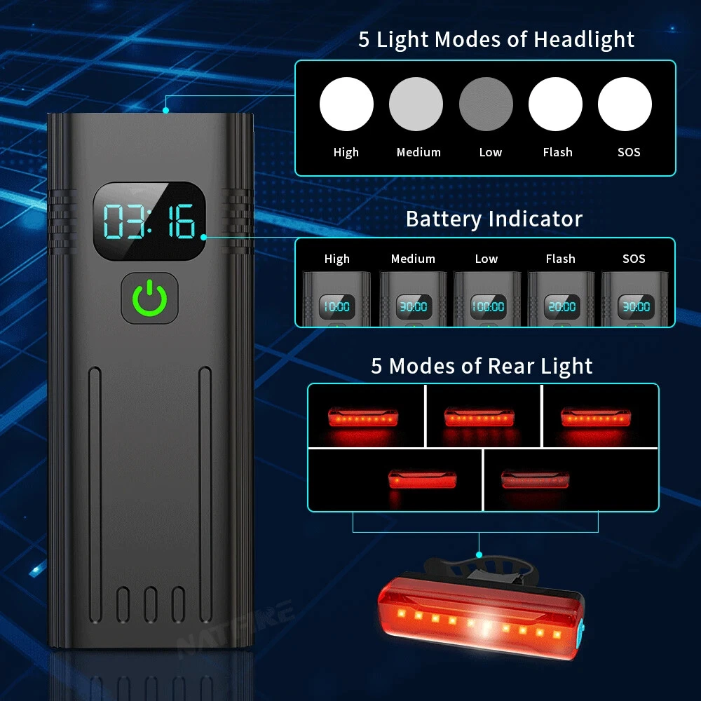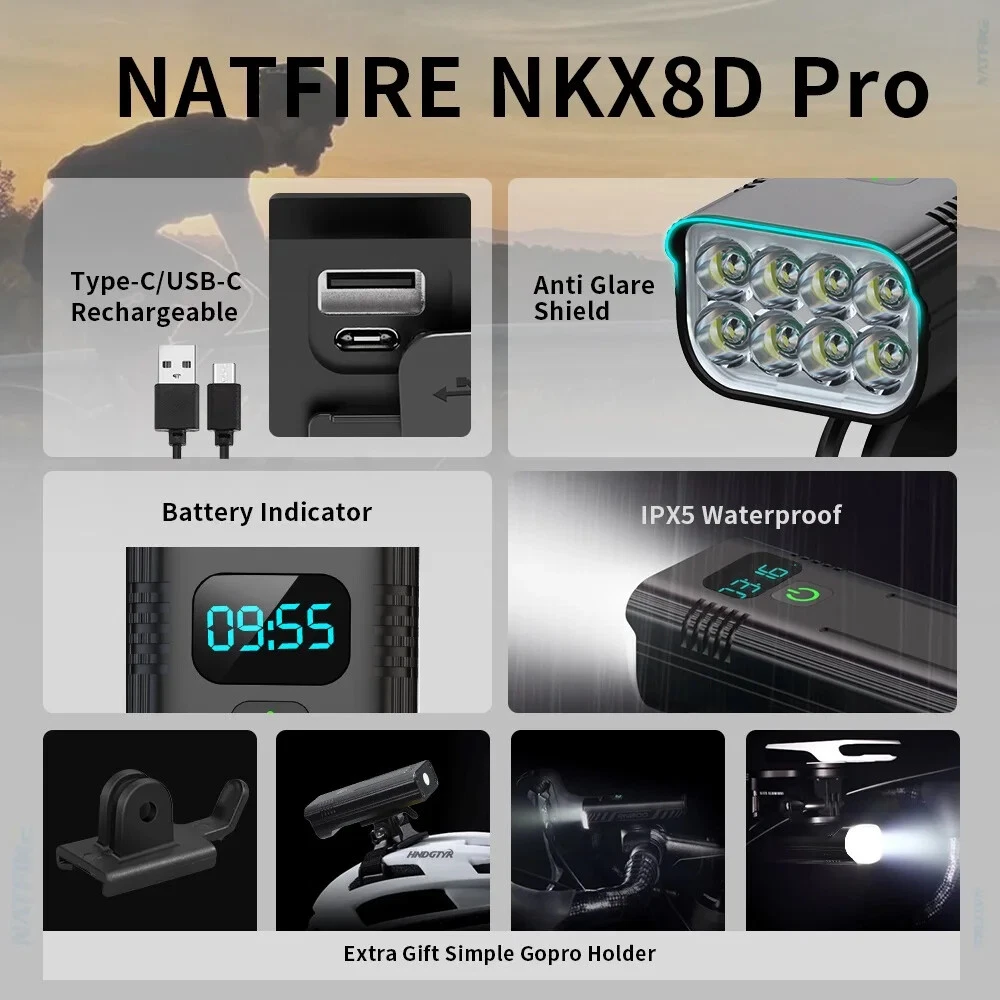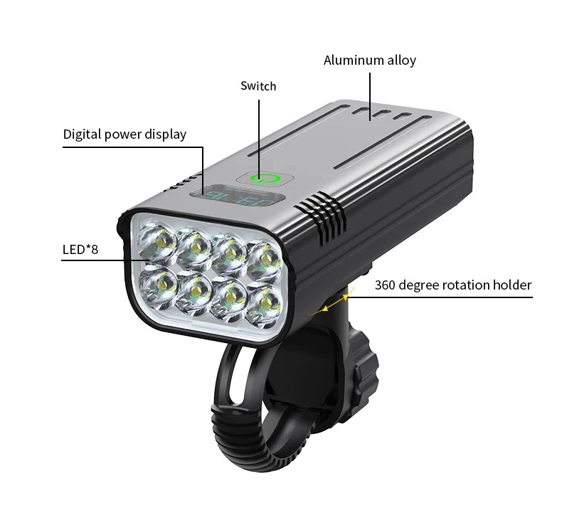 10000mAh 5000LM MTB Bicycle Front Light Bicycle 8*LED Front Bike Light Headlight Bike Accessories USB Rechargeable 【SUPER BRIGHT BIKE LIGHT TO KEEP YOUR SAFE】 Adopt of extra bright LED bead for Natfire bike lights set, provide 1000-5000 lumen and up to 300+ feet beam length ,You will be shocked and amazed at how bright it is! Five light modes- High, Medium, Low, strobe and sos light modes. so you can see clearly no matter on a urban road or on a dark lonely country road, excellent to keep you safe at night. 【Battery Power Display & 360° Rotation】 The Bicycle Front Light is designed with battery power display function, showing the actual time of remaining battery, which can help you to master the usage and charging time more conveniently. Moreover, the natfire mount bracket for the headlight is 360° rotatable, allowing you to adjust to the suitable angle according to actual situation during cycling. 【USB RECHARGEABLE】 Save your time to replace batteries every week. Never waste money on batteries anymore. Natfire bike light and optional red rear light come with a CHARGING CABLE that charges from your computer, power bank or any device with a USB port. 10000mAh large capacity and Built-in intelligence IC can prevents overcharge or over discharge and extend battery life. This bike headlight has a Runtime of 7+ hours on the highest setting and Runtime of 15+ hours on the lowest setting. (Depends on the battery you choose, larger battery capacity, longer runtime) 【WE THINKING MORE FOR YOU】 No any tools needed making it easy to install. Easily mounted and secured with the adjustable mount. it's very easy to take off from bike for recharge and prevent thieves for stealing, portable design for rechargeable bicycle headlights.Water resistant rated to IPX5 - Protected against splashing water from any angle. Product Parameters Model: Bicycle Light NKX8D Pro - Digital Display Version Material: Aluminum shell Mode: 5 Light Modes Working voltage: 3.7V Waterproof: IPX5 Range: About 100-300M Battery:10000 mAh Surface craft: Abrasion resistant anodizing Tips: If you do not use it for a long time, please charge it every three months. Do not shine into the eyes. Keep away from flammable and explosive materials. Waterproof grade is IPX5. Do not immerse the bicycle light in water. Place the bicycle lights correctly. Keep out of reach of children to avoid accidents.
