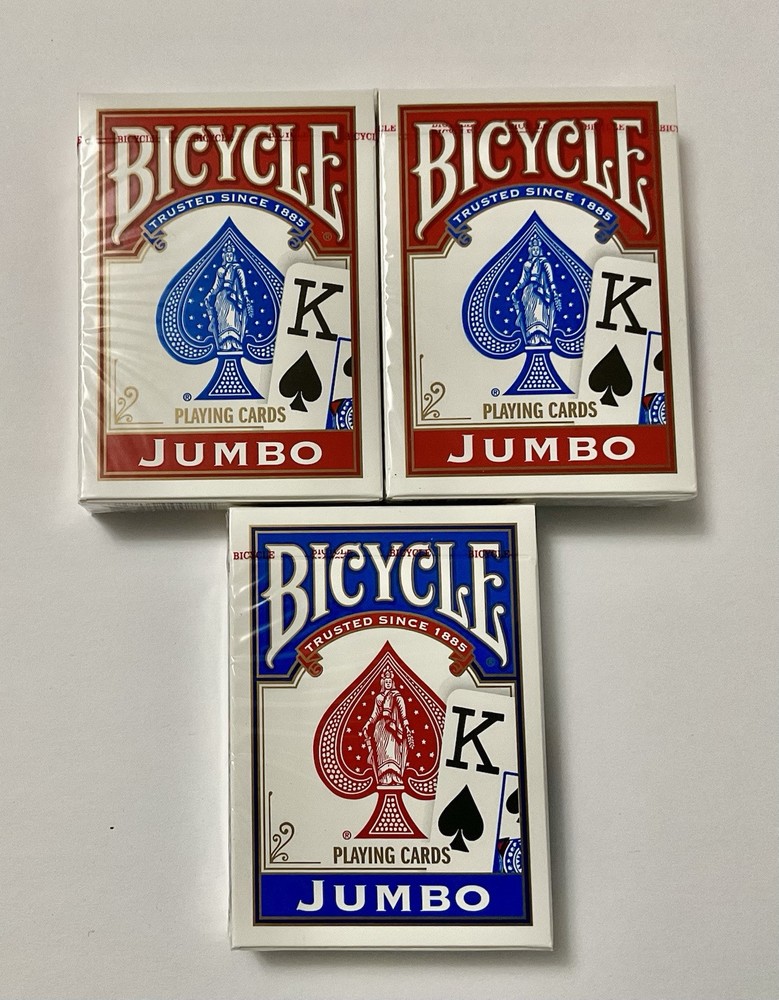 Enjoy a game of cards with this 3 pack of Bicycle Jumbo Playing Cards. These New and unopened cards are perfect for collectors and enthusiasts alike, featuring a stunning design and easy to read jumbo index for a comfortable gaming experience. Made by Bicycle, a trusted brand in the industry.