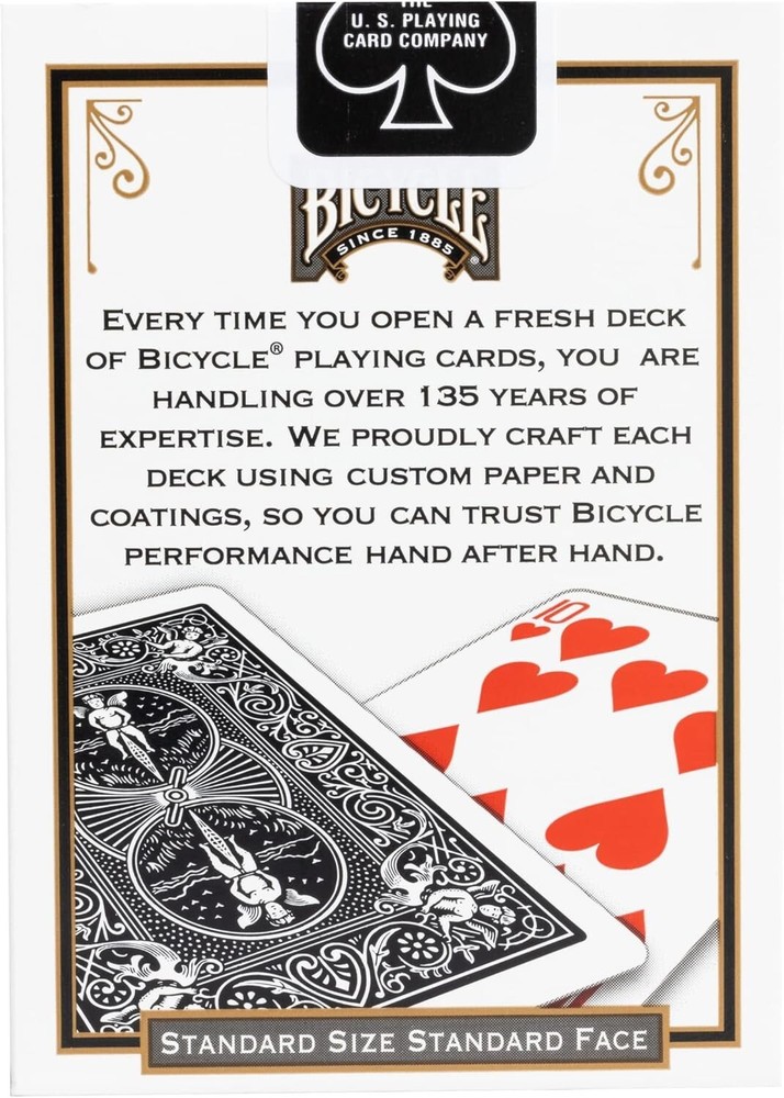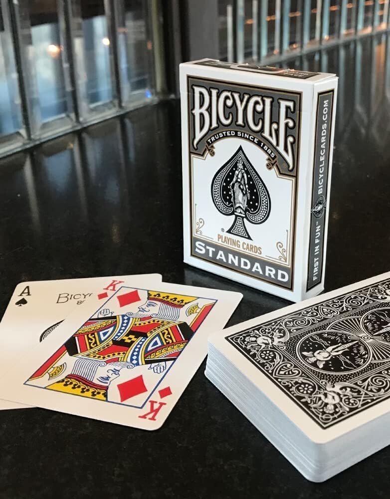 STANDARD INDEX PLAYING CARDS: Enjoy the ideal balance of size and functionality with our Bicycle Black Playing Cards. Perfect as poker cards, these standard index cards cater to everyone from beginners to experts TRUSTED BICYCLE QUALITY: Experience the feel of perfection in every game with these high quality playing cards. Each card is engineered with an Air Cushion Finish, providing an easy handling and shuffling experience VERSATILE GAMING: These cards open the door to countless games of skill and chance. From poker and blackjack to euchre, pinochle, rummy, and canasta. Unleash your inner gamer with this versatile deck of playing cards CLASSIC RIDER BACK: With the classic Rider Back design, this deck of cards bring a sense of nostalgia and traditional charm to your gaming table. A perfect blend of style and functionality, adding a touch of class to your card games ECO-FRIENDLY & MADE IN USA: Crafted in the USA with 100% recyclable FSC paper, our Bicycle Cards embody an unparalleled blend of sustainability and quality. Feel good about your purchase knowing these playing cards contribute to a greener planet