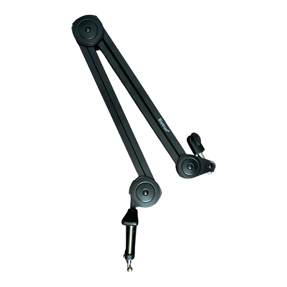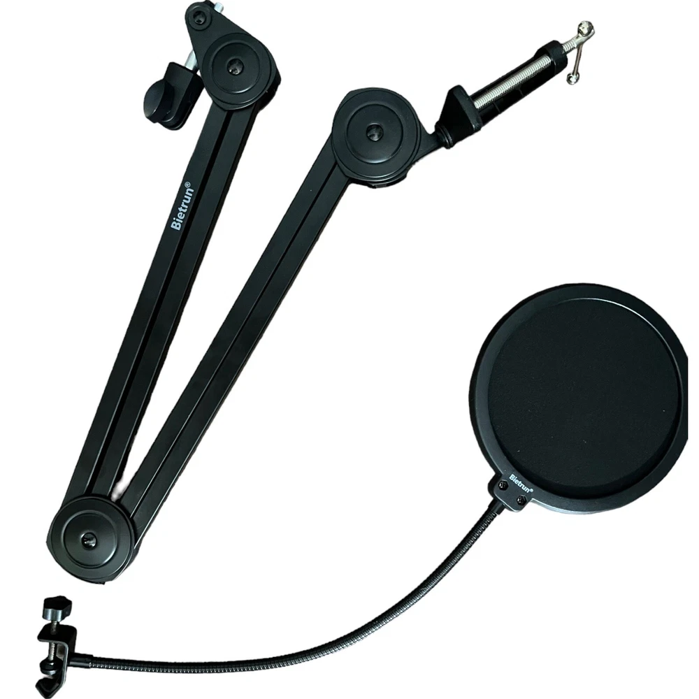 "Upgrade your recording setup with the Bietrun Foldable Microphone Arm Desk Mount with Round Pop Filter! This versatile microphone arm is designed to provide maximum flexibility and convenience for your audio needs. Flexible Positioning: With a sturdy desk mount and adjustable arm, you can position your microphone exactly where you need it. Whether you're recording podcasts, voiceovers, or gaming sessions, this mount ensures your voice is crystal clear. Noise Reduction: The included round pop filter helps eliminate unwanted plosives and breath sounds, ensuring professional-grade audio quality. Say goodbye to those distracting pops and hisses! Foldable Design: When unused, the arm conveniently folds up, saving you valuable desk space. It's perfect for home studios, streaming setups, or any workspace where efficient use of space is essential. Easy Installation: Setting up this microphone arm is a breeze. The clamp-style mount securely attaches to your desk without drilling or permanent fixtures. Universal Compatibility: This microphone arm is compatible with a wide range of microphones, making it a versatile addition to your setup. Upgrade your recording experience with the Bietrun Foldable Microphone Arm Desk Mount with Round Pop Filter. Order yours today and take your audio to the next level.