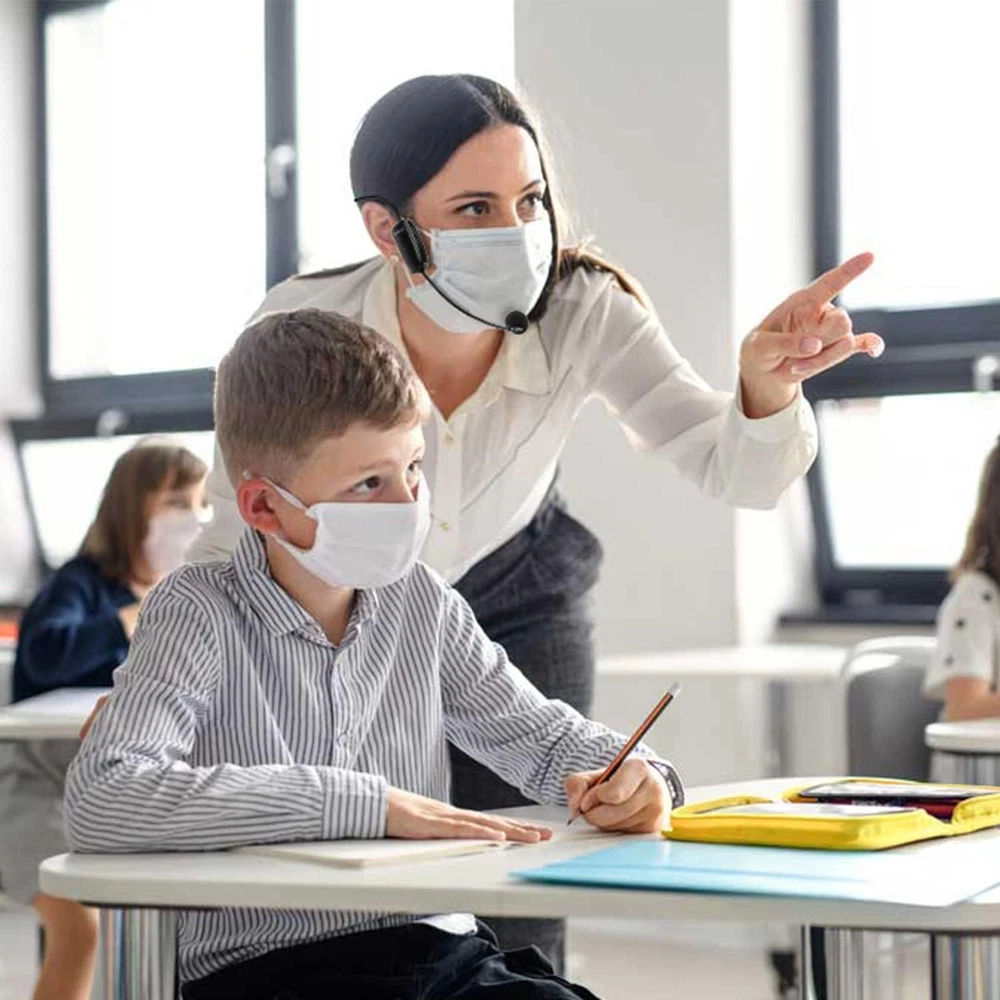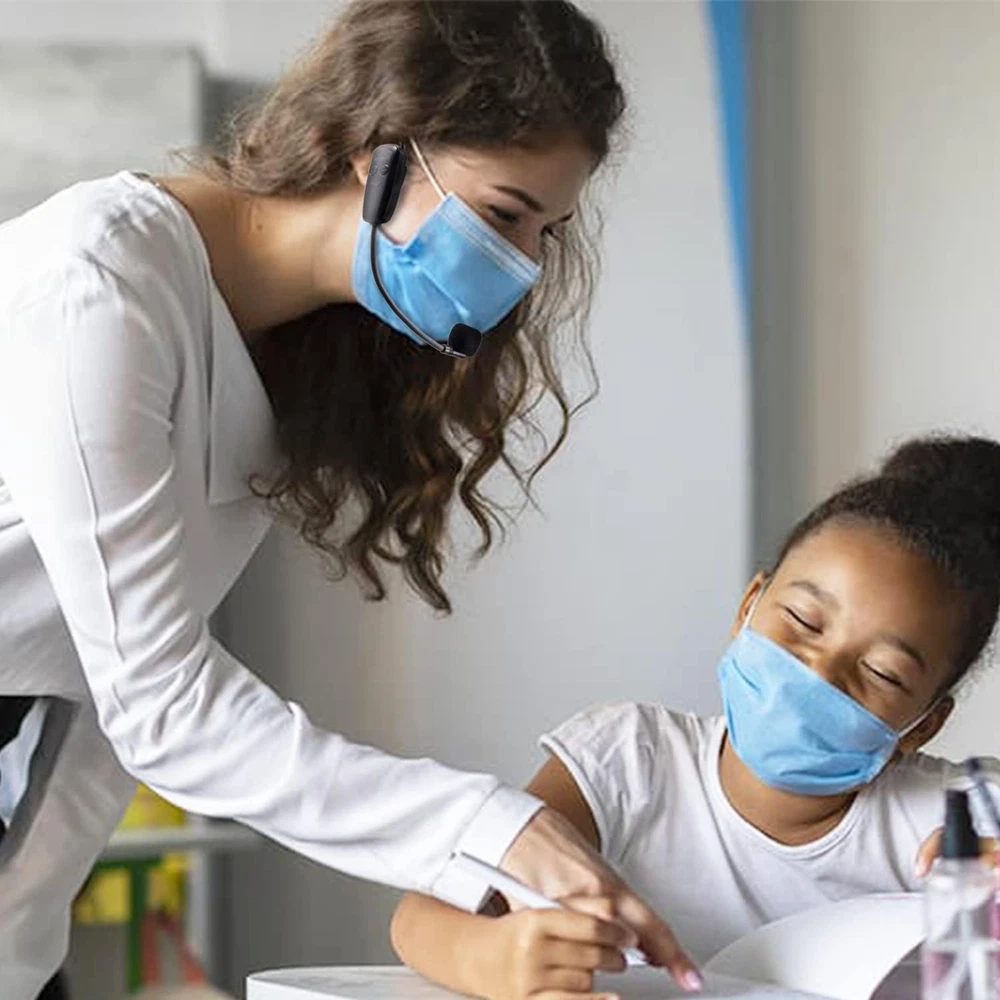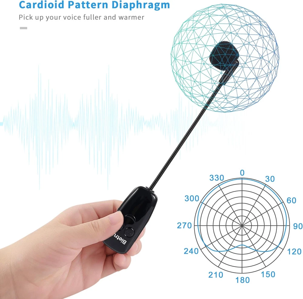 Wireless microphone headset system: Only for Mic Jack, not Aux Jack, otherwise no sound ●Built-in high sensitivity condenser microphone, transmission distance upgrade to 160 Feet (50m) ●Signal Stability●No Delay●No Radiation ●Anti-Howling ●Anti-Jamming ●Constant Frequency ●Clearer Sound Quality. Compatible voice amplifiers, multimedia. It is a portable Karaoke equipment.(Excludes Amp&Not supported Iphone, bluetooth speaker, PC and Laptop) ●Obtained by FCC test. Easy to use: Please turn on the transmitter and receiver power switches, the blue light will flash for approximately 2s. Indicator light stops flashing after a successful match, then you can use it. No further operation. ●Headset and handheld is 2 in 1 design, easily change the handheld mode to headset mode to meet your needs. Not supported Android Phones, Iphones, Macbooks, Laptop, Bluetooth Speaker. Charge and work of wireless microphones: The transmitter and receiver are built-in 400 mah rechargeable lithium-ion batteries that can offer about 6 hours working time. ●Usb cable has two micro USB V2.0 to charge for the transmitter and receiver simultaneously. Fully charge is only 2.5 hours. ●Perfect Application: The plug on the receiver is 3.5mm. For 6.35mm amplifiers, please use the additional 6.35mm adapter(included)to connect more equipments. Using multiple wireless microphone simultaneously: Please refer to the user manual to channel switching( Max 15 Channel ) in (●Part 4 Advanced Operations To 4.2 Note B, Page 8) Otherwise there maybe noise or no sound. Use up to 15 microphone headset at the same time. Built-in cardioid polar pattern condenser microphone, widely applied to conference, speech, Web podcast, outdoor Live, Yoga instructor, voice amplifier, dancing instructor, promotion, game etc. What if can't pair or no sound: ●1, Turn off the receiver and transmitter ● 2, Turn on the transmitter(Handheld Microphone), blue light is on, long press “+ ” to flash the blue light ●3, Turn on the receiver and wait for connection ●4, The blue lights of the transmitter and receiver stop flashing, the connection is successful. Product description 2023 Upgraded wireless microphone headset Not compatible with Bluetooth speakers, Android phones, iPhones and MacBooks Transmission range to160ft(50M) Enhances signal stability Reduces latency Anti-howling Anti-interference Constant frequency Clearer sound quality Transmitter and Receiver built-in 400 mAh rechargeable lithium-ion batteries 6 hours working time 2.5 hours charging time Meet the professional needs of teaching, tour guides, games, promotions, guitarists, conferences, moderators, lecturers etc. High sensitivity condenser microphone Built-in High sensitivity condenser microphone ability to clearly extract your voice 3.5mm to 6.35mm Converter 3.5mm to 6.35mm converter can adapt to more loudspeakers 400 mAh Battery Capacity 6 hours working time. Fully charging time only takes 2.5 hours. Two Type C port to charge for the transmitter and receiver simultaneously Head-mounted and hand-held Choose the headset mode or handheld mode according to your needs What if I can't Pair or not sound ? 1. Turn off the receiver and transmitter 2. Turn on the transmitter(Handheld microphone), blue light is on, long press “+ ” to flash the blue light 3. Turn on the receiver and wait for the connection 4. The blue lights of the transmitter and receiver stop flashing, the connection is successful. Use multiple wireless microphone headsets at the same time. 1. Maintain the first set can be used normally. 2. Re-pair the second set. Then long press the "-", wait for the blue light to flash quickly once( switch channel once), confirm they have no interference and work normally. 3. And so on, the third set should re-pair and switch channel three times... In order to make the wireless microphone Headset work normally, after receiving the product please charge it for 2.5 hours before using. If you need to connect to MACbook or other computers, you need Additional purchase a USB to 3.5mm TRRS converter (search on Amazon: B08P5MKXFD).