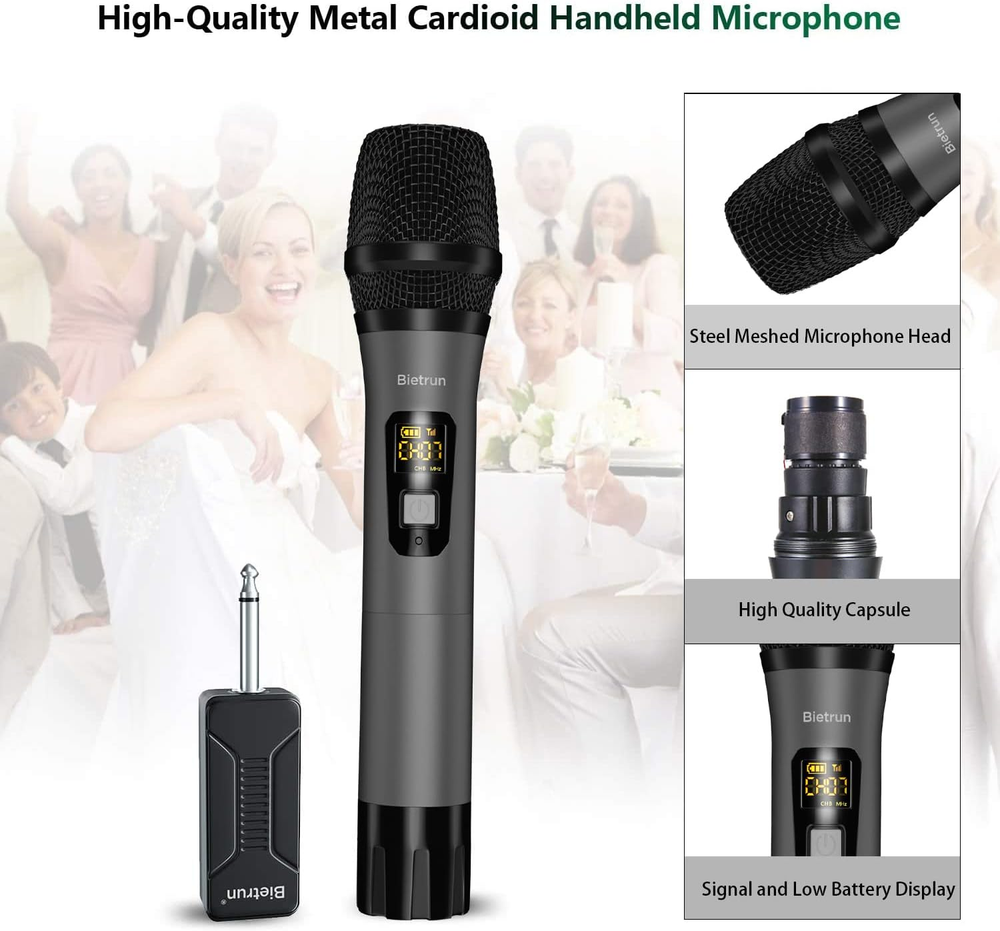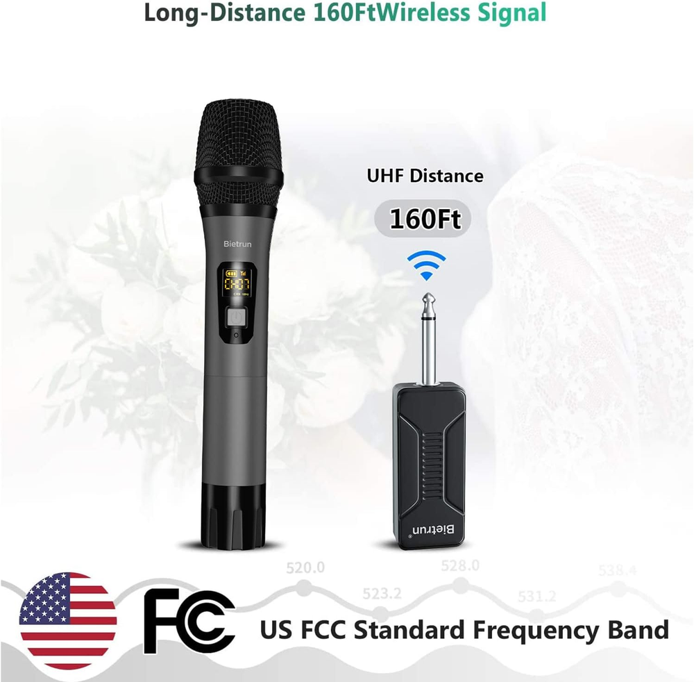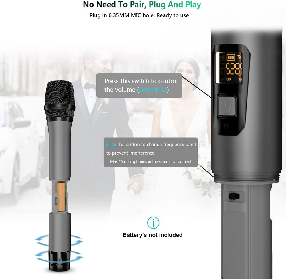 Long Distance Wireless Karaoke Microphone: Wireless Distance Upgrade To 160 Feet (50m), Upgraded the microphone manufacturing process with Signal Stability●No Delay●No Radiation●Anti-Howling●Anti-Jamming ●Constant Frequency●Distortion <0.2%●15 Uhf Adjustable Channels. ●The Mic Outer Case Is Alloy Material Which Is Harder, Lighter And More Wear-Resistant. Plug And Play, Easy To Use: ●Can Only Plug In equipment with Mic input, Can't Plug In AUX input, Otherwise No Sound.(Not Compatible with Bluetooth Speakers and Laptop)●For With Mic input Speaker, Singing Machine, Audio Amplifier, Pa System, Mixer, Voice Amplifier And More Streaming Multimedia Equipment..●The Display Can Show The Battery Power And Signal Strength In Real Time, Don'T Worry About Suddenly Not Working. Microphone Battery Powered and Rechargeable Receiver: The Microphone Does Not Come With Any Batteries, We Recommend Using 2 AA Amazon Alkaline Batteries. ●Correctly install the battery + - direction.●the receiver should be charged for 5 hours before the first use●Long Press and hold the Mic and Receiver buttons to power on, The Chargeable Receiver Is Built-In 650 Mah Battery For 4 Hours work Time And Fully Charged In 3 Hours. Unidirectional Microphone: Built-In Professional Moving-Coil Unidirectional microphone core, when uses, the mouth should be close to the top of the microphone to loud voice for Conference, Speech, Outdoor, Church, Family Party, Open Ceremony, Dancing Instructor, Promotion, Etc.●If You Use Multiple Mic At The Same Time or Noise, Please Switch Channels(Open the mic battery cover, click the“HI LO”button), Make sure each mic channel number is different and the channel numbers are far apart. Quick Troubleshooting: ●1.Make sure you have enough power for the mic and receiver. ●2.Connecting equipment with MIC input, not other interfaces. ●3.If you find no sound from the mic, you need to re-pair.1.Turn off the receiver and mic.2. Open the mic battery cap.3. Press and hold the mic(HI LO)button for 10s+ until the display channel flashes.4. Quick turn on receiver, wait for the mic channel display to stop flashing, and the blue light of the receiver is always on, ready to use. Product description WXM02-Technical Specifications Wireless Distance Uhf 160ft(Use lawful signal bands with US FCC ID) Number Of Adjustable Channels 15*2 sets Microphone Type Dynamic Microphone Core Cardioid/Unidirectional Microphone impedance 600 ohm Frequency Response 50hz - 16khz Microphone dB 95dB Receiver Working Time 4.5 H For Working Receiver Charging 3 H For Charing Microphone Power 2 AA batteries(Amazon AA alkaline batteries are recommended) Material Microphone is Zinc Alloy Display Digital Display Output plug 1/4''/6.35MM Compatible with devices PA speaker, Singing machine, audio amplifier, PA system, Voice amplifier, Mixers, Audio Interfaces, truck speaker system, Dome speaker system etc Usage environment Conference, Speech, Outdoor, Church, Family Party, Open Ceremony, Dancing Instructor, Promotion, Etc. Built-in Newly designed UHF wireless core, transmission distance upgrade to 160 feet (Open place). Enhance Signal stability, No delay, No radiation, Anti-howling, Anti-jamming, Constant frequency. Built-In Professional Dynamic Microphone core(dB value: 95dB/Impedance: 600 ohms/Frequency response: 50Hz - 16Khz). The handheld mics with all Metal Design, which is harder, lighter and more wear-resistant. When uses, the mouth should be close to the top of the microphone to loud voice. The microphone does not come with any batteries, we recommend using 2 AA Amazon alkaline batteries. The display can show the battery power and signal strength in real time, don't worry about Suddenly not working. The chargeable receiver is built-in 720mAh battery for 4.5 hours use time when fully charged in 3 hours. Using the Receiver Plug In equipment with 1/4 inch/6.35MM Mic input. For speaker, Singing machine, audio amplifier, PA system, Voice amplifier, Mixers, Audio Interfaces, truck speaker system, Dome speaker system etc.