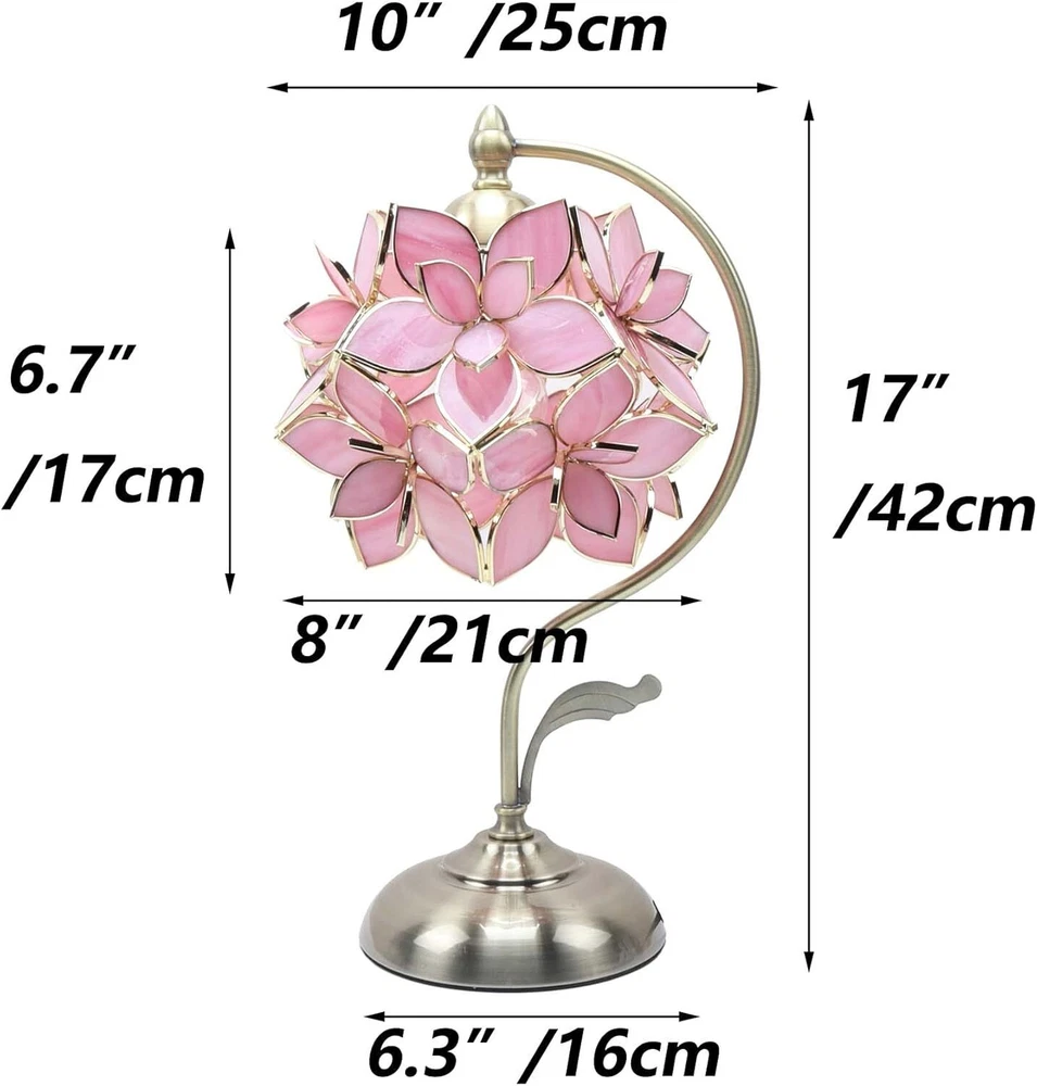 Bieye L10833 Rose Lily Flower Tiffany Style Stained Glass 8" Lily, Pink Product Details Finish Type: Brass Base Material: Brass Bulb Base: E26 Product Dimensions: 10"D x 8"W x 17"H Item Weight: 4.9 Pounds Lamp Type: Table Lamp Shade Color: Pink Shade Material: Stained Glass Switch Type: Rocker Style: Tiffany Brand: Bieye Color: Pink Special Feature: Corded Light Source Type: Buld not included Material: Brass, Glass Room Type: Living Room, Bedroom Recommended Uses For Product: Decoration Power Source: Corded Electric Shape: Flower Number of Light Sources: 1 Connectivity Technology: Inline Included Components: Shade included Is Waterproof: False Mounting Type: Tabletop Wattage: 40 watts Number of Items: 1 Lighting Method: Downlight Control Method: Touch Indoor/Outdoor Usage: Indoor Specific Uses For Product: Indoor use only Water Resistance Level: Not Water Resistant Installation Type: Freestanding Number of Pieces: 1 Voltage: 110 Volts Is Cordless?: No Size: 8" Rose Lily Manufacturer: Weaseller inc Shade Height: 17 Centimeters Part Number: L10833 Item Weight: 4.9 pounds Country of Origin: China Item model number: PETALTABLE Finish types: Brass Special Features: Corded Batteries Required?: No Product Dimensions : 8 x 10 x 17 inches; 4.9 Pounds Item model number : PETALTABLE Manufacturer : Weaseller inc Country of Origin : China Finish Type: Brass Base Material: Brass Bulb Base: E26 Product Dimensions: 10"D x 8"W x 17"H Item Weight: 4.9 Pounds Size: 8-inch wide lampshade, 17-inch high, Uses 1 x 40W (Max) E26 bulb (Not included), In-line switch; ELEGANT PETAL: This is a simple style petal lampshade that is made of pink stained glass; Simplicity is the key to aesthetic success in spaces inspired by this style HANDMADE: This lamp is handmade by skilled craftsmen; The lampshade is made of stained glass and it is prepared by using the copper foil method TIMELESS: The stained glass is timeless and never losing its luster; You will notice the difference in color between the light on and off IDEAL DECOR: You will see many shadows of the petal on you wall when you light it up at night. it's really an amazing home decor no matter where you place it. Pink lilies stand for love, admiration, compassion, and femininity. The color pink stands for love, admiration, compassion, femininity, and understanding. Pink-colored lilies, too, represent these is a Tiffany-style stained glass petal lamp. Each lampshade has 10 flowers, and each has 5 petals; each petal is made of pink stained glass wrapped by copper rims that add strength and durability to the lampshade. It looks stunning when you place it in your house. You definitely will receive many's also a special gift for your lover, parents, children, clients, and colleagues; It perfectly fits a bedside, living room, end table, working table, dining room, etcIf you use it at night, the petals will be projected onto the wall. The light and shadow on the wall will add a great ambiance to your house. It definitely an amazing nightstand lamp.BIEYE is a worldwide well-known brand of Tiffany-style stained glass products, and we specialize in designing and manufacturing Tiffany-style lamps, window panels, and other stained glass artworks.