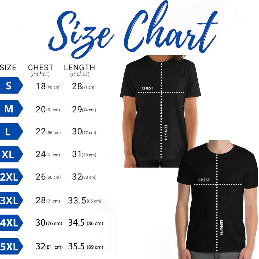 Premium Cotton T-Shirts | Product Details Premium Quality T-Shirts For any issues with your order or if you have not received your item, please contact us directly. We are committed to resolving any concerns with the highest level of professionalism. Product Specifications Material: 100% cotton (fiber content may vary for different colors) Weight: Medium (5.3 oz/yd² (180 g/m²)) Pre-shrunk Shoulder-to-shoulder taping Quarter-turned to avoid crease down the center Size Chart Size Chart in Inches Size Width (in) Length (in) Sleeve Length (in) S 18.00 28.00 7.75 M 20.00 29.00 8.25 L 22.01 30.00 8.25 XL 24.02 31.00 8.76 2XL 26.03 32.00 9.26 3XL 28.04 33.00 9.77 4XL 29.97 34.00 10.24 5XL 31.97 35.00 10.75 Size Chart in Cm Size Width (cm) Length (cm) Sleeve Length (cm) S 45.70 71.12 18.40 M 50.80 73.66 19.70 L 55.80 76.20 20.90 XL 60.90 78.74 22.20 2XL 66.00 81.28 23.50 3XL 71.10 83.82 24.80 4XL 76.30 86.36 26.00 5XL 81.20 88.90 27.30 Interested in more items? Contact us to arrange combined shipping and save on costs Payment Options We accept a variety of payment methods, including credit and debit cards, Apple Pay, Google Pay, PayPal, and PayPal Credit. Contact Us Check back soon for updated contact information. In the meantime, add us to your favorite sellers and visit our shop again later. Thank you for your patience! Visit Our Shop Please note: Orders of incorrect sizes are not eligible for refunds. All products are made on demand, so exchanges require producing a new item.