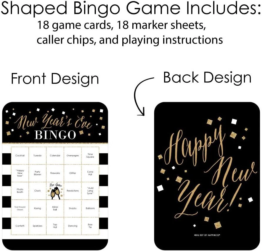 Big Dot of Happiness New Year’s Eve - Gold - Bar Bingo Year's - Product Details Product Dimensions: 8 x 5.63 x 0.38 inches Item Weight: 5.9 ounces Manufacturer: Big Dot of Happiness Is Discontinued By Manufacturer: No New Years Eve Bingo Cards and Markers INCLUDES 18 game cards, 18 perforated marker sheets, 1 perforated call sheet, and game instructions. MUST-HAVE PARTY SUPPLY: Bingo is an easy and classic New Year’s Eve game that everyone will have fun playing. New Years Eve Bingo Cards and Markers give this classic game a fresh look with New Year’s Eve playing cards and activities related words instead of numbers. HOW TO PLAY: Play traditional bingo rules or take out with your group and play bar bingo. Like gift bingo, bar bingo is played by observing your crowd and marking the space when you see a corresponding item. Begin traditional play by the designated bingo leader pulling a caller chip from the bowl. Each guest covers the called word on their card with square marker. Continue until a guest has covered a row in any direction – vertically, horizontally, or diagonally and calls out “BINGO!”. HIGH-QUALITY: New Year’s Eve Bingo Cards and Markers are professionally printed and double-sided on sturdy cardstock paper. They are individually inspected and carefully packaged by hand. Each card measures 5” Wide x 7” Tall, perforated marker sheets measure 2.75” Wide x 5” Tall and individual markers measure 0.75” Wide x 0.75” Tall. MADE IN THE USA: New Year’s Eve Bingo Game is designed and manufactured at our Wisconsin facility using materials that are Made in the USA.