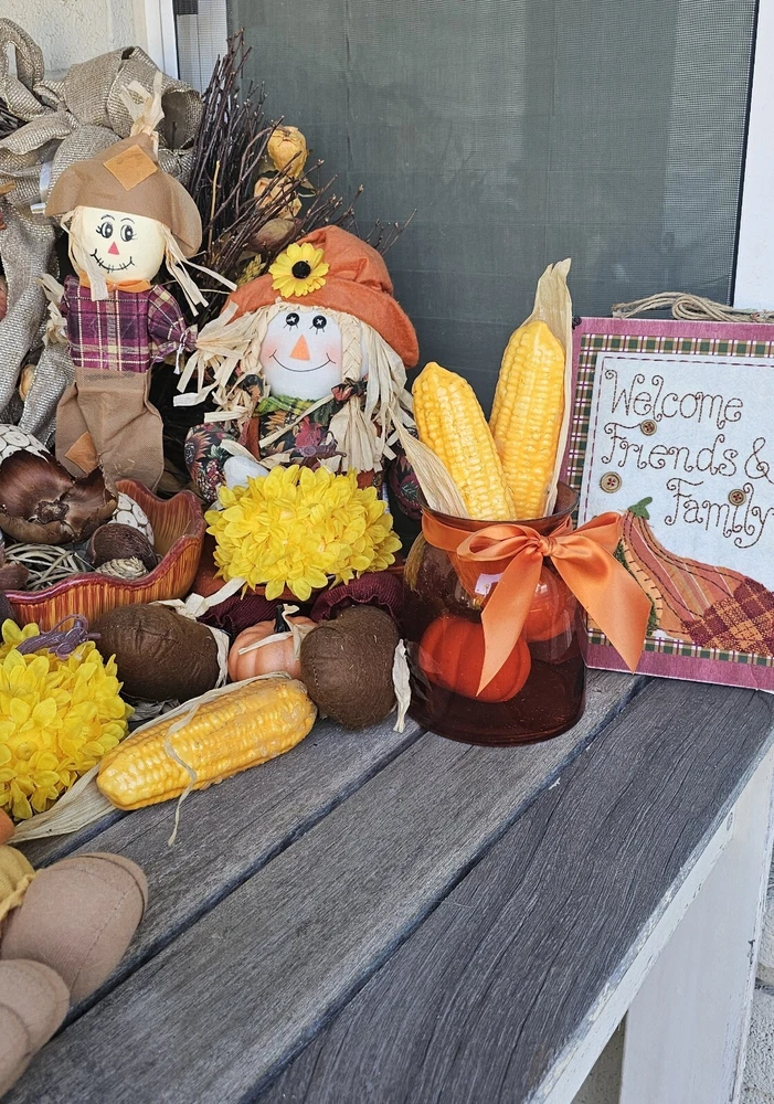 Lot of plushes, wreath, wall hangers, flowers, fake corn cobs, & so much more! Selling only as a lot. The box is crammed full but no worries...nothing in there is breakable. Glass items are not included.