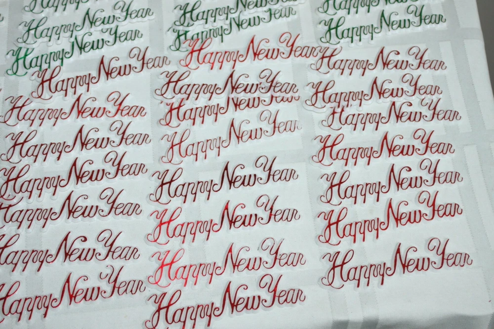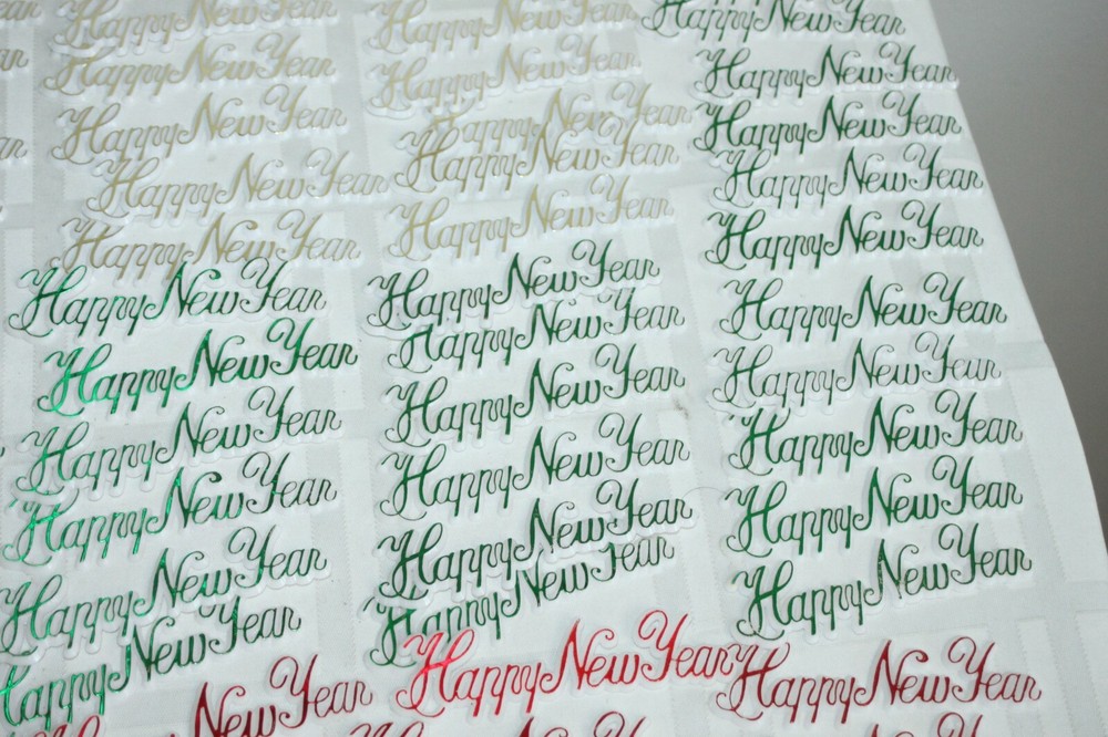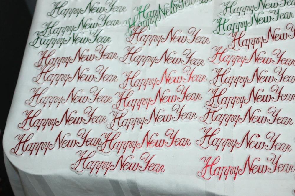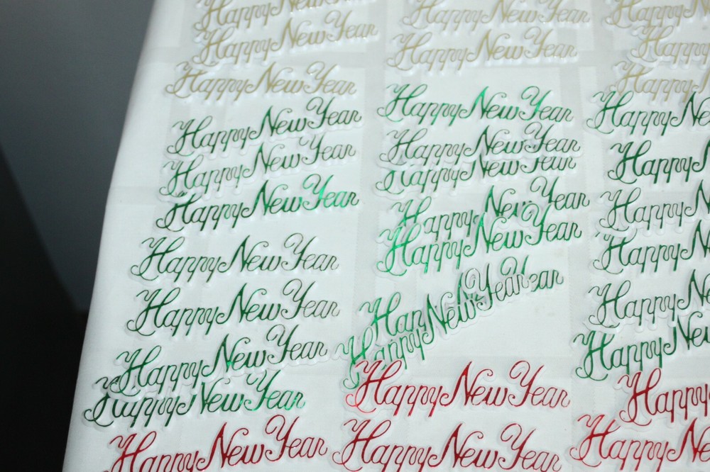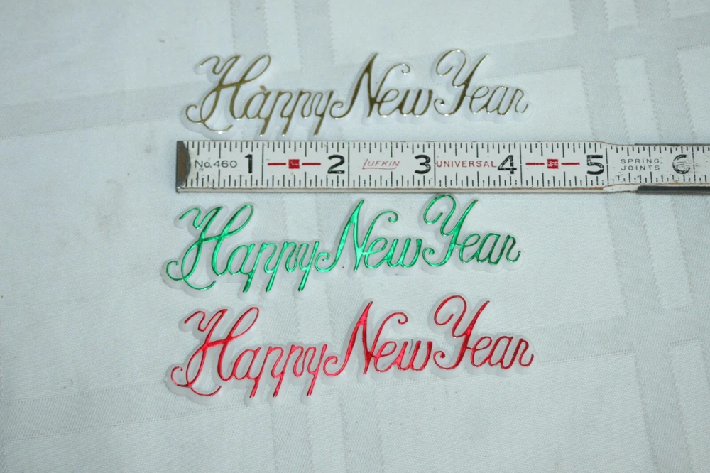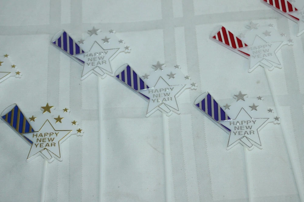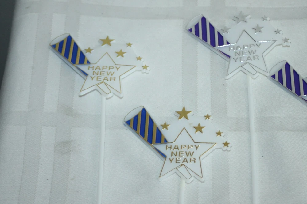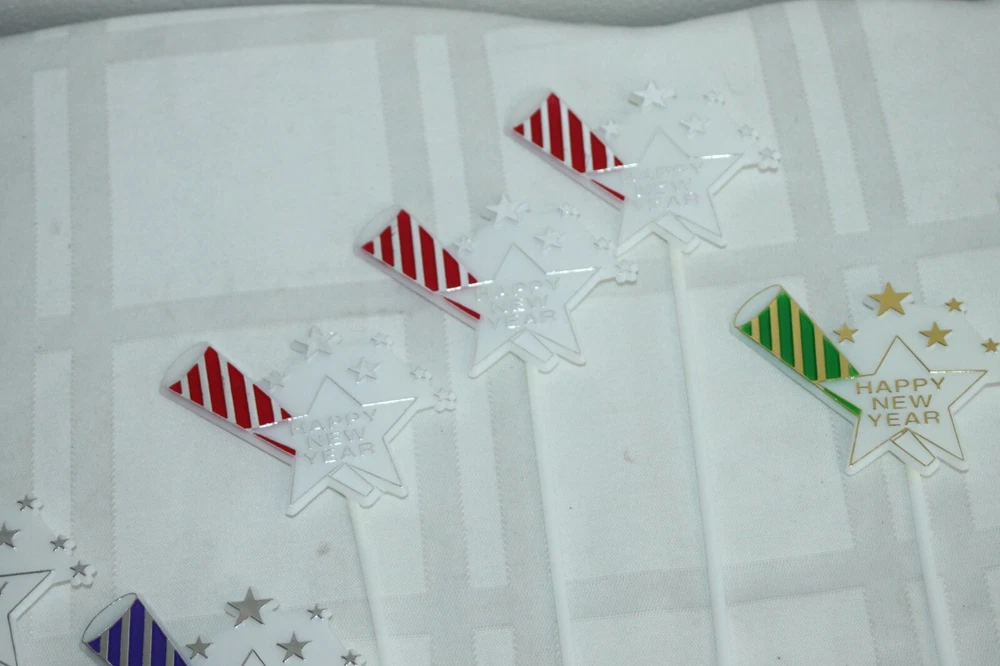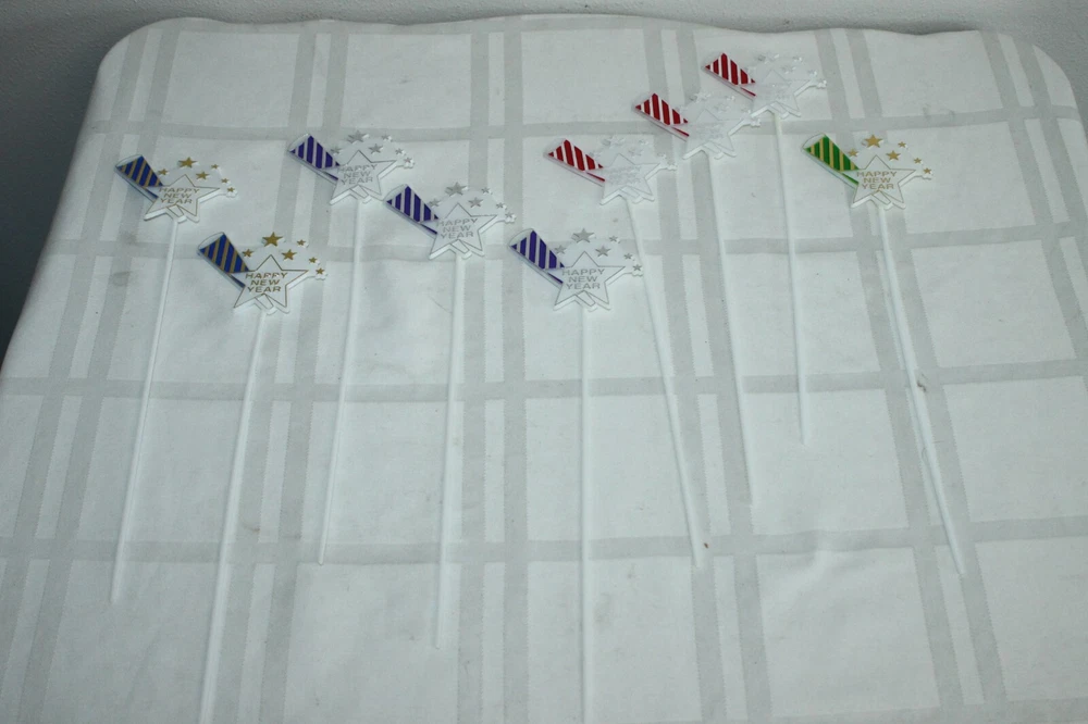 This is a big lot of plastic Happy New Year cake topper scripts. There are two different styles and different colors in each style. These are new, unused, but have been in storage for a while, so not perfect. Some have areas of missing color. Here is a list of all included: Happy New Year flat scripts, White plastic with metallic lettering - measure 4" long. 1) Red - 34 2) Green - 37 3) Gold - 33 Star and horn on long skewer - measure about 11" tall - decor piece is 2" x 3". 1) Green - 1 2) Blue - 2 3) Purple - 3 4) Red - 3