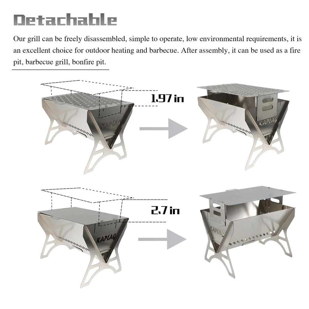 【Detachable】Our grill can be freely disassembled, simple to operate, low environmental requirements, it is an excellent choice for outdoor heating and barbecue. After assembly, it can be used as a fire pit, barbecue grill, bonfire pit. 【Perfect Size】The size after assembly is 40*26*27cm, It can prepare food for 2-3 people at the same time. 1mm thick stainless steel plate makes it stable. 【Premium Material】The grill body is made from heavy-duty iron, and Come with a food 304 Stainless steel grill and a plate. 【Easy Assembly】: with the steps in the video and description; the installation is quite easy, within 5mins you have your grill ready. 【Multi-Usage and Easy to Carry】:Except for use as a grill, it can also be used as a fire pit, It is a must have for camping lovers. Each grill come with a carry bag, It is compact and easy to take with you everywhere.