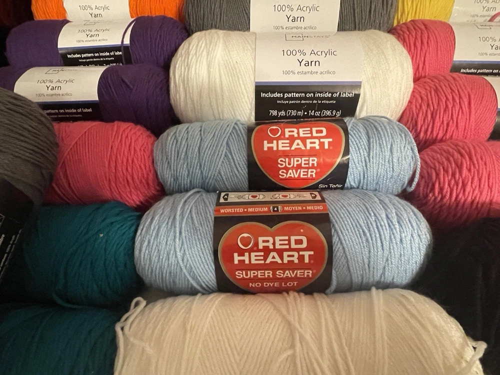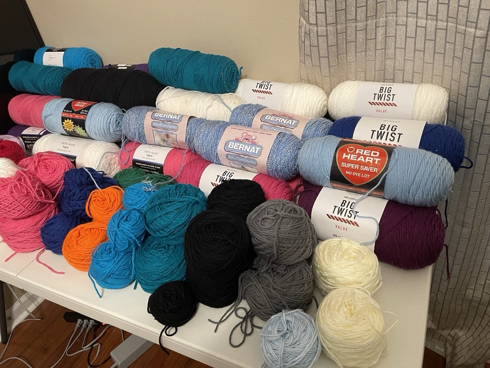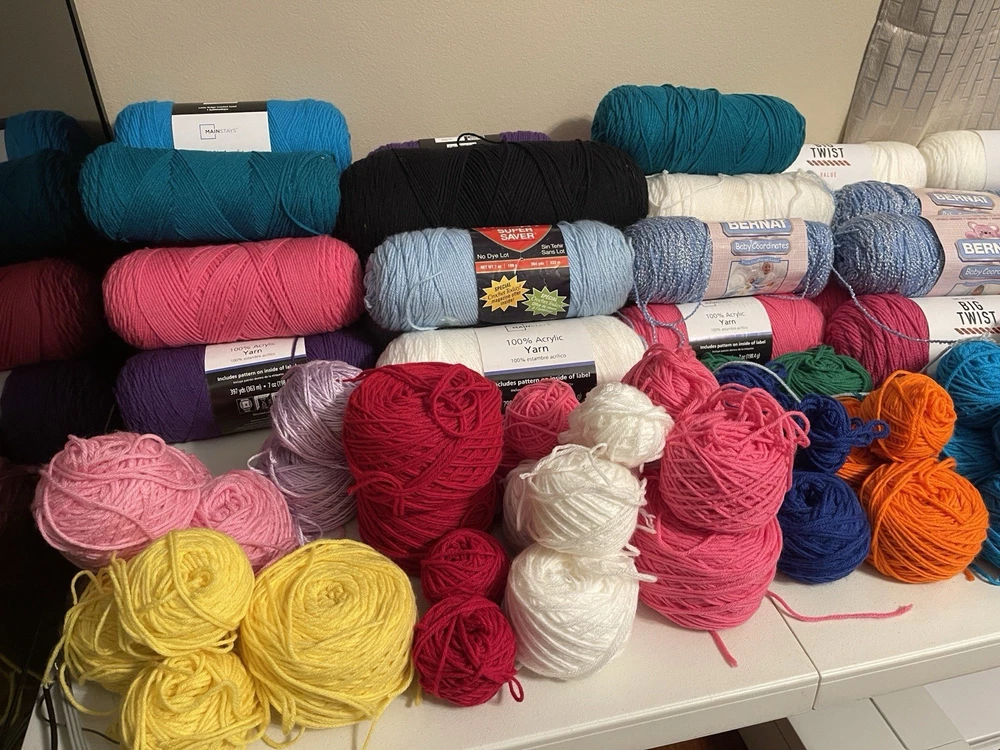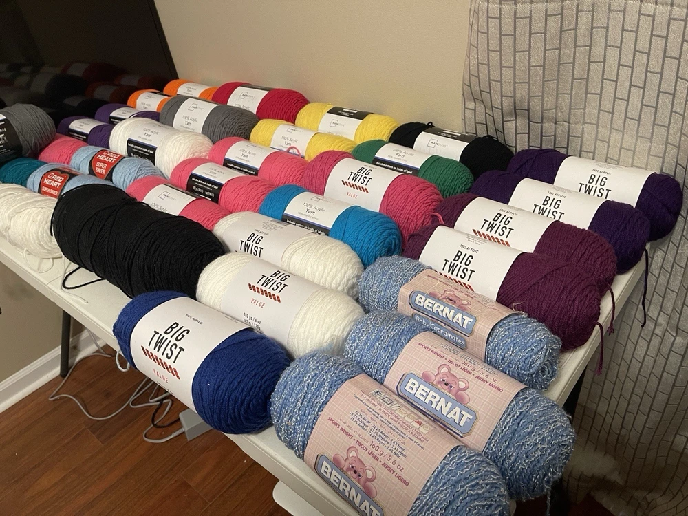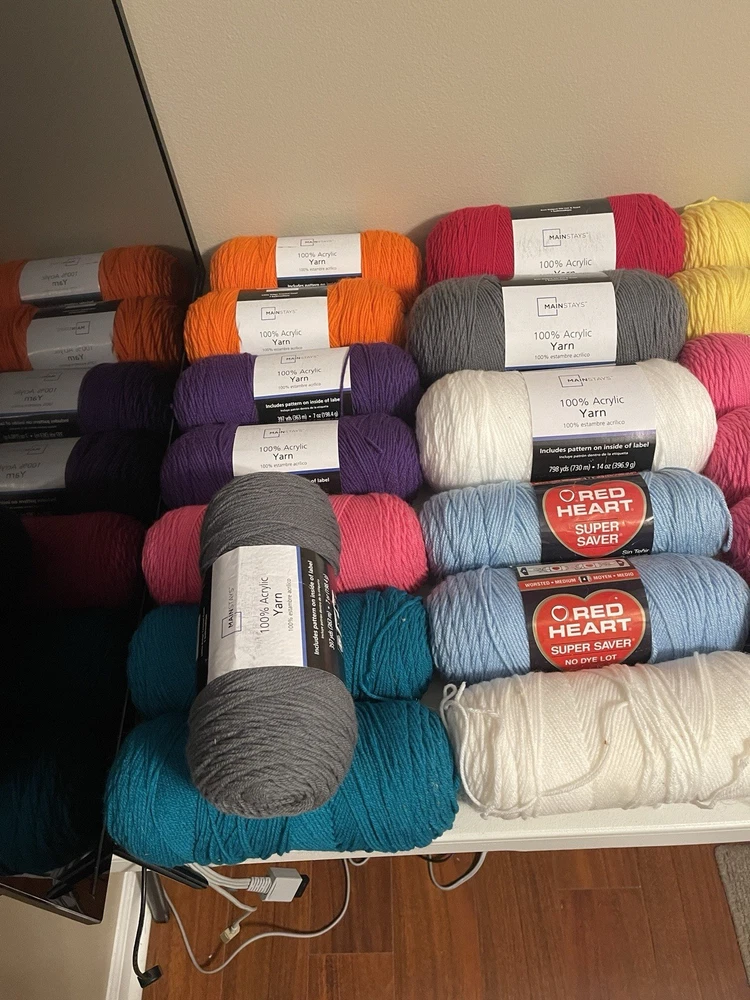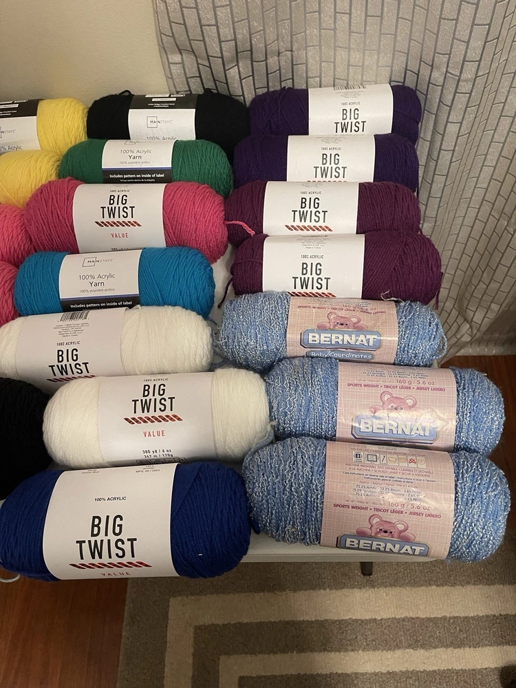 This bundle has a total of 34 new skeins. A breakdown of which 2 Red Heart brand, 3 Bernat, 8 Big Twist, 16 Mainstays (3 of those are jumbo size), and 5 unmarked because the label is missing. There is also a huge amount of yarn cakes that are made as well. The total weight of everything is 24lbs. This is being sold AS-IS. One white skein does have very light staining. See photos for details.