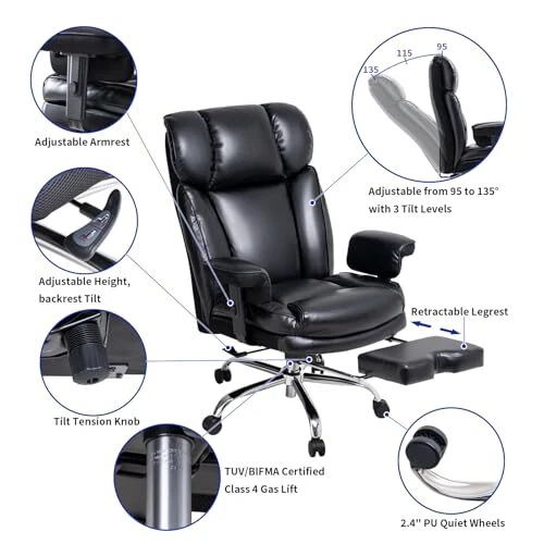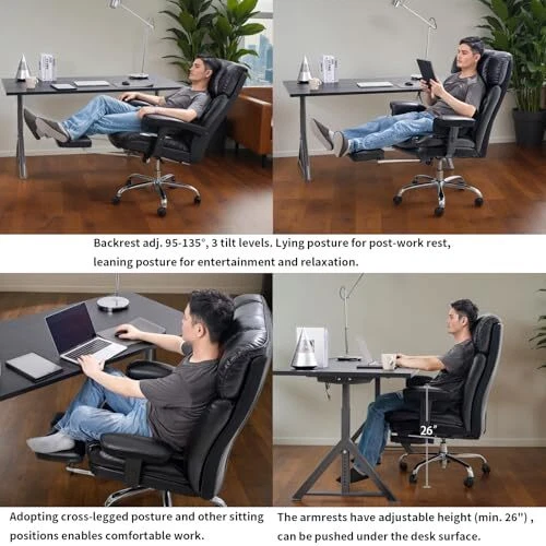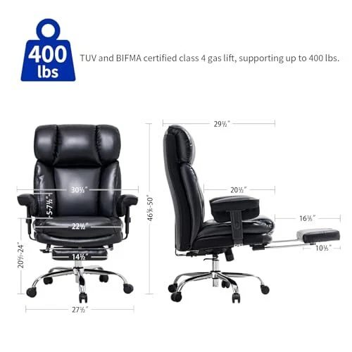 Menu 1. We require immediate payment. 2. We currently accept payment via eBay managed payments only. 3. Once payment is cleared, we will dispatch your shipment within 1-3 business days. Please refer to the "Shipping" tab for more information regarding shipping speed to your destination. Big and Tall Office Chair 400lbs, Wide Seat, Telescoping Leg Rests, Adjustable Armrests - Comfortable Office Chair for Lower Back Pain, Black Heavy-Duty Leather Office Chair Product description Built to Withstand Heavy-Duty Use - This big and tall chair, equipped with a 4th level gas lift certified by TUV and BIFMA, office chair 400 lb weight capacity, making it an ideal choice for heavy-duty use, Office chairs for heavy people Comfortable Design - Ergonomic office chair designed for back pain relief. Experience unparalleled comfort with our padded office chair featuring high-density foam and high-loft fiber, ideal for long hours of work, study, computer use, or gaming Multifunctional Adjustability - Enjoy the versatility of adjustable seat height and 360° swivel function. The backrest can be adjusted from 95 to 135° with 3 levels, and a tension knob. The telescoping leg rests offer diverse sitting and reclining Adjustable Armrests - This heavy duty office chair ensures complete relaxation for both arms. The armrest has 4 adjustable heights, with the lowest being adjustable to 26 inches so they can be pushed below the desktop without any interference Quality Materials - Durable, breathable leather office chair that is easy to clean. Features 2.4" large diameter swivel wheels for silent movement and floor protection. Ideal for home office desk chairs, and executive office chair PLEASE MESSAGE US IF YOU HAVE ANY OTHER QUESTIONS, AND MANY THANKS FOR READING ALL OF THIS. Copyright ©#. All Rights Reserved.