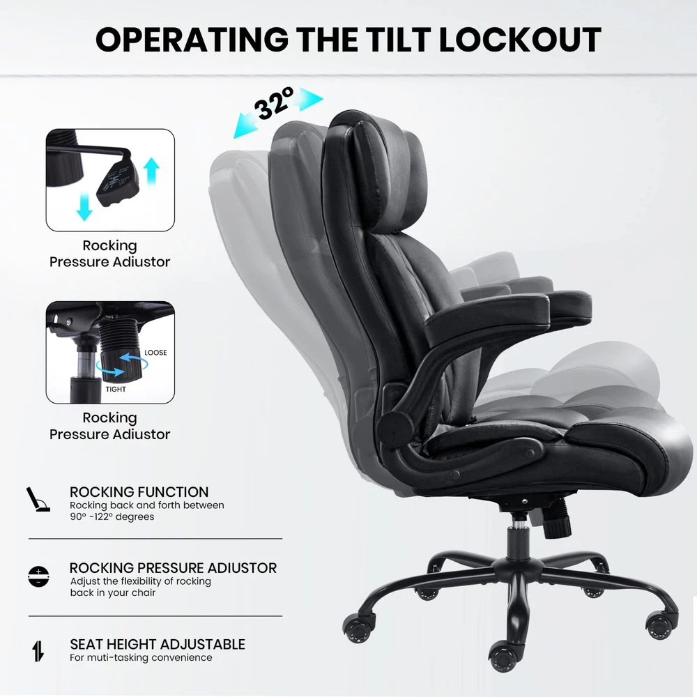 Products detail: Material: Fabric Upholstery Color: Black Capacity: 500 lbs Seat Size: 23.2"W × 22"D × 3.5" Thick Seat Height: 18.3"-21.4" Back Height: 29.5" Overall Size: 29.1"W × 29.1"D × 42.7"-45.8"H Features: Rocking 90°-122°, Flip Arms, Lumbar Pump, 360° Swivel Features: 【Strong Load Bearing】Built to hold up to 500lbs for heavy duty use 【Breathable Fabric】Durable black fabric keeps you cool while working 【Recline Comfort】Tilt function with rocking tension adjuster 【Flip Armrests】Easily slide under desk to save space 【360° Swivel Base】Move smoothly with silent caster wheels On Sep 22, 2025 at 00:13:56 PDT, seller added the following information: