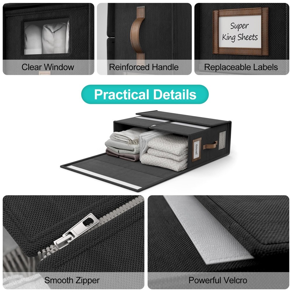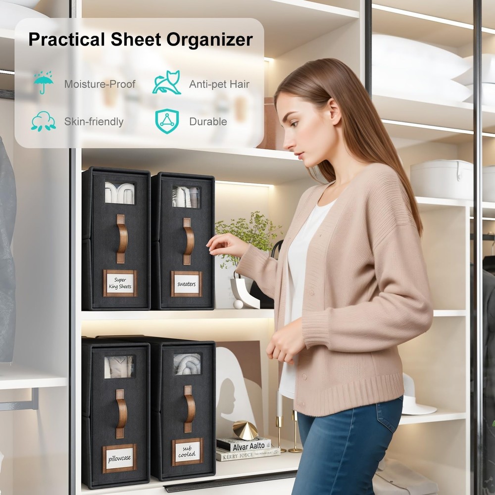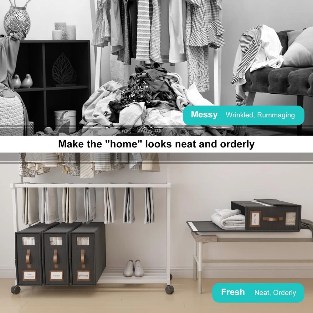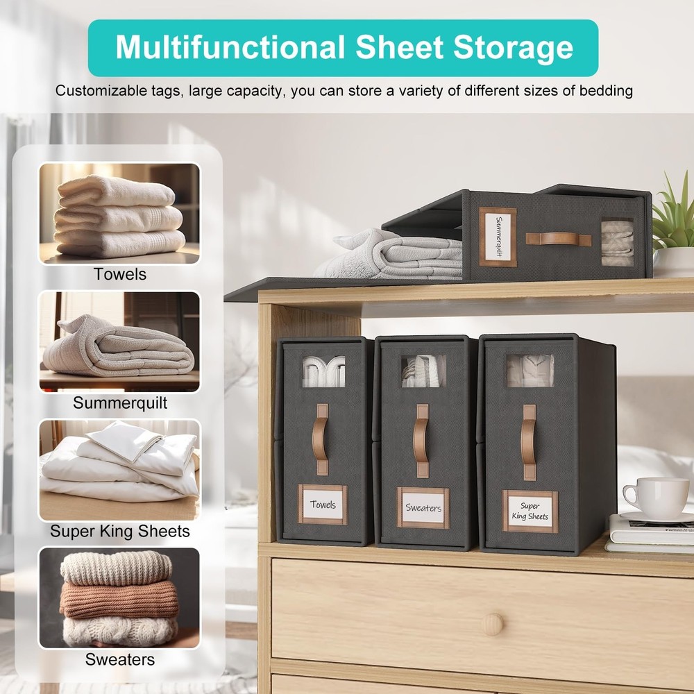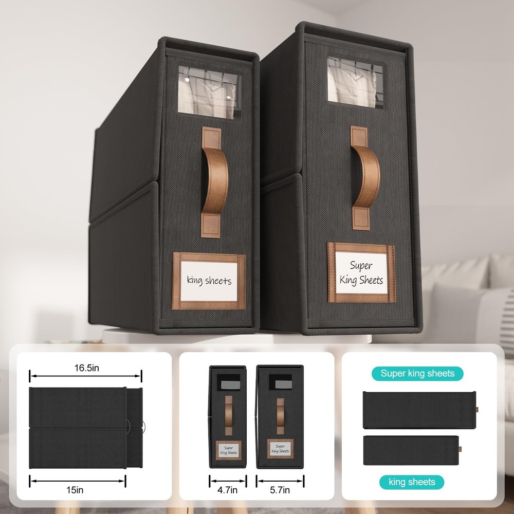 BigPonPon 8 Pack Foldable Bed Sheets Set Organizers and Storage(Cal King Size),Linen Fabric Closet Organizers with Window,Folding Bedding Storage Box for Bedsheets and Pillow Cube Organizer-Black Product Details Color: Black Size: 8 Pack-Cal King Size-5.2 Gal Brand: BigPonPon MPN: XCDSN-001 UPC: Does not apply EAN: Does not apply Brand: BigPonPon Color: Black Material: Linen Special Feature: Foldable Style: Modern Brand: BigPonPon Color: Black Material: Linen Special Feature: Foldable Style: Modern Recommended Uses For Product: Clothes Product Dimensions: 16.5"L x 12.5"W x 5.7"H Water Resistance Level: Not Water Resistant Item Weight: 14 Pounds Opening Mechanism: Lift-Off Lid Number of Compartments: 1 Unit Count: 1.0 Count Item Weight: 14 pounds Manufacturer: BigPonPon Item model number: XCDSN-001 Number of pieces: 1 Batteries required: No Save Energy, Save time, Save SpaceFoldable bedding organizer are easy to operate, three-step efficient storage of bed sheets, avoiding repeated folding and long time rummaging, saving time and energy. Sturdy bed sheet folder organizer, stackable, arrangeable, tidy closet, save space, release more storage space. Visible PVC Window, Label & Handle, Easy To UseTransparent window and label help identify items, take them accurately, and avoid repeated rummaging and folding. Reinforced leather handle, portable, easy to take out and store in daily life, easy to use. Protect Your PropertySheet storage organizer has a solid structure and will not collapse or deform, and items will not wrinkle or deform due to extrusion and stacking. Bedding storage is dust-proof, and pet hair-proof, better protect your bedding, and enjoy a clean and comfortable home life. Multifunctional Sheet OrganizerSheet storage can store sheets, pillowcases, duvet covers, duvet covers, banquet table skirts, sofa covers, bed curtains and other items. Cube shape, suitable for storage in drawers, wardrobes, closets, storage racks, storage cabinets and other places, beautiful and stylish. Premium Non-woven FabricFolding bed closet is made of strong non-woven fabric, which is dust-proof. Breathable fabric, keep air circulation, keep your items clean, neat and orderly. Bed Sheets Set Organizers and Storage
