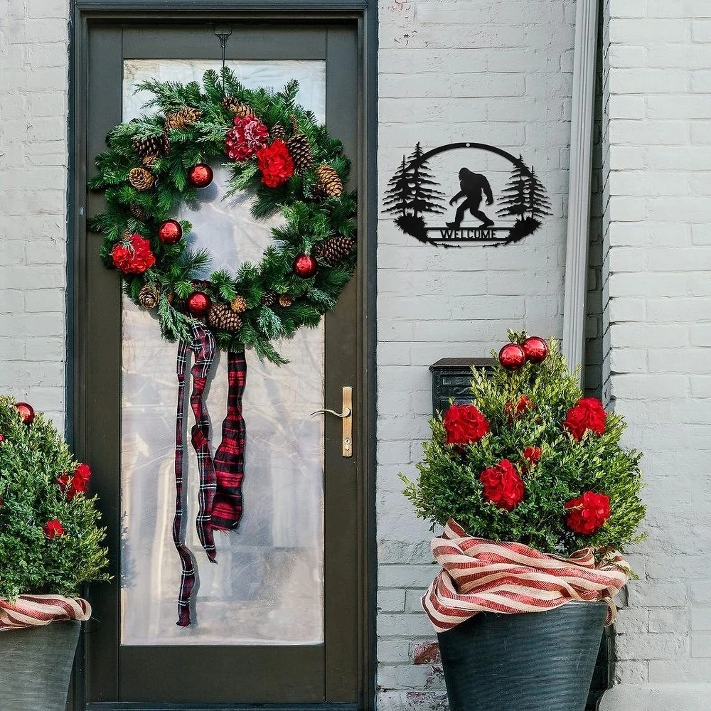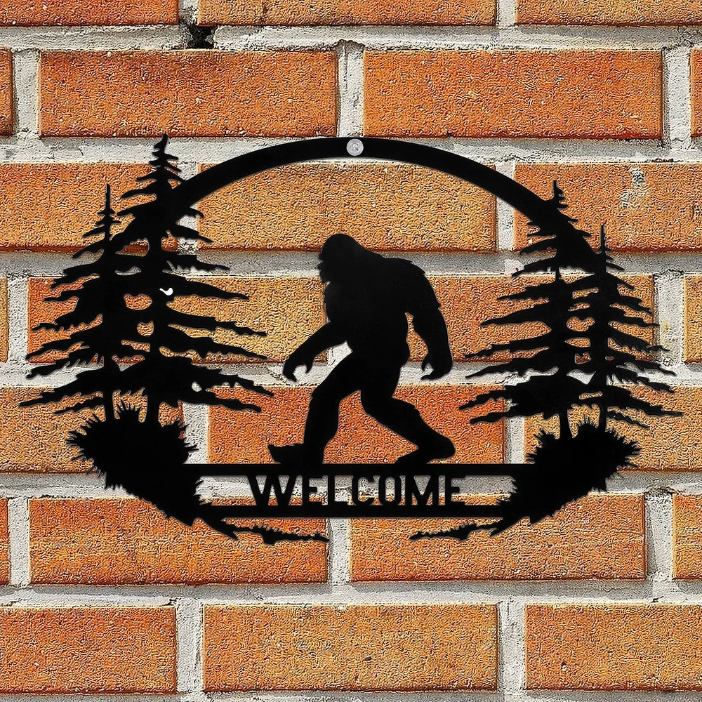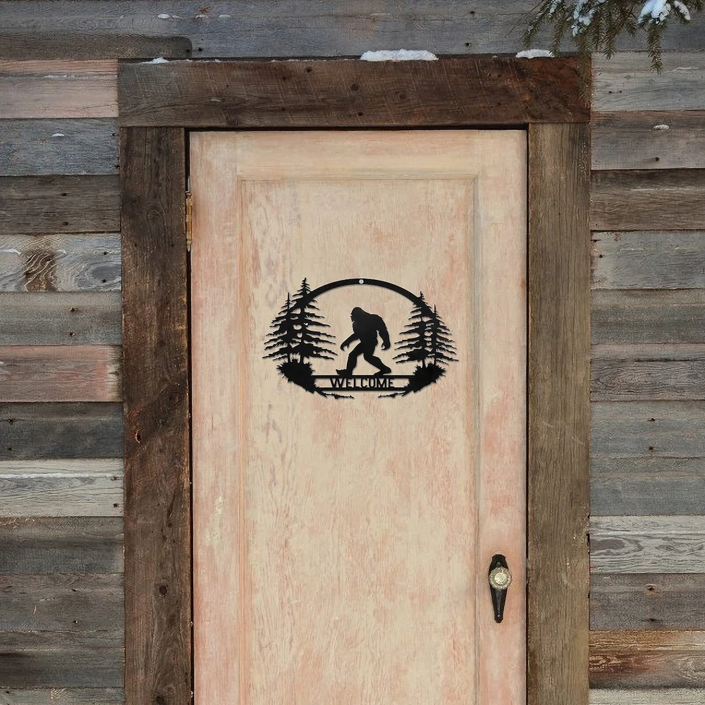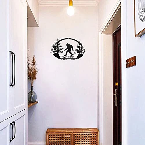 Welcome Bigfoot metal wall hanging ornament make home wall & door decoration rustic and farmhouse. Excellent gift for housewarming, weddings, anniversaries, Christmas, birthday. The wall hanging Bigfoot can be indoor and outdoor decoration, perfect for Living Room, Bedroom, Kitchen, , or Decorate It on Front Doors, Patio, Porch , Eaves, Pool Areas, Barns/workshops, Gates, and More Made of metal with black paint. Dimension: 13.8 x 8.7 inches WELCOME BIGFOOT SIGN - A sasquatch walking in the forest with pine trees and a WELCOME bridge, this special heteromorphic bigfoot wall art is very awesome for farmhouse decor and a great addition to your Christmas decoration Wide APPLICATION - You can hang the bigfoot wall art indoor and outdoor. It is perfect as a front door welcome sign, and also perfect decoration for Living Room, Yard, , or Patio, Porch, Eaves, Pool Areas, Barns/workshops, Gates, and More EASY TO INSTALL - There is a small hole on the top of the bigfoot art decor, you can hang it on the wall and door with nails or ribbon. The wall decor is not heavy, you can also stick it to the wall with thick double-sided tape METAL WALL ART - This bigfoot hanging ornament is made of heavy-duty iron, which is very reliable and hard. Be Careful with Sharp Parts Finished with blac paint that rust-resistant, suitable for the outdoor decoration DIMEASIONS - The size of the art decor is 13.8 x 8.7 inches, and the thickness is 0.04 inch. Large bigfoot art decor is great for porch welcome sign and patio or yard decoration