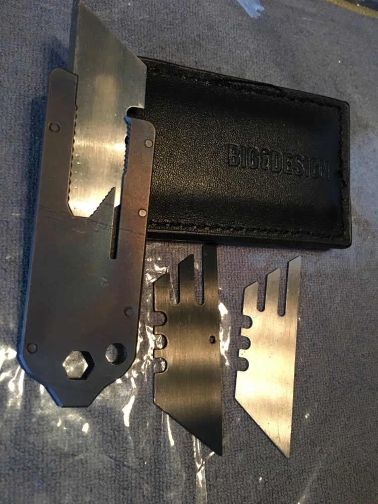 Bigidesign titanium razor knife multi tool flame ano bottle opener camping fork blade 1/4 inch bit holder prybar lanyard hole snail trail on front