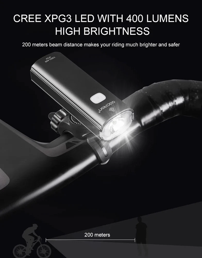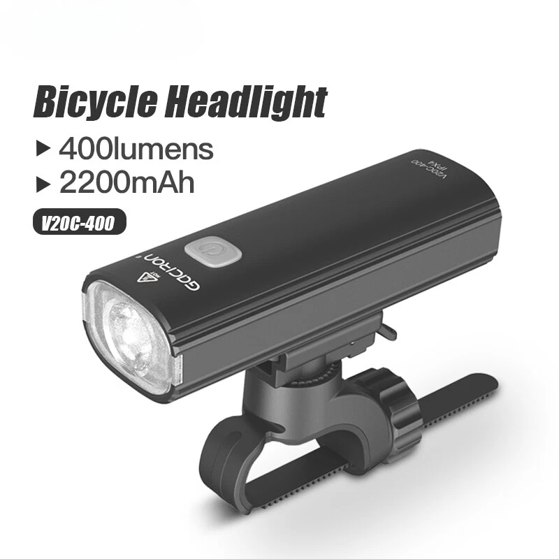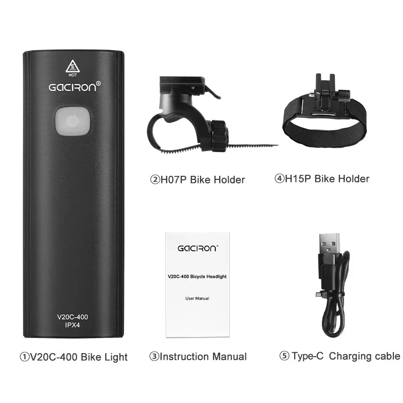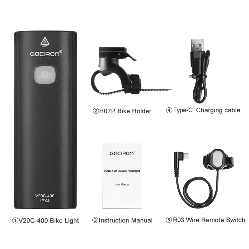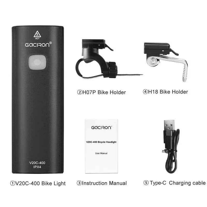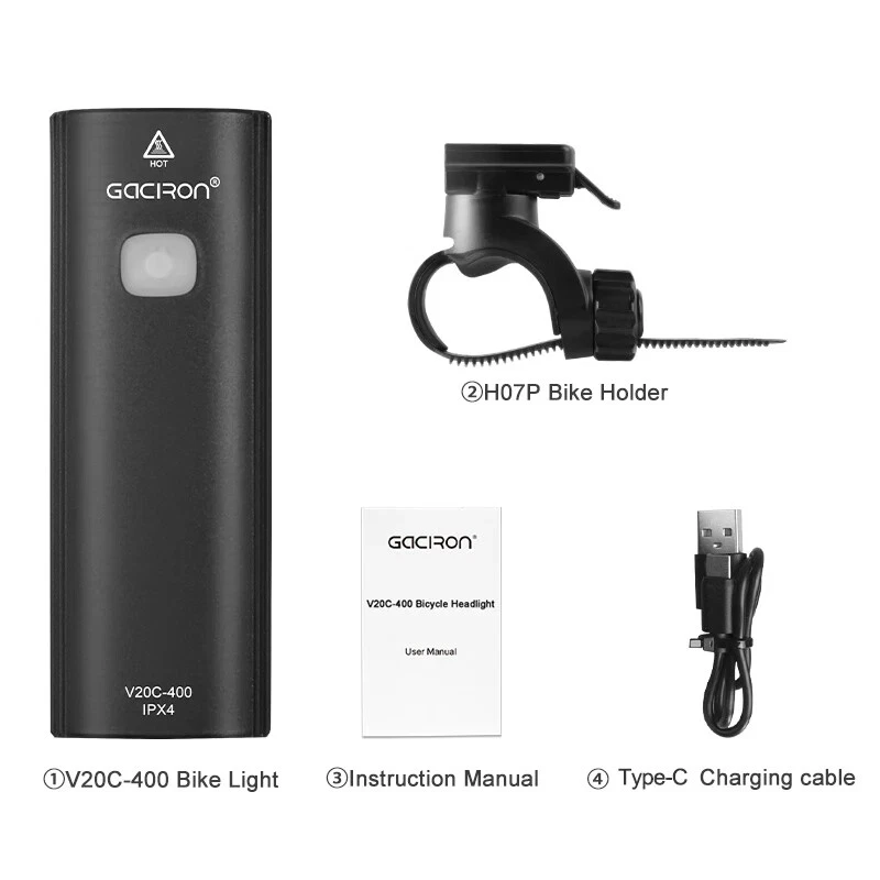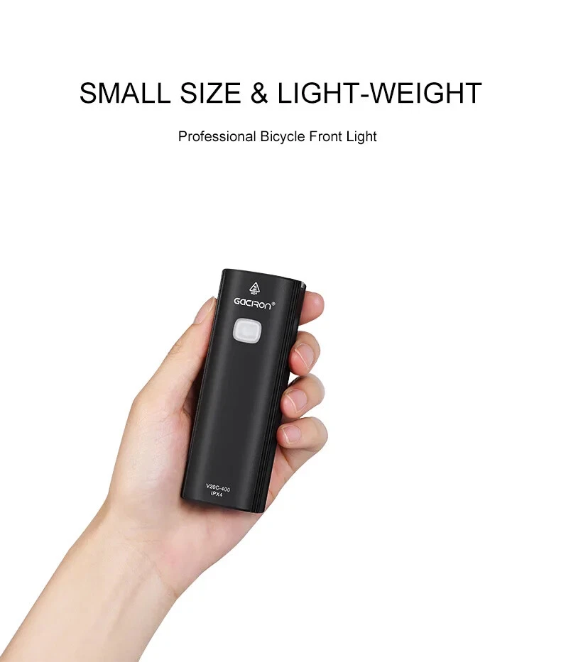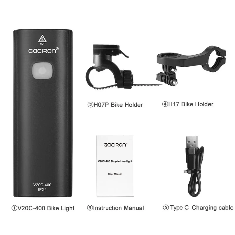 Bike Light V20C 400 Rechargeable Bicycle Front Lamp Waterproof Bike Headlight Helmet/Handlebar Light Bike accessories Specifications: Product name:V20C-400 Main LED:CREE XPG3 Max Brightness:400Lumens Floodlight Angle:118° Battery:1*18650 Lithium 2200mAh Input:Type-C 5V/1.0A Beam Distance:>200m Waterproof Level:IPX4 Net Weight:About 99g Size:99*35*32mm Material:Plastic Body Charging Time:3hrs Features: 400LM High Brightness 118°Floodlight Angle IPX4 Waterproof Compact & Light-weight USB Rechargeable Max 24hrs Working Time Symmetry Light Spot Design Support R03 Wire Remote Control Package List: 1*V20C-400 Bicycle Headlight 1*H07P Holder 1*USB Cable 1*User Manual 1*Packaging Box Notice: 1,New Upgrade!!! Floodlight Angle: upgraded from "95°" to ">118°"; Input: upgraded from "Micro 5V/0.7A" to "Type-C 5V/1.0A"; Wire Remote Control: upgraded from "R01" to "R03".(R03 wire control products need to be purchased separately.); Charging Time: upgraded from "3.5hrs" to "3hrs". 2,The net weight is only 99g, which is specially compact & light-weight, which does not burden the rider too much and increases the riding experience. 3,The waterproof function of V20C-400 needs to be used with R03 wire control to be effective.The wire control port needs to be firmly connectedto ensure no water seepage. 4,The symmetry light spot designallows the installation to be above or beneath the handlebar. 5,The V20C-400 is not only suitable for the Gaciron H07P handlebar bracket (mounted above the handlebar), but also can be paired with the Gaciron H15P helmet bracket (mounted on the helmet), the Gaciron H17 bracket (mounted beneath the handlebar), and the Gaciron H18 bike fork bracket (mounted above the front wheel). H18 H17 H15P