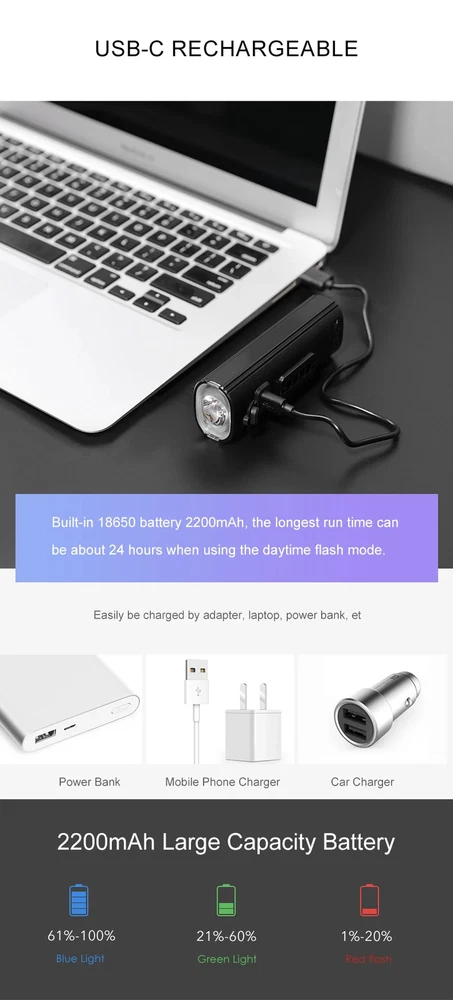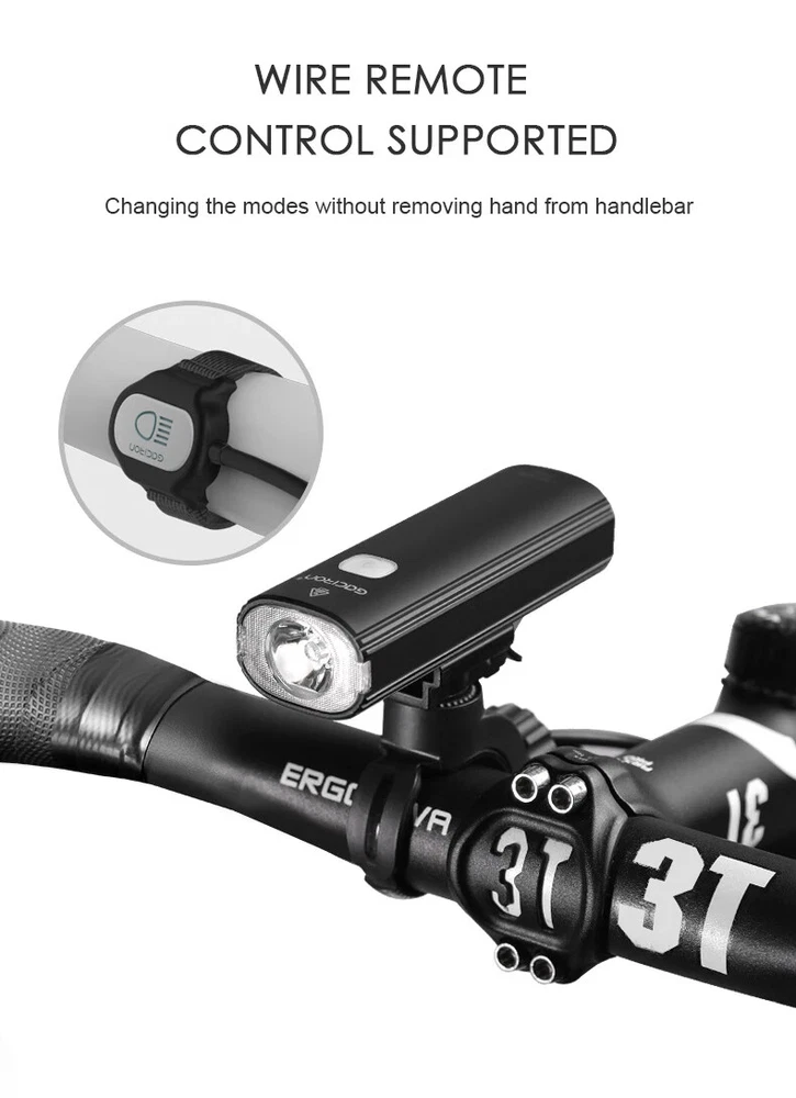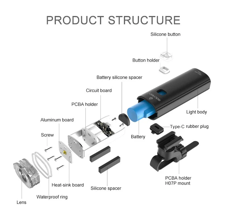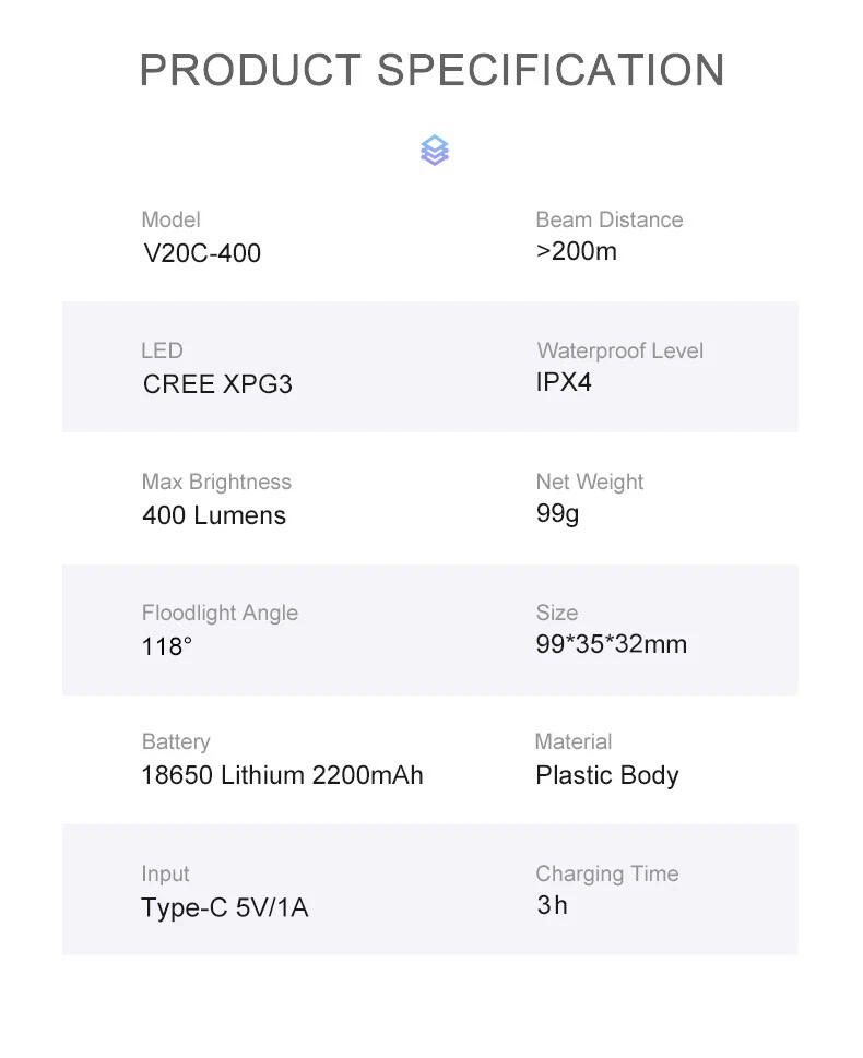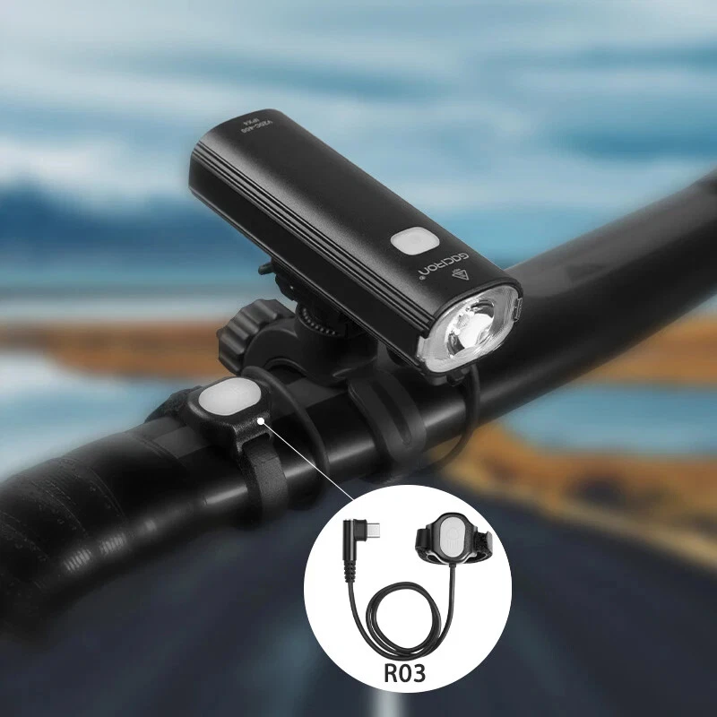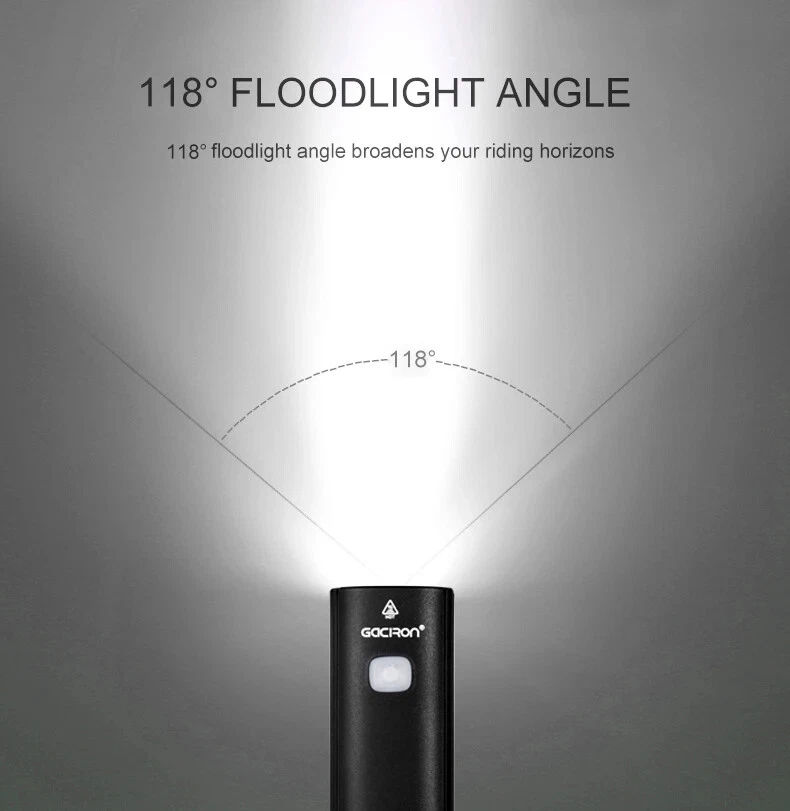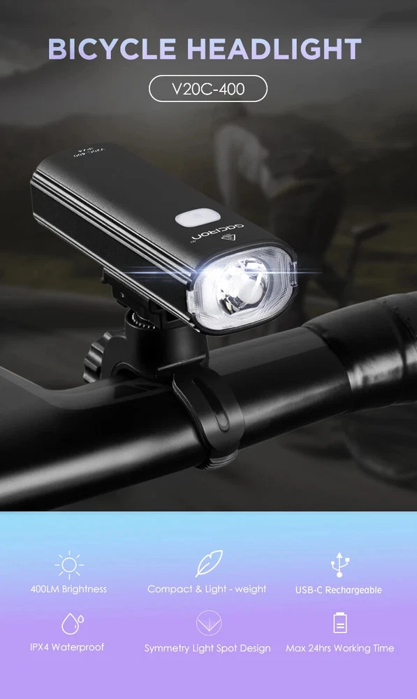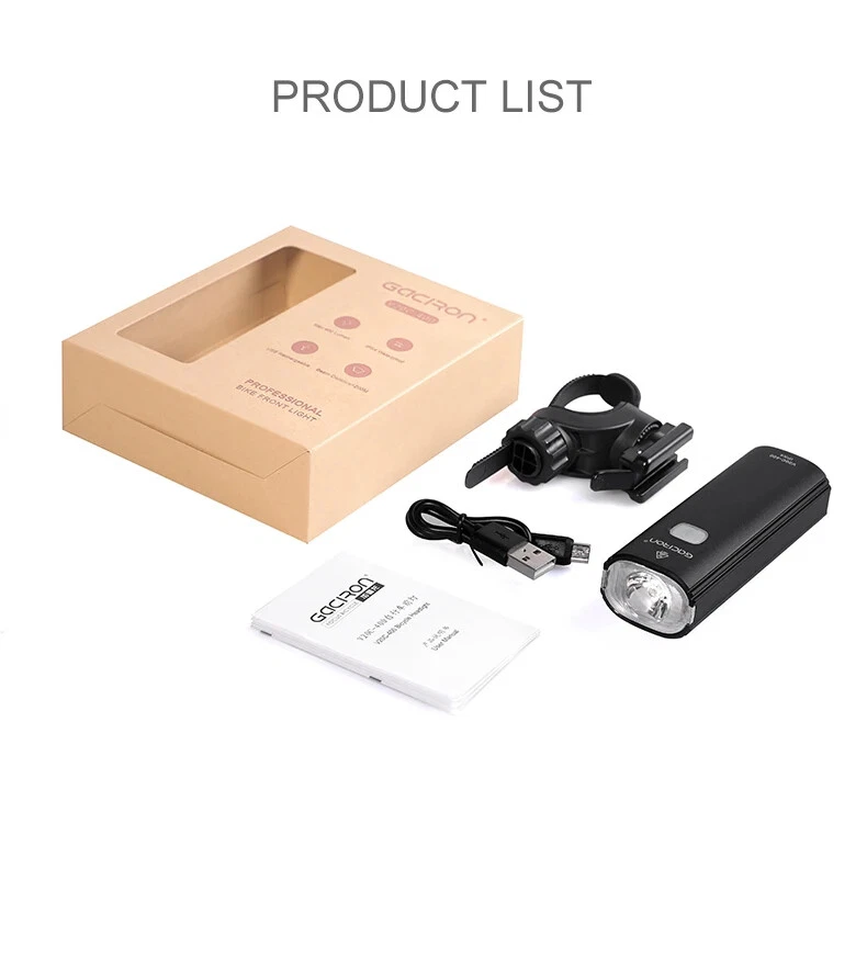 Bike Light V20C 400 Rechargeable Bicycle Front Lamp Waterproof Bike Headlight Helmet/Handlebar Light Bike accessories Specifications: Product name:V20C-400 Main LED:CREE XPG3 Max Brightness:400Lumens Floodlight Angle:118° Battery:1*18650 Lithium 2200mAh Input:Type-C 5V/1.0A Beam Distance:>200m Waterproof Level:IPX4 Net Weight:About 99g Size:99*35*32mm Material:Plastic Body Charging Time:3hrs Features: 400LM High Brightness 118°Floodlight Angle IPX4 Waterproof Compact & Light-weight USB Rechargeable Max 24hrs Working Time Symmetry Light Spot Design Support R03 Wire Remote Control Package List: 1*V20C-400 Bicycle Headlight 1*H07P Holder 1*USB Cable 1*User Manual 1*Packaging Box Notice: 1,New Upgrade!!! Floodlight Angle: upgraded from "95°" to ">118°"; Input: upgraded from "Micro 5V/0.7A" to "Type-C 5V/1.0A"; Wire Remote Control: upgraded from "R01" to "R03".(R03 wire control products need to be purchased separately.); Charging Time: upgraded from "3.5hrs" to "3hrs". 2,The net weight is only 99g, which is specially compact & light-weight, which does not burden the rider too much and increases the riding experience. 3,The waterproof function of V20C-400 needs to be used with R03 wire control to be effective.The wire control port needs to be firmly connectedto ensure no water seepage. 4,The symmetry light spot designallows the installation to be above or beneath the handlebar. 5,The V20C-400 is not only suitable for the Gaciron H07P handlebar bracket (mounted above the handlebar), but also can be paired with the Gaciron H15P helmet bracket (mounted on the helmet), the Gaciron H17 bracket (mounted beneath the handlebar), and the Gaciron H18 bike fork bracket (mounted above the front wheel). H18 H17 H15P
