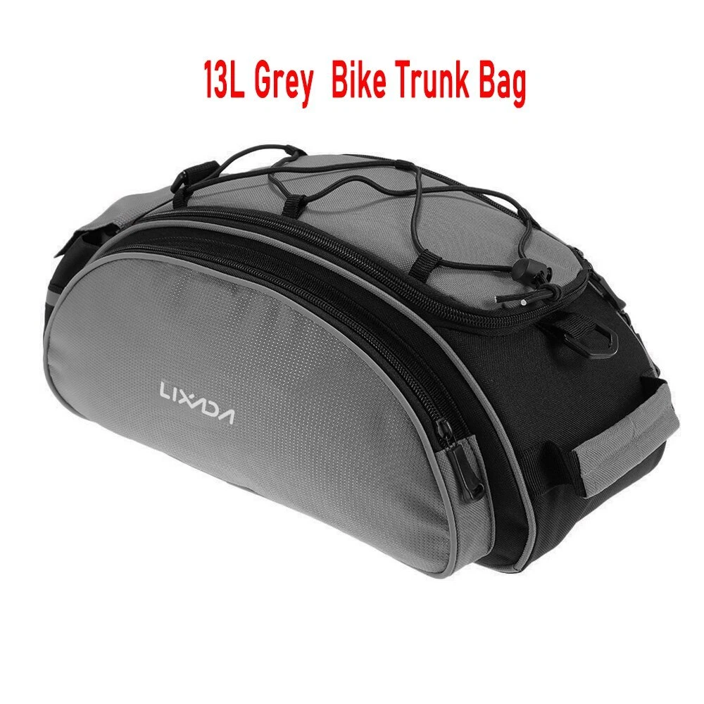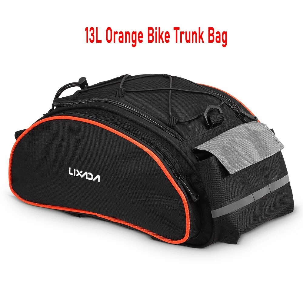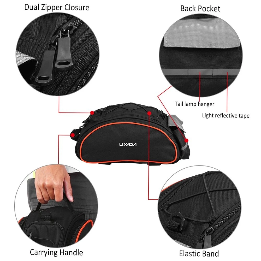 8L Black bag Quick strap-on bike rack and secure in place by fastener tape for free and pleasant cycling trip, camping and hiking, and come with detachable shoulder strap for convenient daily use~ Features: Easy strap on bike rack and secure in place by fastener tape. Detachable shoulder strap for convenient carry and daily use. Made of water repellent and wear resistant polyester. Reflective strap and taillight hanger design, very thoughtful. 8L roomy enough for your cycling stuff. Specification: Material: Polyester Capacity: 8L Size: 36 * 15 * 15cm / 14.1 * 5.9 * 5.9in Weight: 560g / 1.2lb Package weight: 575g / 1.3lb Package List: 1 * Bike Trunk Bag 1 * Shoulder Strap 13L Rack bag with Blue/Black/Grey/Orange Multifunctional bicycle rear seat bag with carrying handle and adjustable shoulder strap, can be used as handbag and shoulder bag. 13L storage capacity provides large space for your items, helpful riding essentials for any cyclist. Features: LARGE CAPACITY: This bag includes a main compartment, 2 side pockets and a back pocket, 13L large capacity, large enough to keep your essentials well organized. The internal patch pocket makes the space effectively used. HIGHER VISIBILITY AND SAFETY: The reflective strip increases nighttime visibility and the hanger on the strip can hold a taillight which can also enhance cycling safety at night. EASY INSTALLATION: Fastener strap for easy and quick installation on all types of bicycles with a rear seat, such as mountain bike, road bike, etc. MULTIPLE FUNCTIONS: With carrying handle and adjustable shoulder strap, the bag can be used as a handbag and shoulder bag as well. GOOD PROTECTION: The elastic band on the top of the bag can help to keep your water bottle, clothes or maps securely on the bag. High quality polyester material construction with solid structure and PE cotton filler, provides your items with full protection. Dual zipper closure, convenient to take out your items. Specifications: Material: Polyester Capacity: 13L (includes all pockets) Color: Blue / Black / Grey / Black & Orange (optional) Dimensions: 40 * 20 * 16cm / 15.75 * 7.87 * 6.3in Item Weight: 395g / 13.93oz Package Size: 40.5 * 20 * 16.5cm / 15.94 * 7.87 * 6.5in Package Weight: 410g / 14.46oz Package List: 1 * Cycling Bag PU leather bag Features: Made with PU leather, waterproof, durable and easy to clean. Insulated lining keeps your beverage cold or food warm for hours. Reflective elements for improved visibility and safe riding at night. Two side pockets and a top pocket for storing small accessories. Elastic bungee cord keeps your clothes or maps securely on the bag. Adjustable mounting straps with quick-release buckle for easy installation and removal. Removable, adjustable shoulder strap for convenient carrying. Specifications: Material: PU leather Dimension: Approx. 36 * 18 * 15cm / 14.2 * 7.1 * 5.9in Weight: Approx. 387g / 13.6oz Package List: 1 * Bike Trunk Bag Waterproof Bike Bag Features: Waterproof fabric and zippers,you can use the bag freely on rainy days. Reasonable main compartment,2 side zipper pockets,top zipper pocket,convenient to separate your gears neatly. Reflective loop to easily attach your rear light to the bag for safe nighttime cycling. Carrying handle provides easily carrying and hanging. 4pcs adjustable fastener straps quickly attach to your bike rack. Padded mesh shoulder strap with removable hook,allows you to use the bag as shoulder bag,chest bag and cross-body bag. Multifunctional bag can be used as bike rear rack bag,carrying bag or shoulder bag. Specification: Type: With Reflective part /without Reflective part (optional) Material: PU Size: 37 * 15.5 * 16 cm / 14.6 * 6.1 * 6.3 in Weight: approx. 337.2 g / 0.7 lb Package List: 1* Bike Rear Rack Bag 25L Black bag Description Rope seal design - Kettle cabin rope buckle for easy removal and fixing of the kettleSide P ocket extension - Supports expansion on both sides of the bag for easy expansion to meet more capacity needs of users Note: Please fill the main compartment before using the side pockets. Multiple protection - The kettle compartment is equipped with wide-brimmed lights and reflective strips, with wide reflections on both sides of the bag for double safety when riding * Rainy silvery rain cover provides safer protection for your trip Main Compartment Expansion - Open the top zipper on the main compartment to expand storage space. If you do not need, turn off the zipper. Elastic band and mesh pocket - The top of the lixada bicycle rear seat bag also has a mesh bag with a shrink strap for securing the bicycle accessory. Product specifications: Unstretched size: 35*23*19cm/13.8*9*7.5in Stretch size: 28*23*34cm/11*9*13.4in Material: High quality waterproof fabric Capacity: 25L Color: Black Packing list: 1 * Lixada Bicycle bag 1 * Rain cover 1 * Strap 7L PU Black Bike Trunk Bag Features: Made of water-resistant PU material and zippers,durable and practical. 7L capacity features on a main compartment,a zipper pocket and adjustable elastic cords. Safe reflective straps around the bag,ensures your safety when riding at night. Durable fastener straps attaching on the bike and thin protective PE foam for interior,provides more stable during cycling. (NOTE:Please add some protection for valuables.) Equipped with rain cover,protects from dirt,sand,water,rain and snow. Specification: Material: PU,PE Capacity: 7L Size: 29.5*16.5*12cm/11.6*6.5*4.7in Package weight: Approx. 300g/10.6oz Package List: 1* Bag 1* Rain Cover