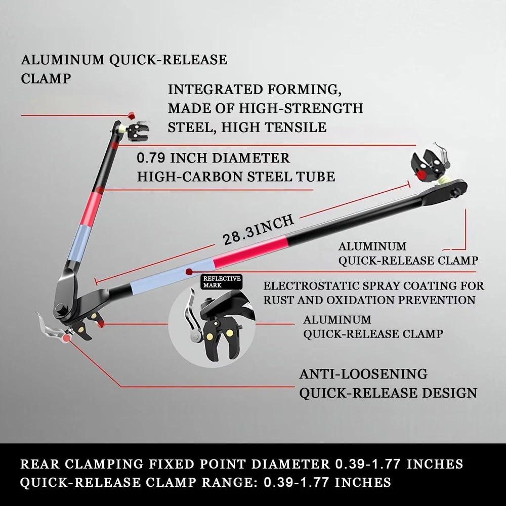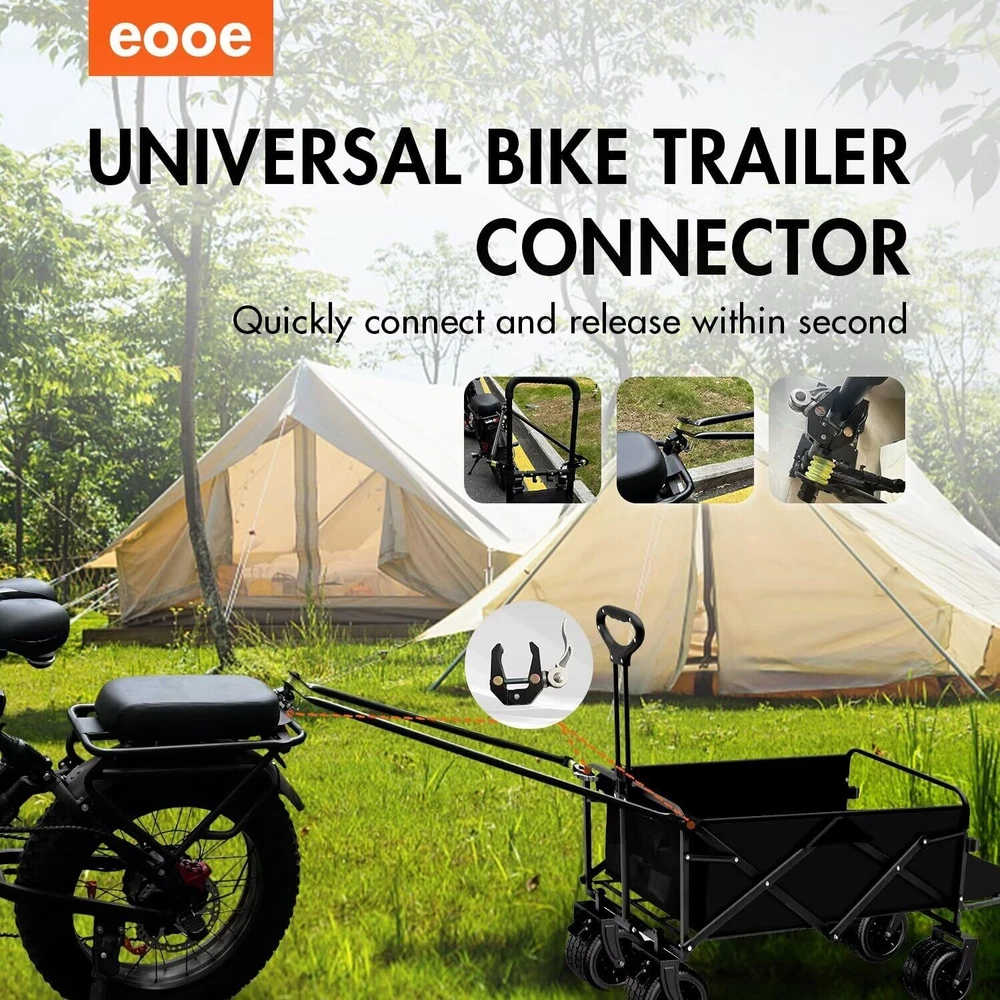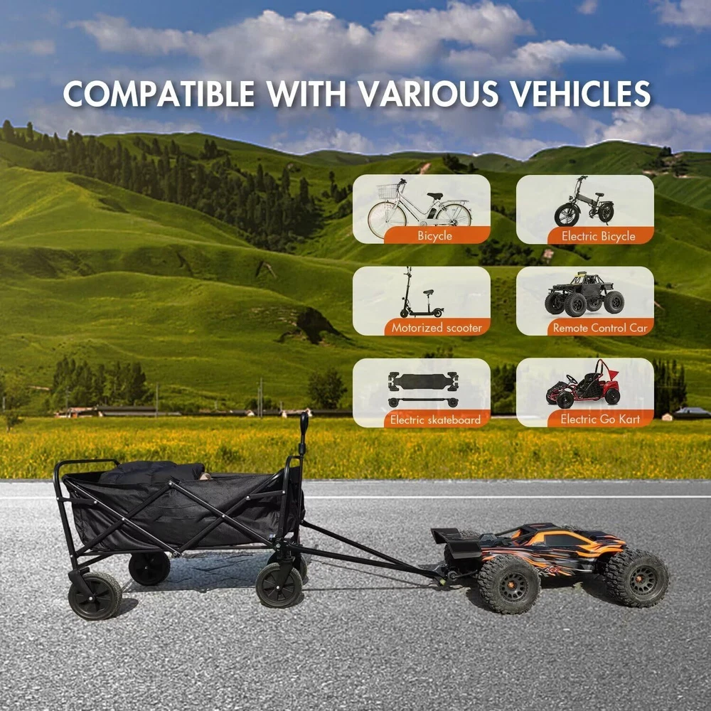 Portable and Foldable Design: This bike connector features an innovative foldable design, making it convenient to carry wherever you go. Effortlessly connect your bike or ebike and trailer for enhanced mobility during your travels.Package Contents: Trailer Connector *1, Reflective Stickers *2, Storage Bag *1. Premium Aluminum Alloy Construction: Crafted with reinforced aluminum alloy clamps and high-carbon steel tubes, our garden trailer connector ensures a robust and long-lasting connection. Experience exceptional traction and reliability, even on challenging terrain, with this ebike trailer accessory.With a payload capacity of 110 pounds, this trailer connector provides ample carrying capacity for your cargo needs. Effortless Connection and Release: With simple operation of our bike trailer clamps and couplers, you can quickly connect or disconnect your bike and cargo bike trailer, saving valuable time and energy on your outdoor adventures.Compatible with both traditional bicycles and electric bikes, it's ready for use as long as you have a rear cargo rack. Versatile Functionality: Seamlessly integrating your bike and bike trailer cargo, our connector facilitates easy transportation of cargo or shopping items, enriching your cycling experience with added versatility. Simplify your travels and diversify your adventures with this bike cargo trailer accessory. Wide Compatibility: The bike trailer hook is compatible with four-wheel, three-wheel, and two-wheel trailers, offering versatility to meet a range of needs. Note that it is not compatible with single-wheel trailers, ensuring reliable compatibility for various usage scenarios.