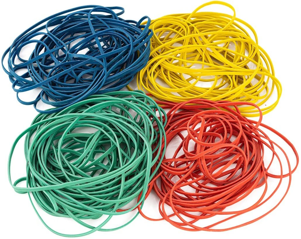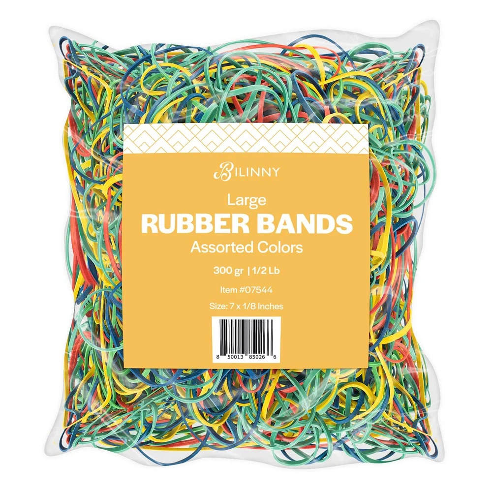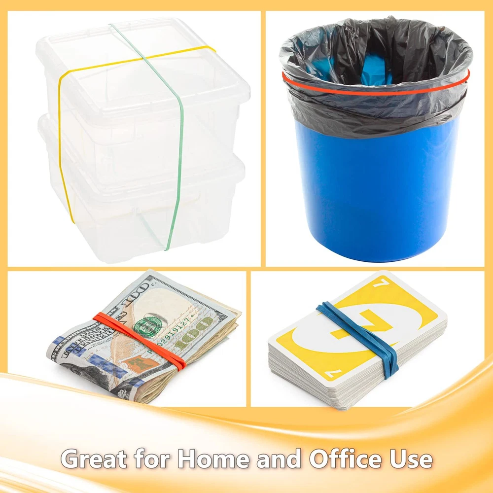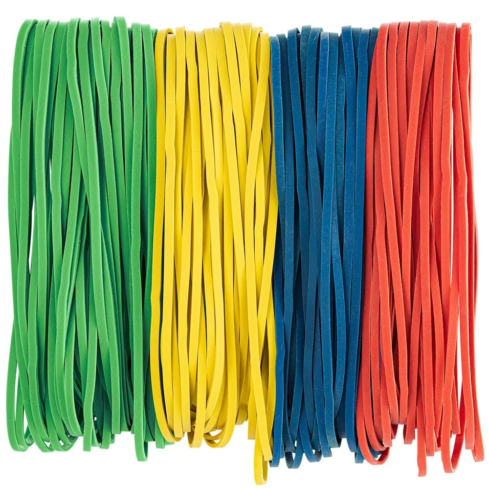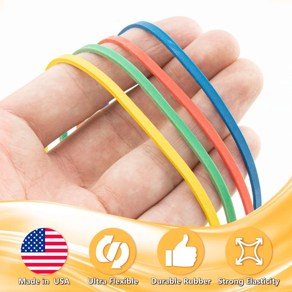 KEEP YOUR PAPERWORK ORGANIZED - Tidy up your documents and keep them all in one place. Our rubber bands variety bulk pack is perfect for sorting out your mail, folders, documents, journals, and paperwork. SECURE YOUR BOXES - Give your containers an extra seal. You can wrap these large office rubber bands round your cases or boxes to keep them from opening up, especially if you have to transport them. ENDLESS USES - Although they measure 7x1/8”, these oversized jumbo rubber bands can stretch up to 4 times their base length. You can even use them as garbage bag elastic bands to secure your trash at home. BUILT FOR HEAVY DUTY USE - Made using 1/8-inch thick rubber, you can stretch out these super strong big assorted rubber bands without them breaking or snapping apart. You’ll be able to reuse each one multiple times. MULTIPLE COLORS AVAILABLE - Our long rubber bands for files are made in the USA and come in 4 bright colors: green, red, blue, and yellow. You can color-code documents or boxes for easy identification.