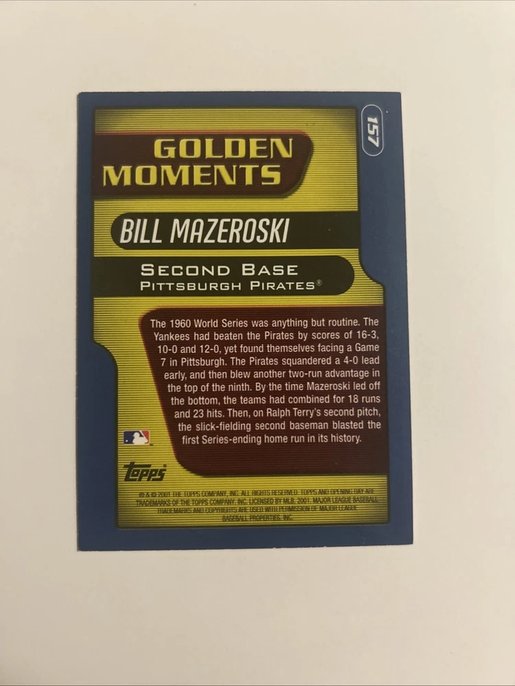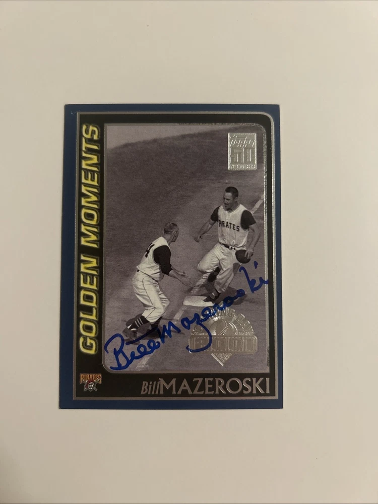 This autographed trading card features Bill Mazeroski, a legendary player for the Pittsburgh Pirates. The card is from the 2001 Topps Golden Moments set and showcases Mazeroski's signature on card stock material. It is an original piece and not a licensed reprint, making it a valuable addition to any collection. The card is part of the base set and has an autograph parallel/variety. It is numbered #157 and has a hard-signed autograph format. The card is in standard size and was manufactured in the United States. This card is a must-have for any fan or collector of baseball memorabilia, especially those who admire Mazeroski's talent and achievements.