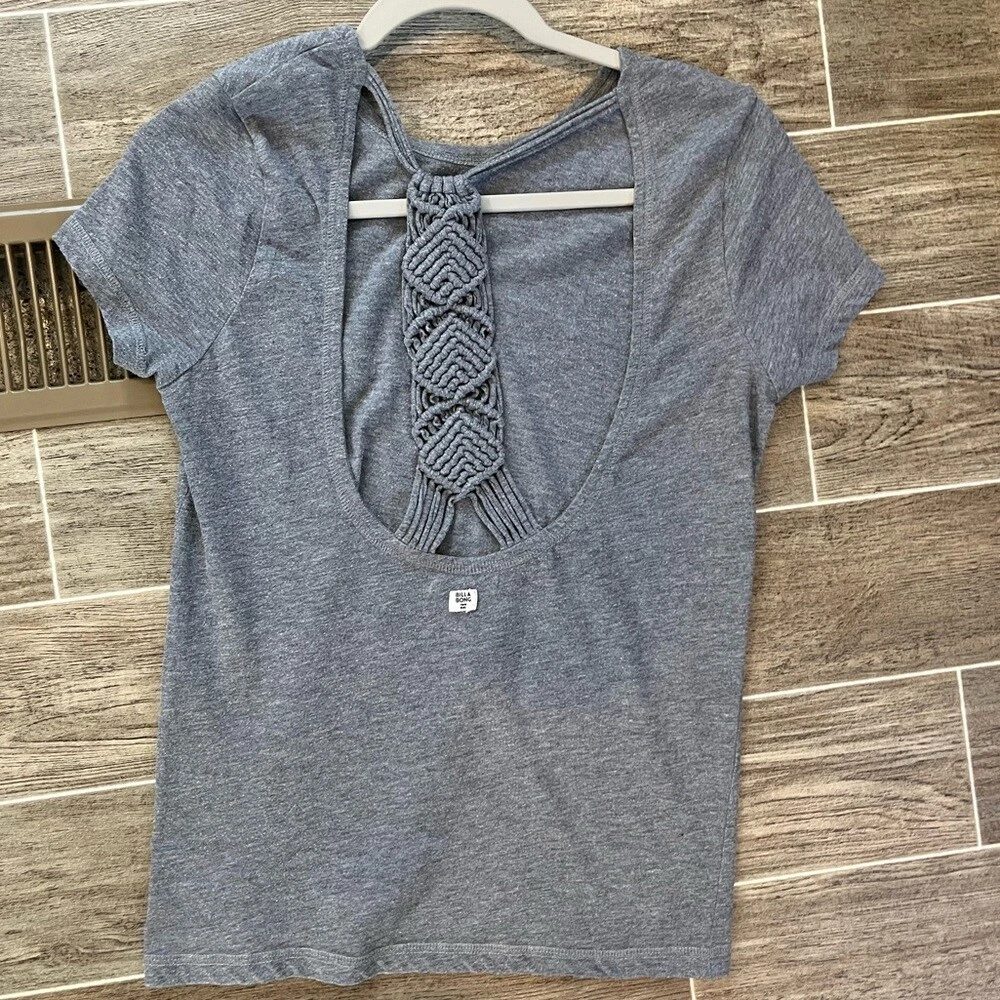 Billa Bong brand. gray summer shirt. Short Sleeve. Size s/p. Poly/cotton. Open back with nice embroidered trim. Excellent condition. Knotted in back. Gray