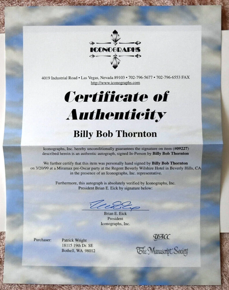 Billy Bob Thornton Original Photo Signed 10"X8" COA