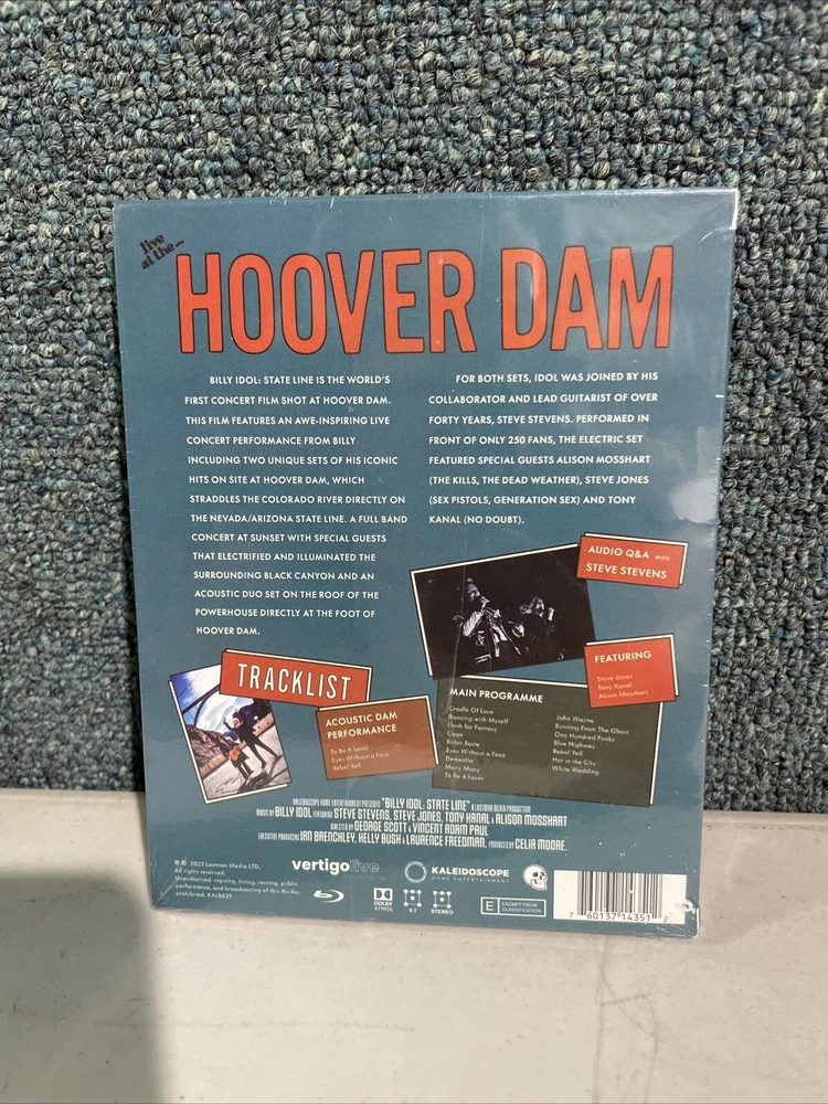 This is a Blu-ray disc titled "Billy Idol - State Line: Live At The Hoover Dam" by MVD Visual, featuring a live concert performance by Billy Idol. The runtime is 60 minutes and it is in the Rock genre. It was released in 2023 and is rated accordingly. The disc is Region A and contains music video content.