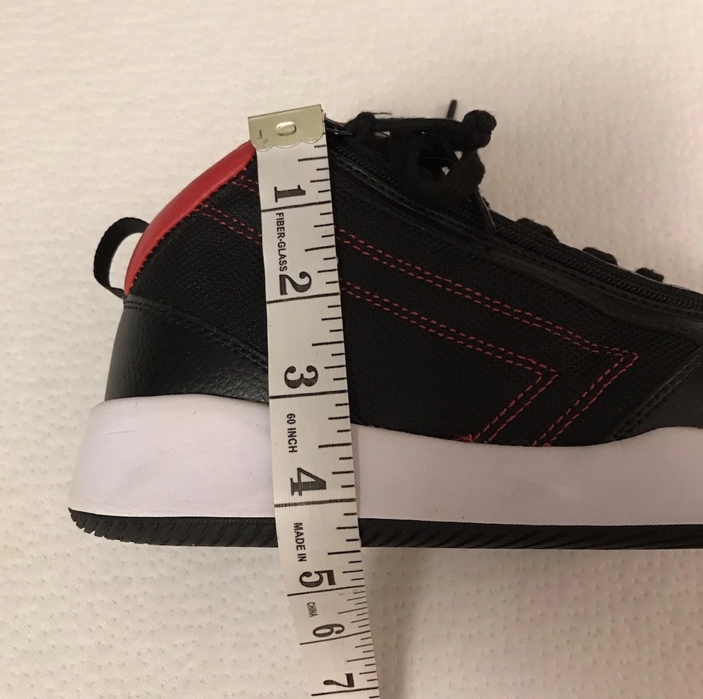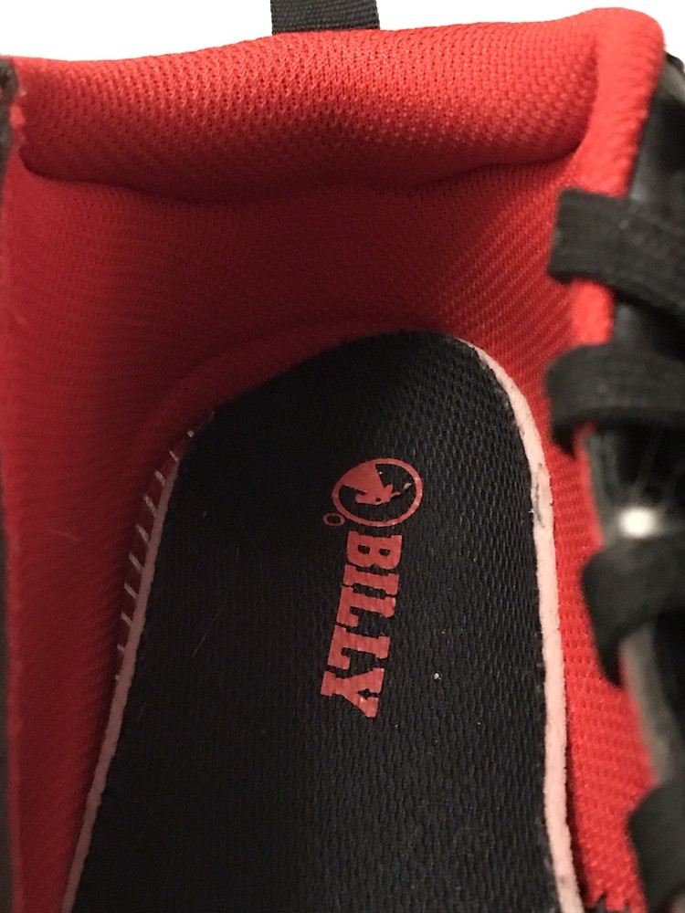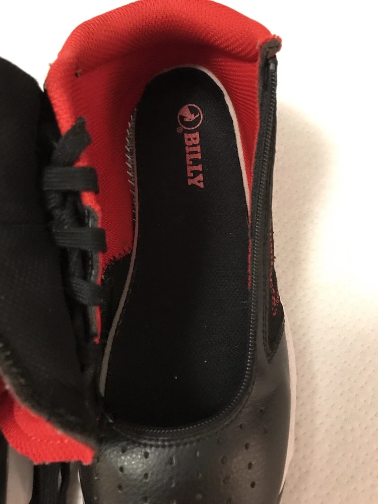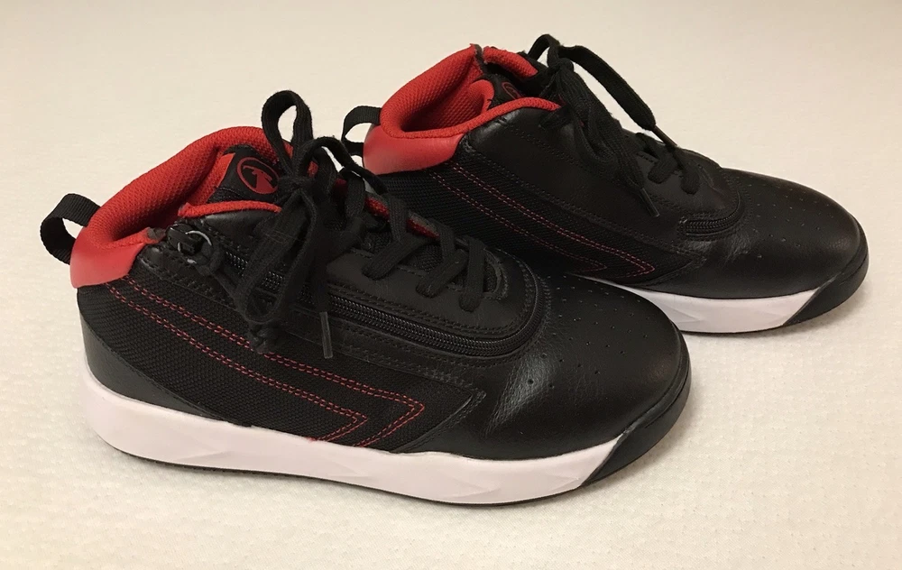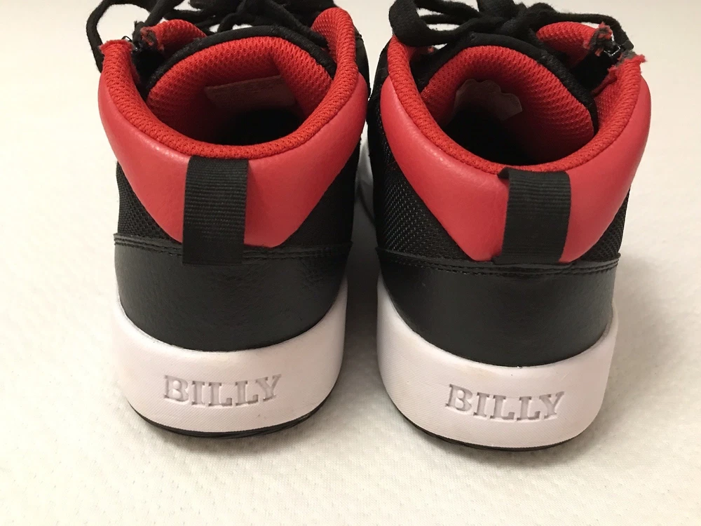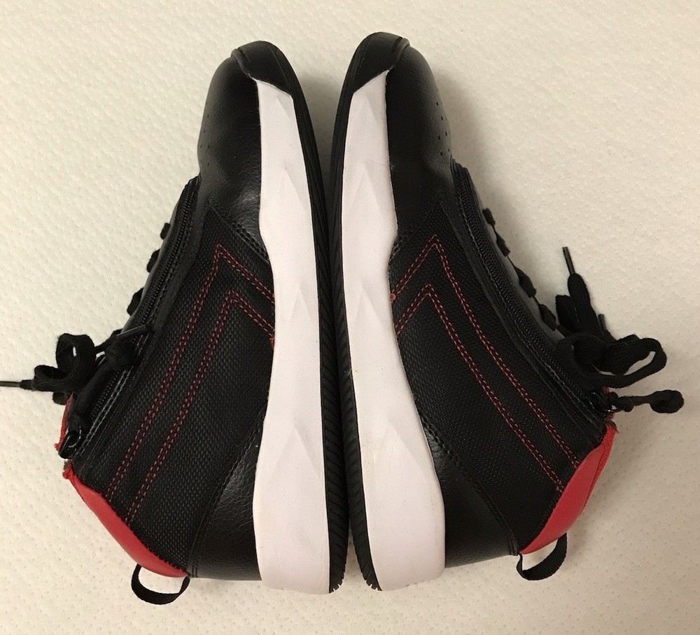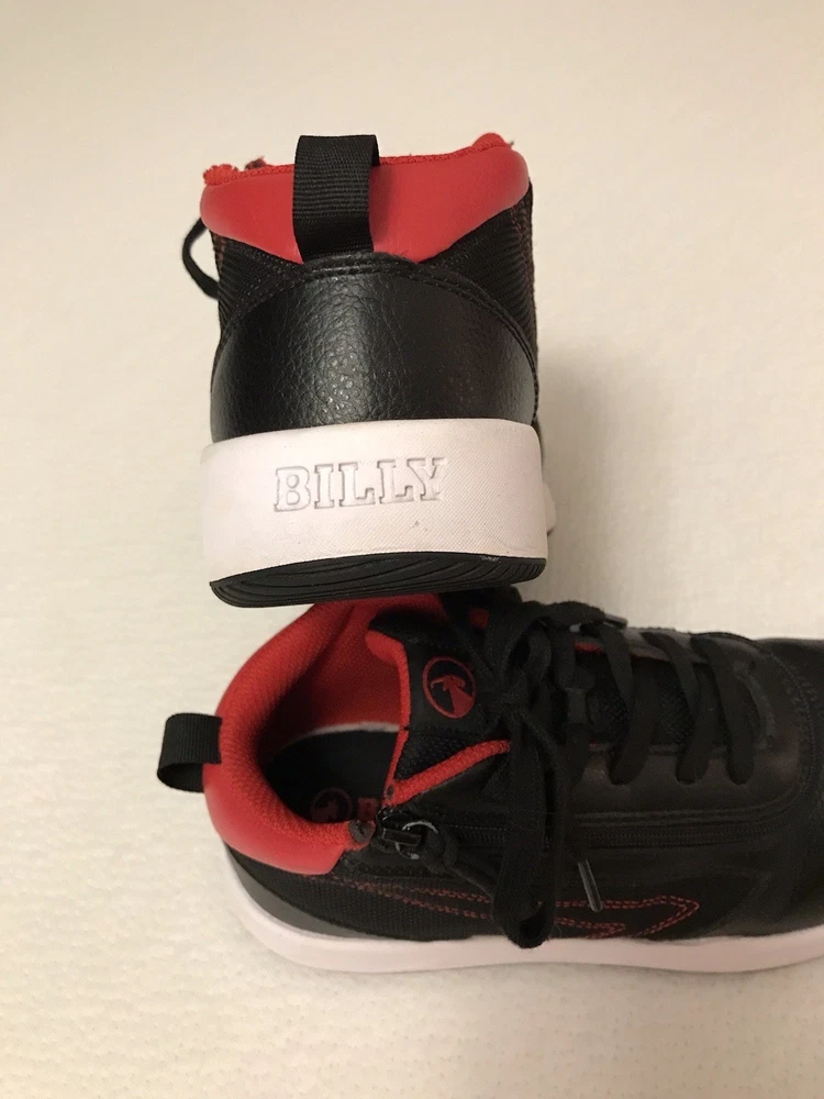 The Billy Sport Hoop Kids 5 Wide Sneaker Shoe in black and red is a versatile and comfortable athletic shoe for boys or girls. Featuring a zip closure for easy wear, a mid-top style for added support, and a rubber outsole for durability, these sneakers are perfect for various activities such as sports, hiking, and running. The vegan construction and removable insole provide added comfort and sustainability, making them a stylish choice for everyday wear. Whether it's for school, playtime, or travel, the Billy Sport Hoop sneakers are a great option for active kids. In a smoke free home.